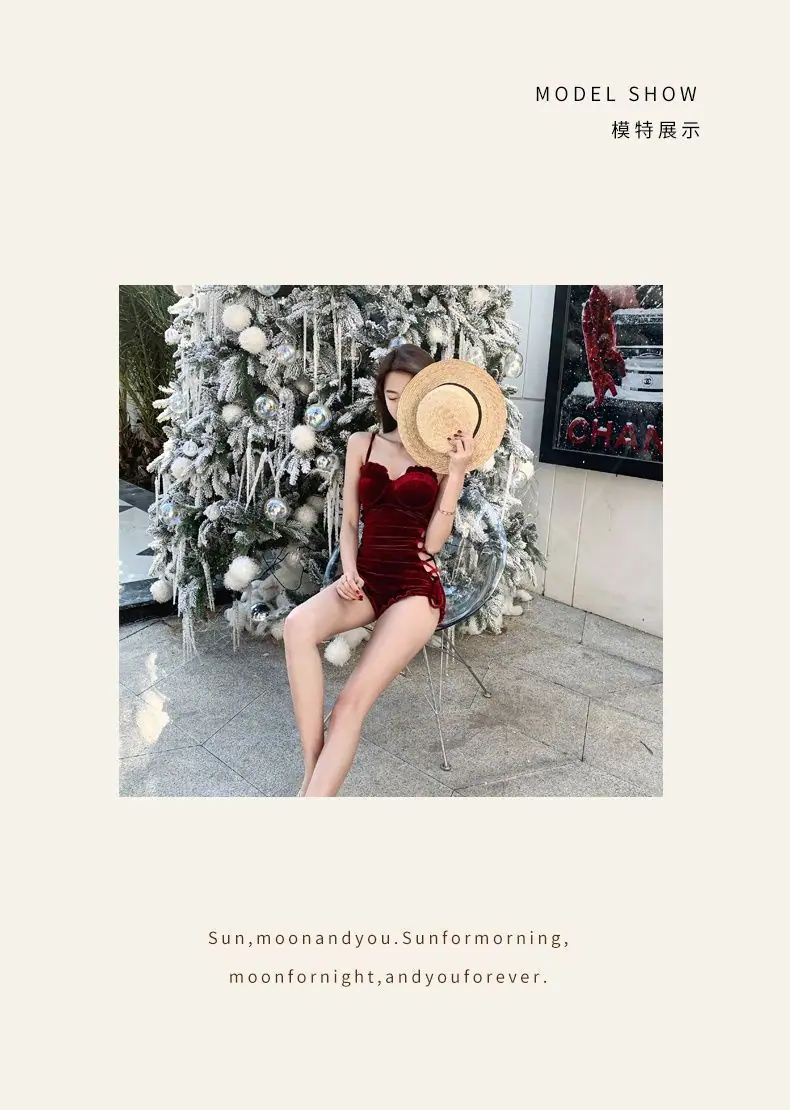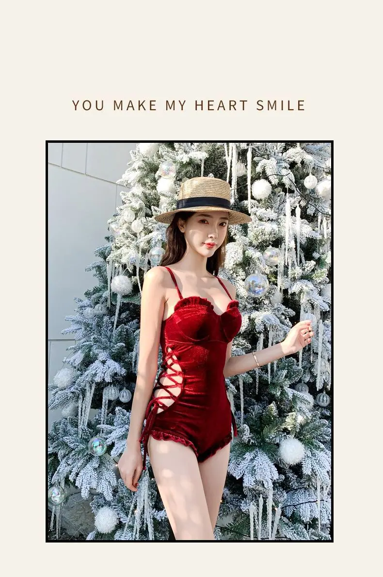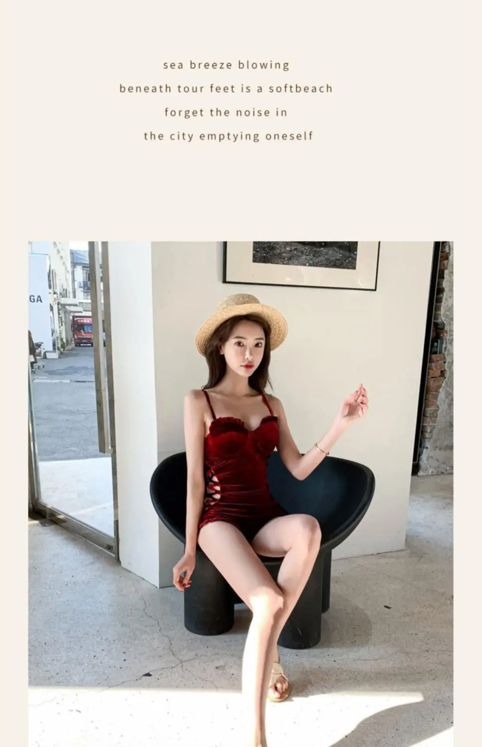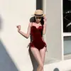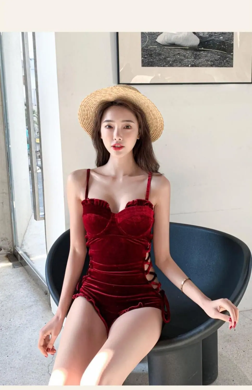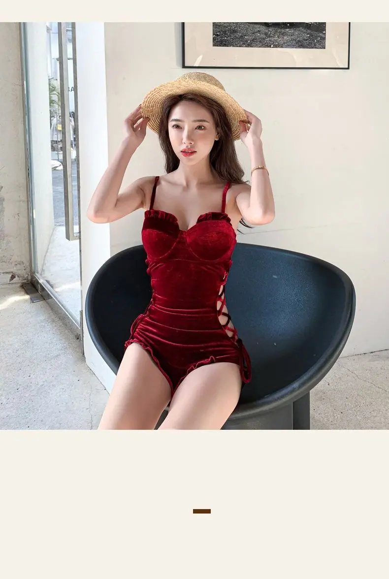 Traje de baño para mujer Verano 2022 Nuevo estilo Conservador Cubre vientre Adelgazante Sexy Tirantes Terciopelo Retro de una pieza Traje de baño para aguas termales