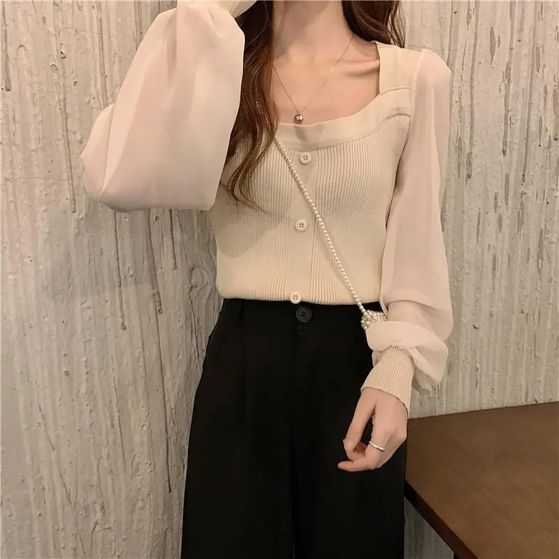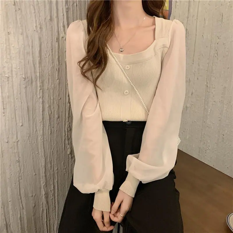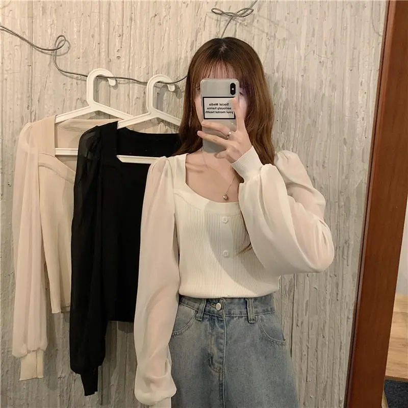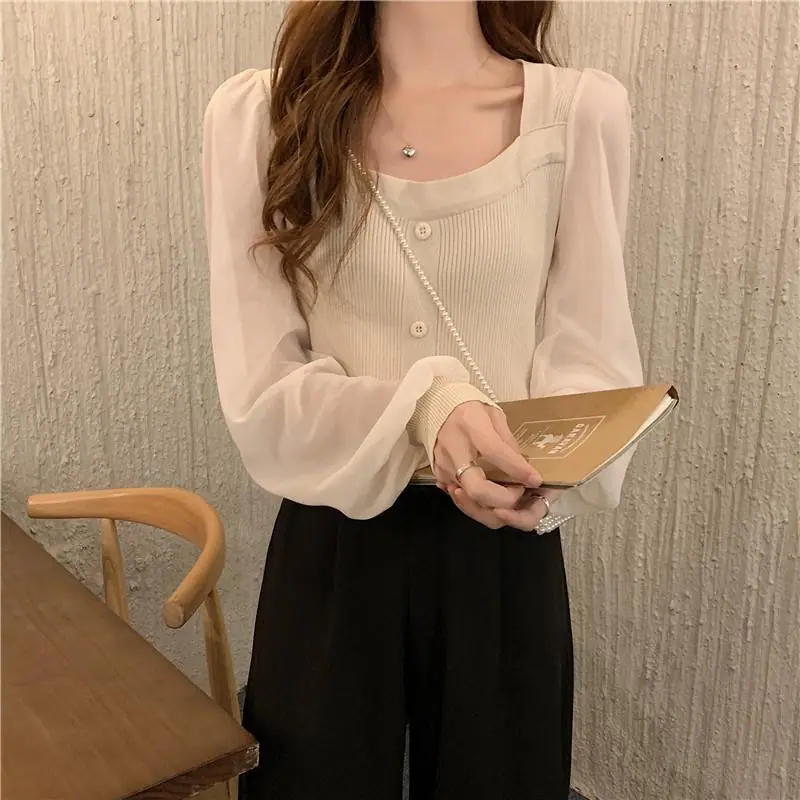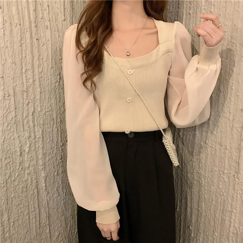 Suéter de Cuello Cuadrado y Manga Larga 2023 Otoño e Invierno Diseño de Estilo Francés Estilo Suave Nuevo Top de Manga Corta Abullonada para Mujer