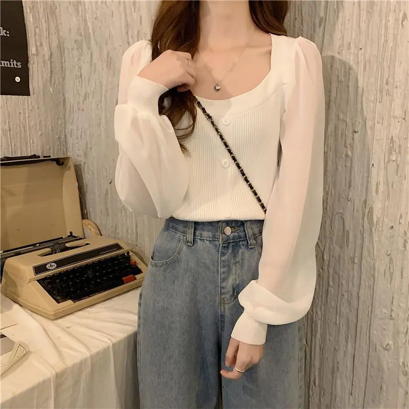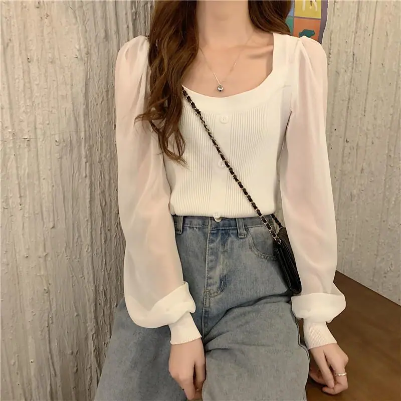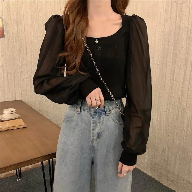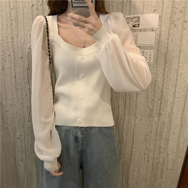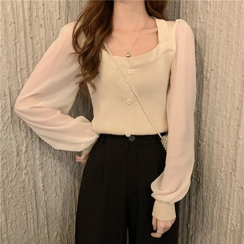 Suéter de Cuello Cuadrado y Manga Larga 2023 Otoño e Invierno Diseño de Estilo Francés Estilo Suave Nuevo Top de Manga Corta Abullonada para Mujer