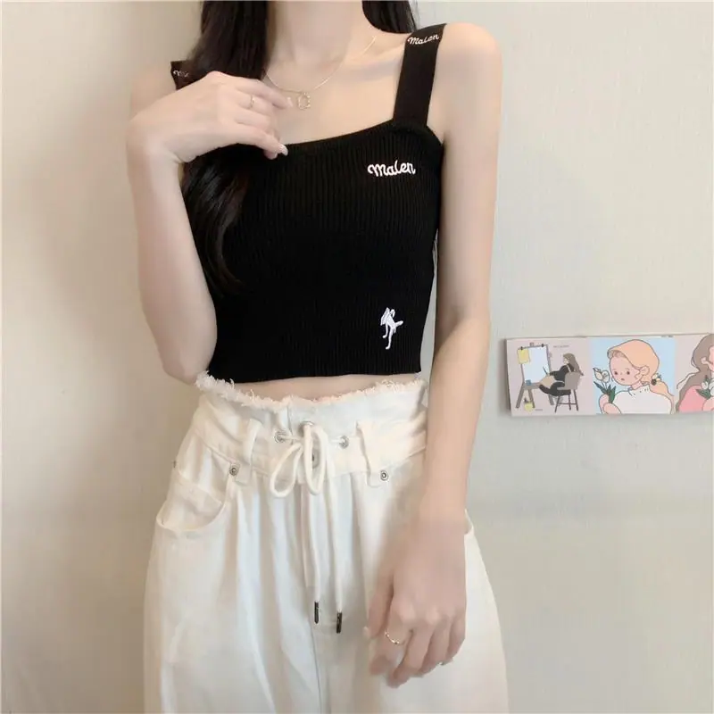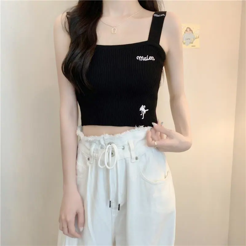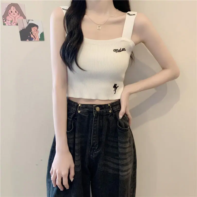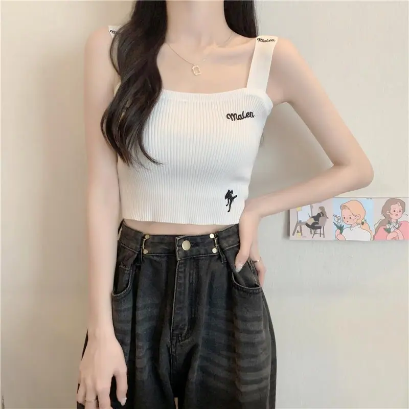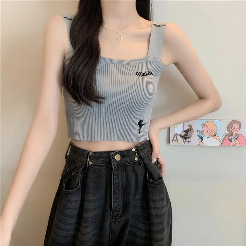 Camisola Bordada con Letras Verano 2023 Estilo Coreano Ropa Exterior Dulce Caliente Sin Mangas para Mujer Top Corto Tejido Base Interior