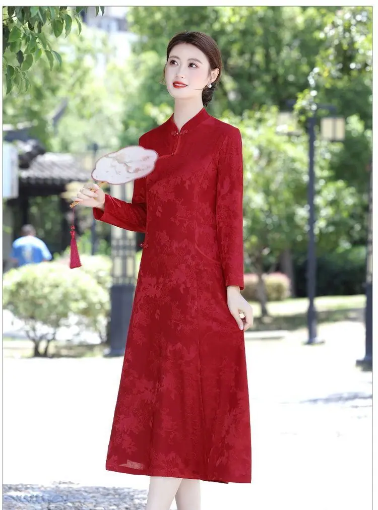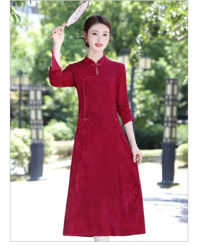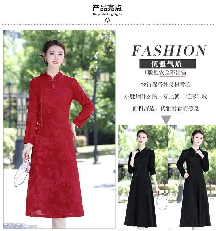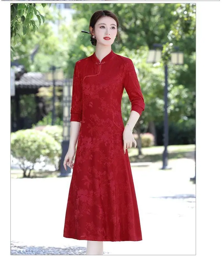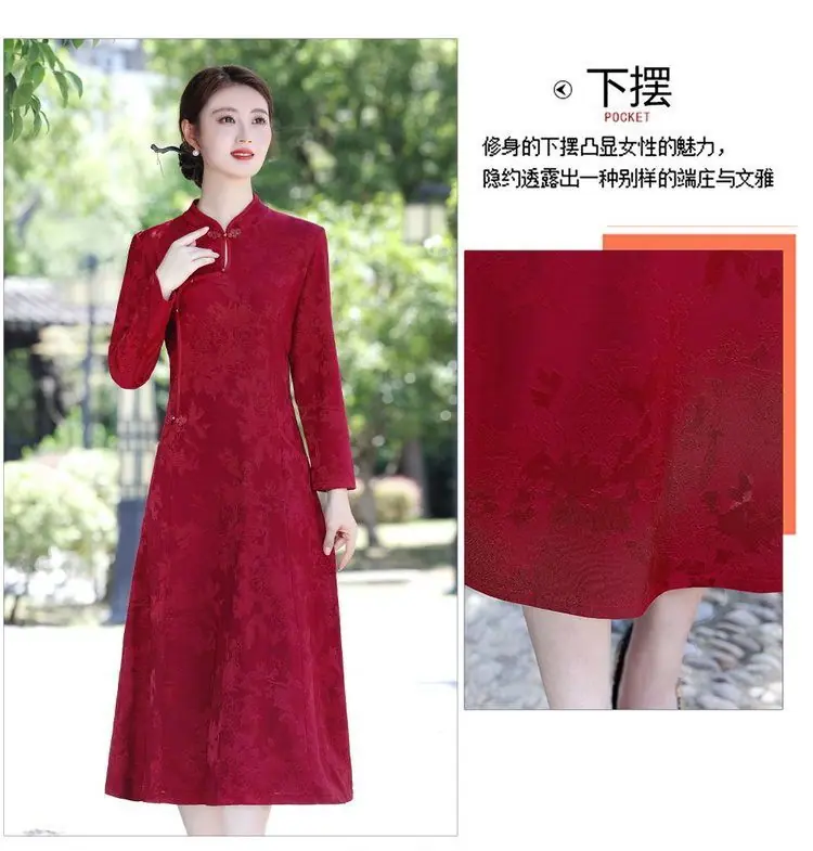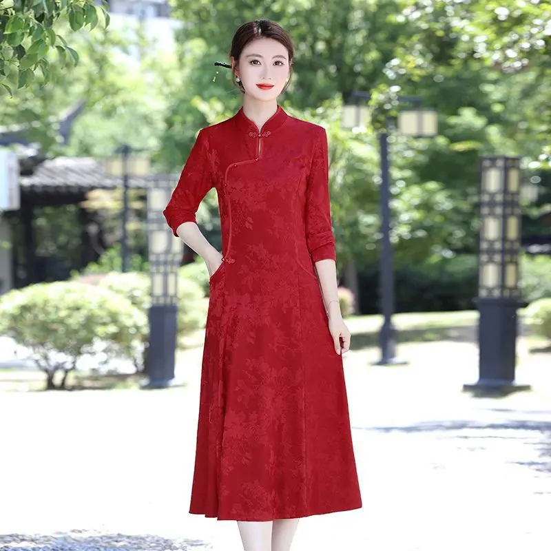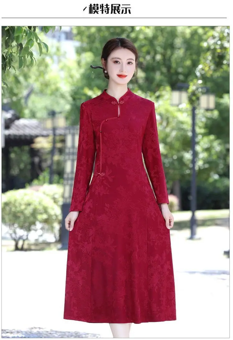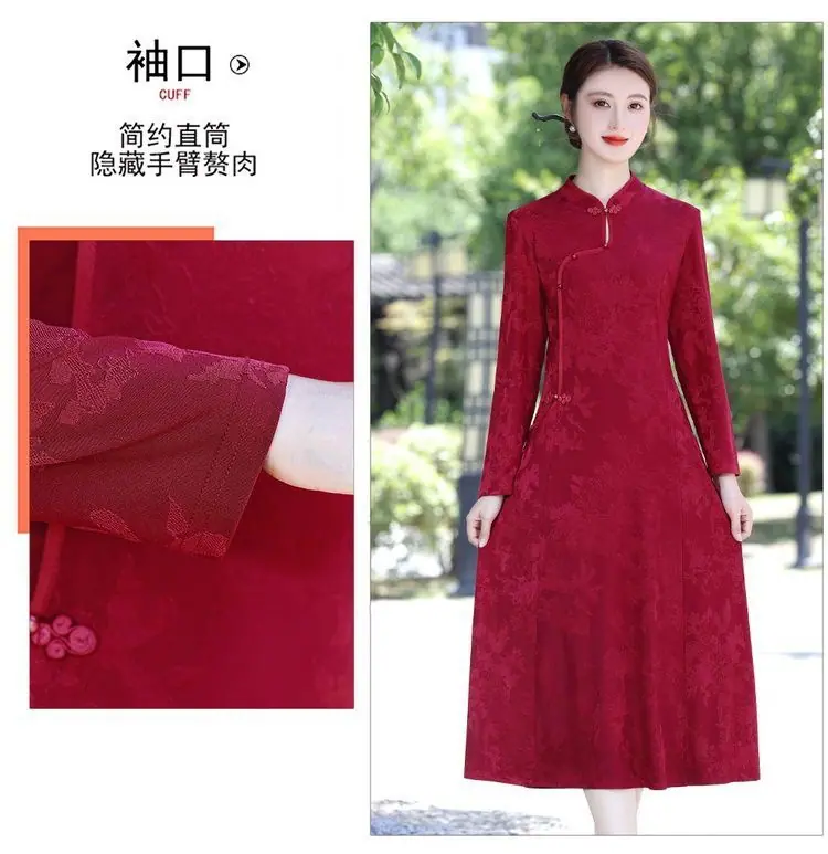 Vestido cheongsam para madre de mediana edad primavera y otoño temperamento 2025 nuevo vestido cheongsam mejorado de manga larga jacquard vestido adelgazante