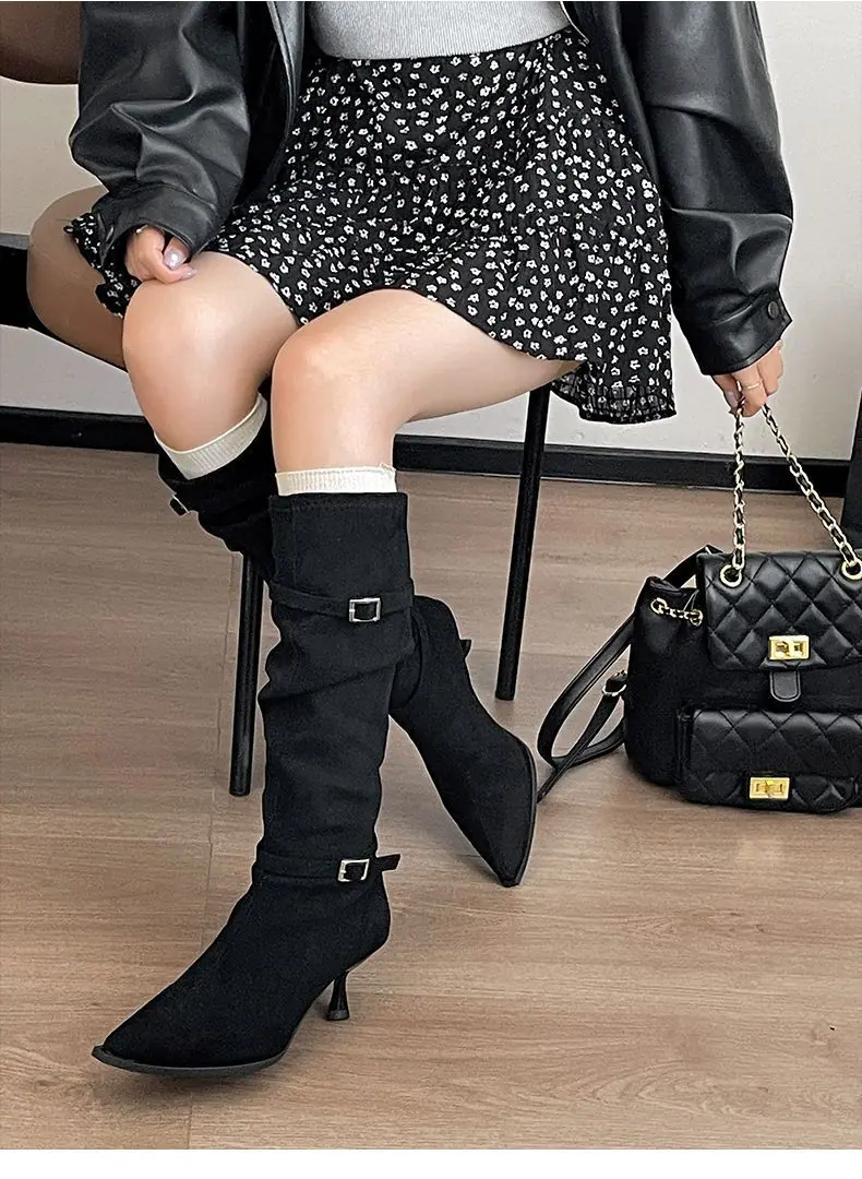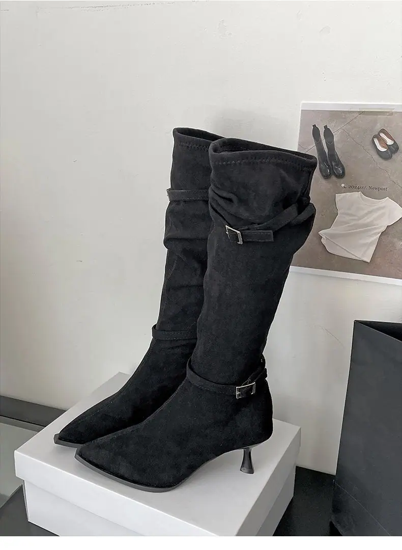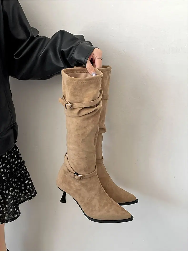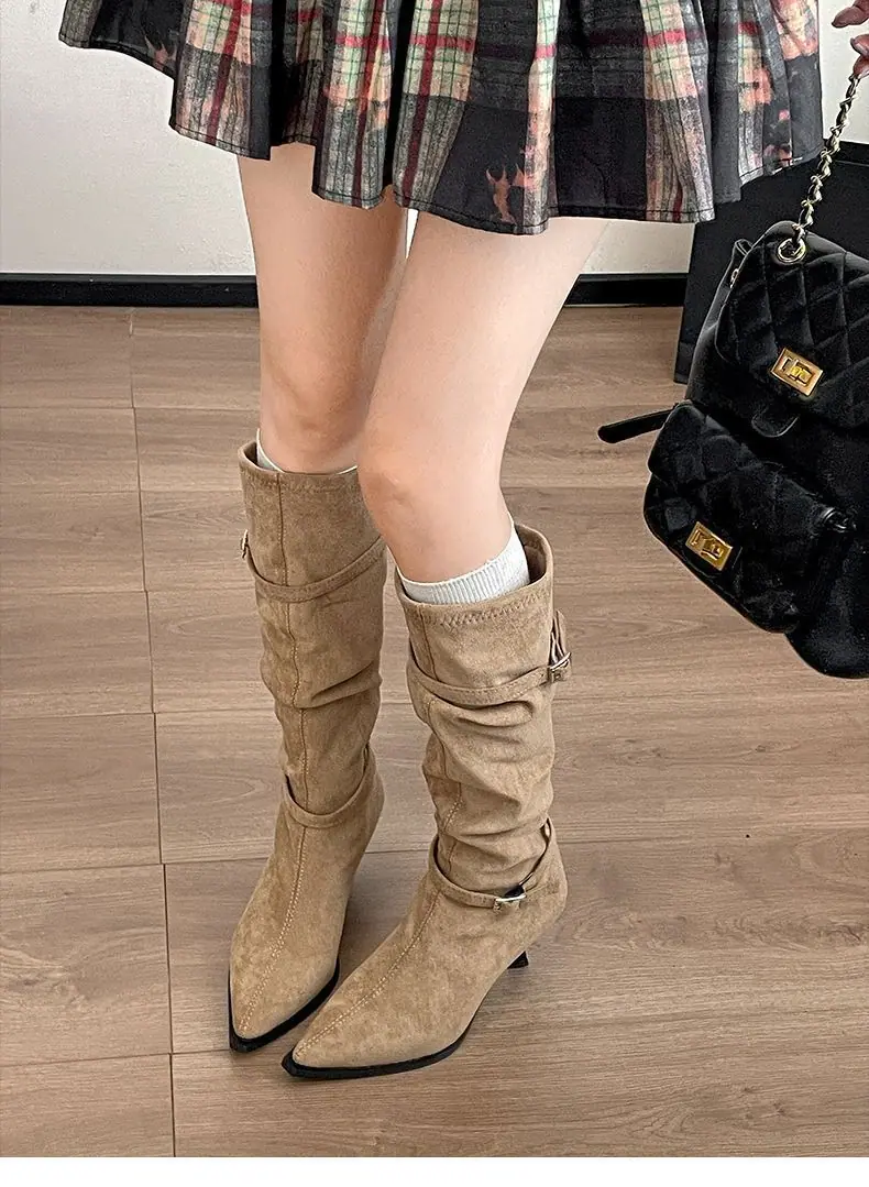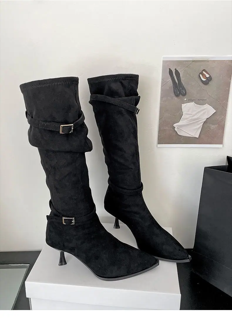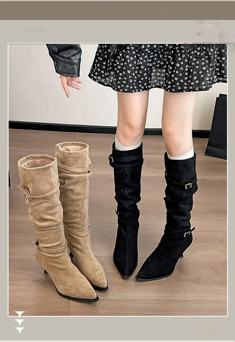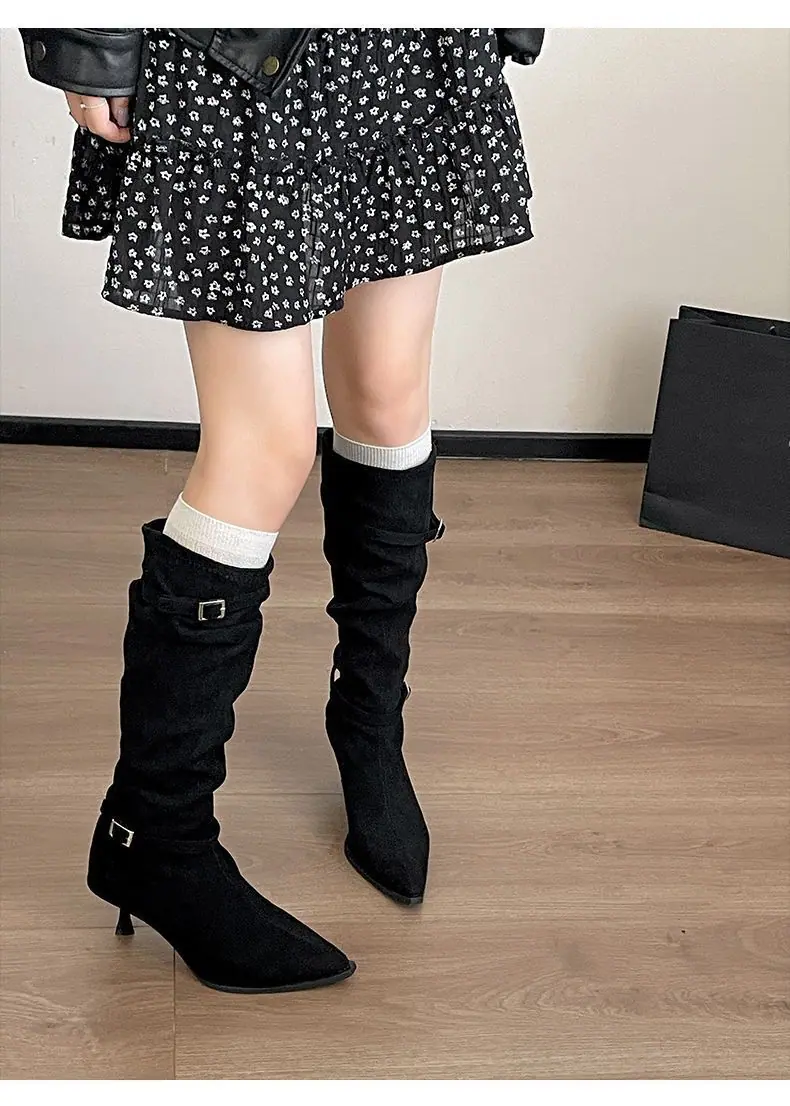 2025 Otoño/Invierno Nuevo Estilo con Falda Botas de Caballero Adelgazantes Estilo Británico Vintage Botas de Tacón de Aguja Punta Afilada Botas hasta la Rodilla para Mujer