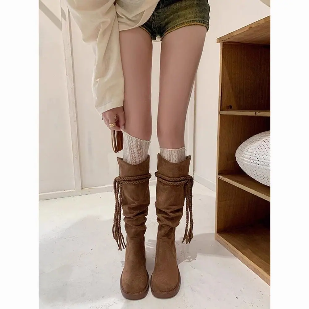 Botas de Tacón Grueso de Moda Apiladas Mujer 2025 Primavera y Otoño Nuevo Retro Borla Tubo Alto Sobre la Rodilla Botas Largas para Dama