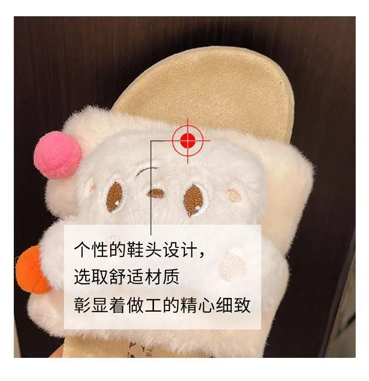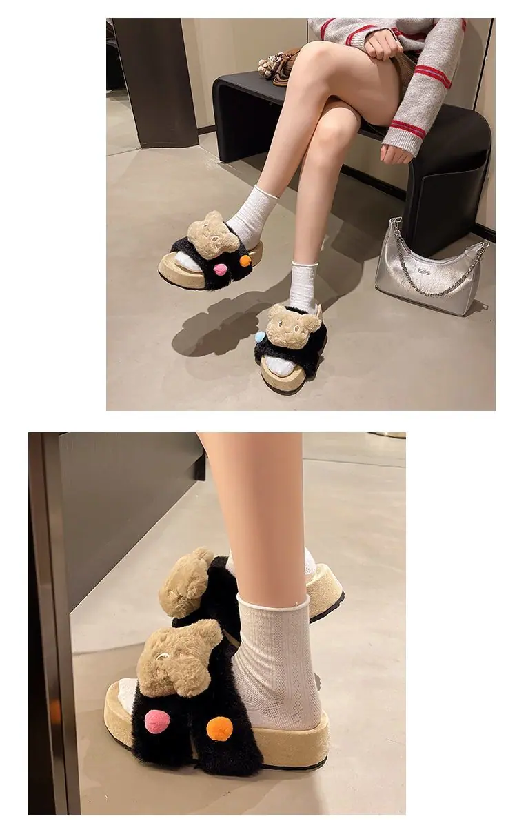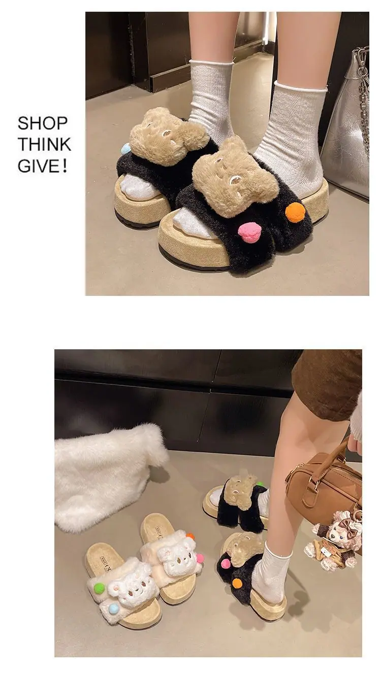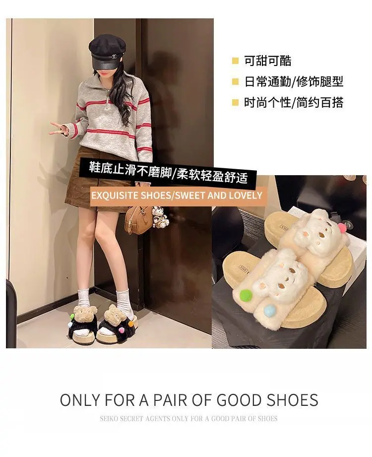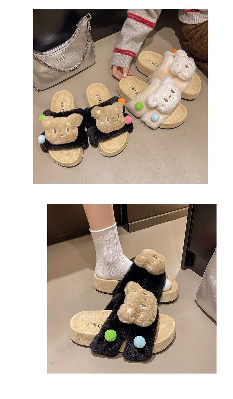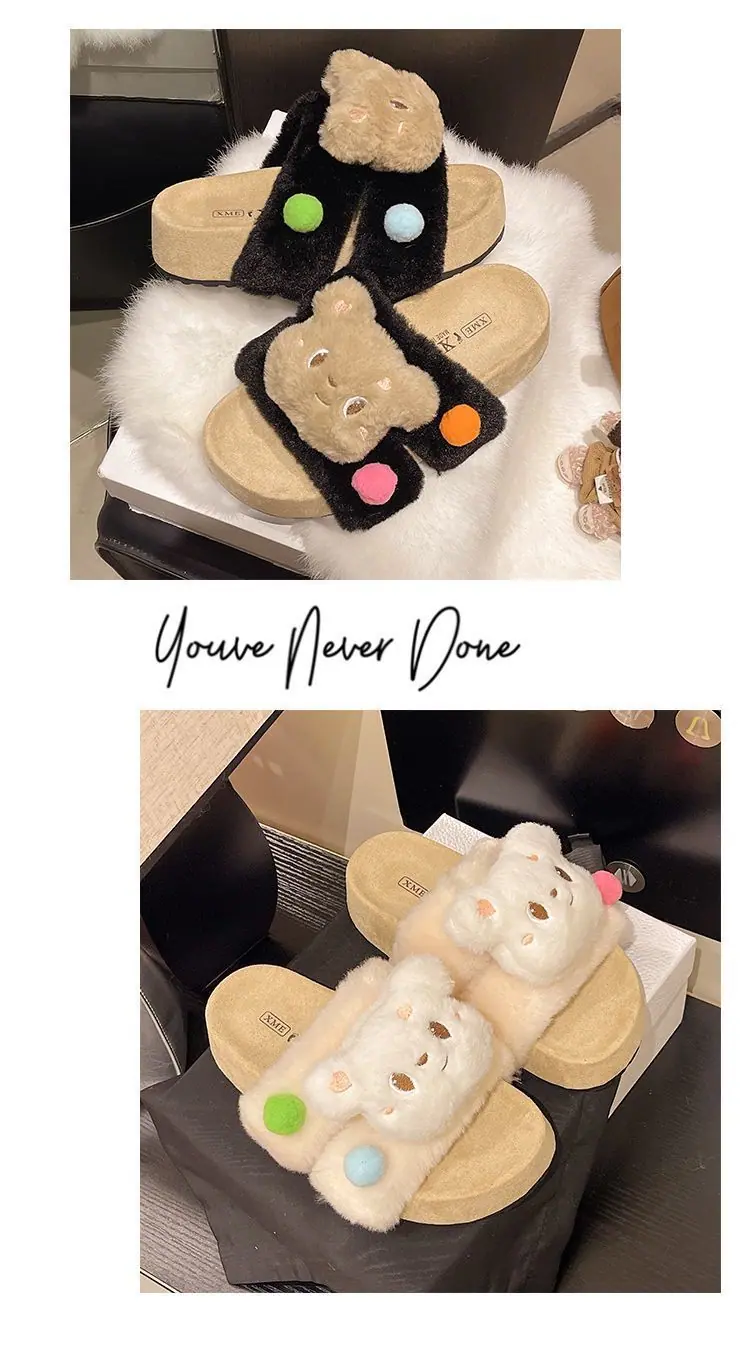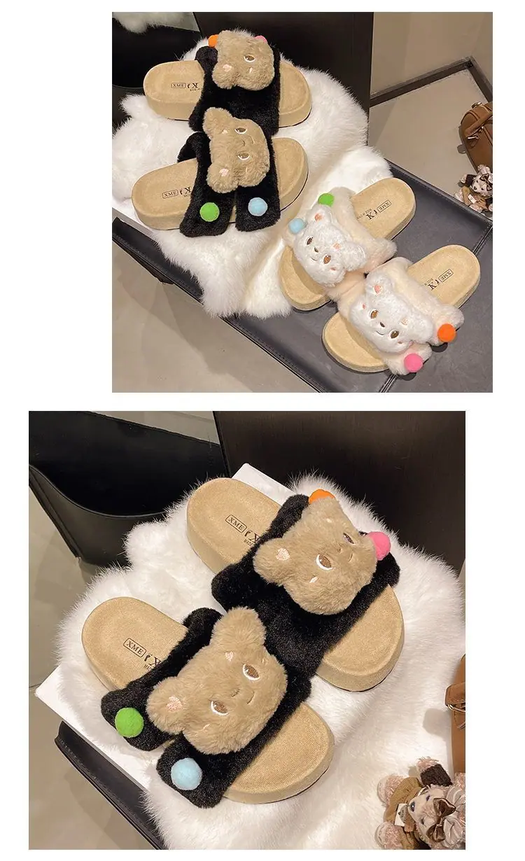 Pantuflas de Algodón Cómodas para el Hogar Lindo Oso de Dibujos Animados Pantuflas Peludas Ropa de Exterior para Mujer 2025 Otoño/Invierno Nuevo Casual Perezoso