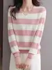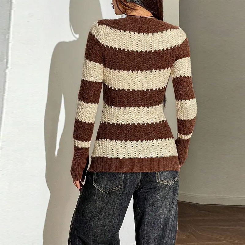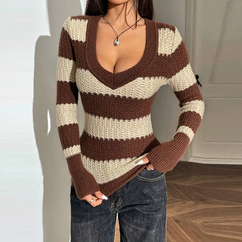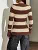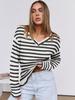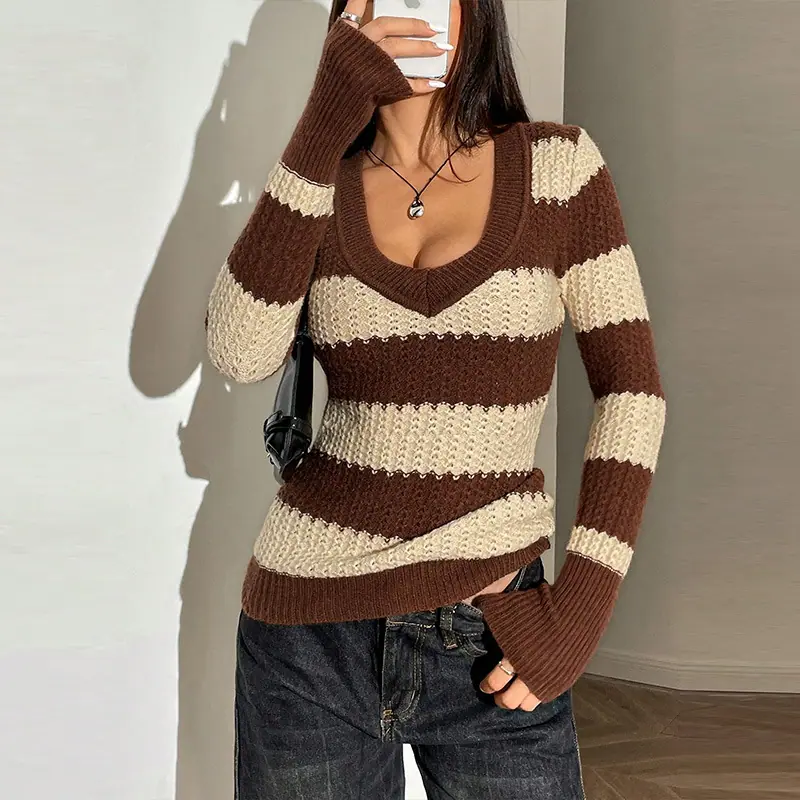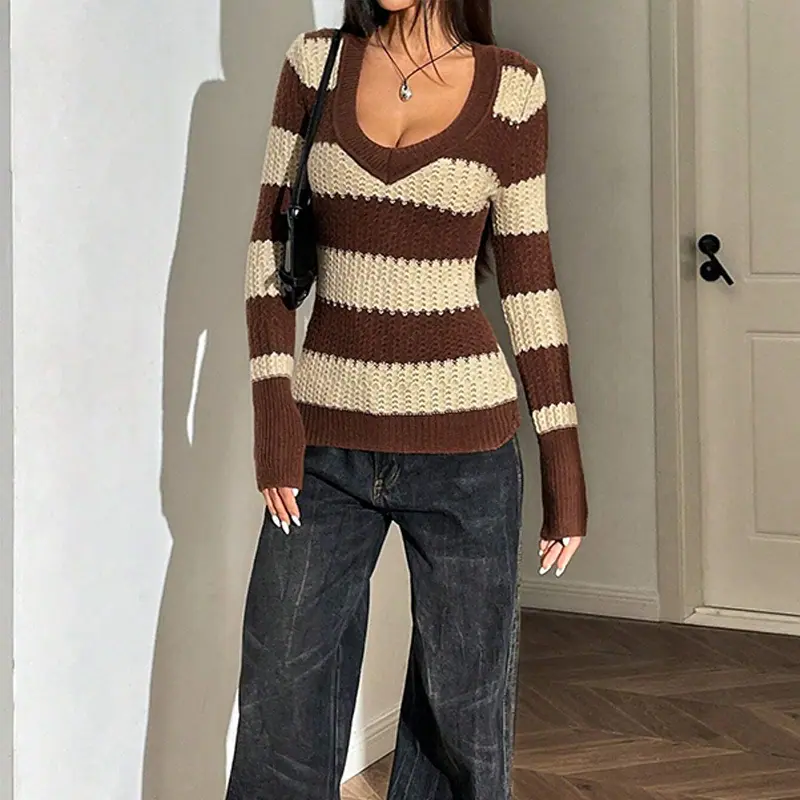 Suéter de Punto de Manga Larga para Mujer, Nuevo Otoño/Invierno 2025 Europeo y Americano, Moda Casual Versátil a Rayas con Cuello en V, Bloque de Color, Ajustado