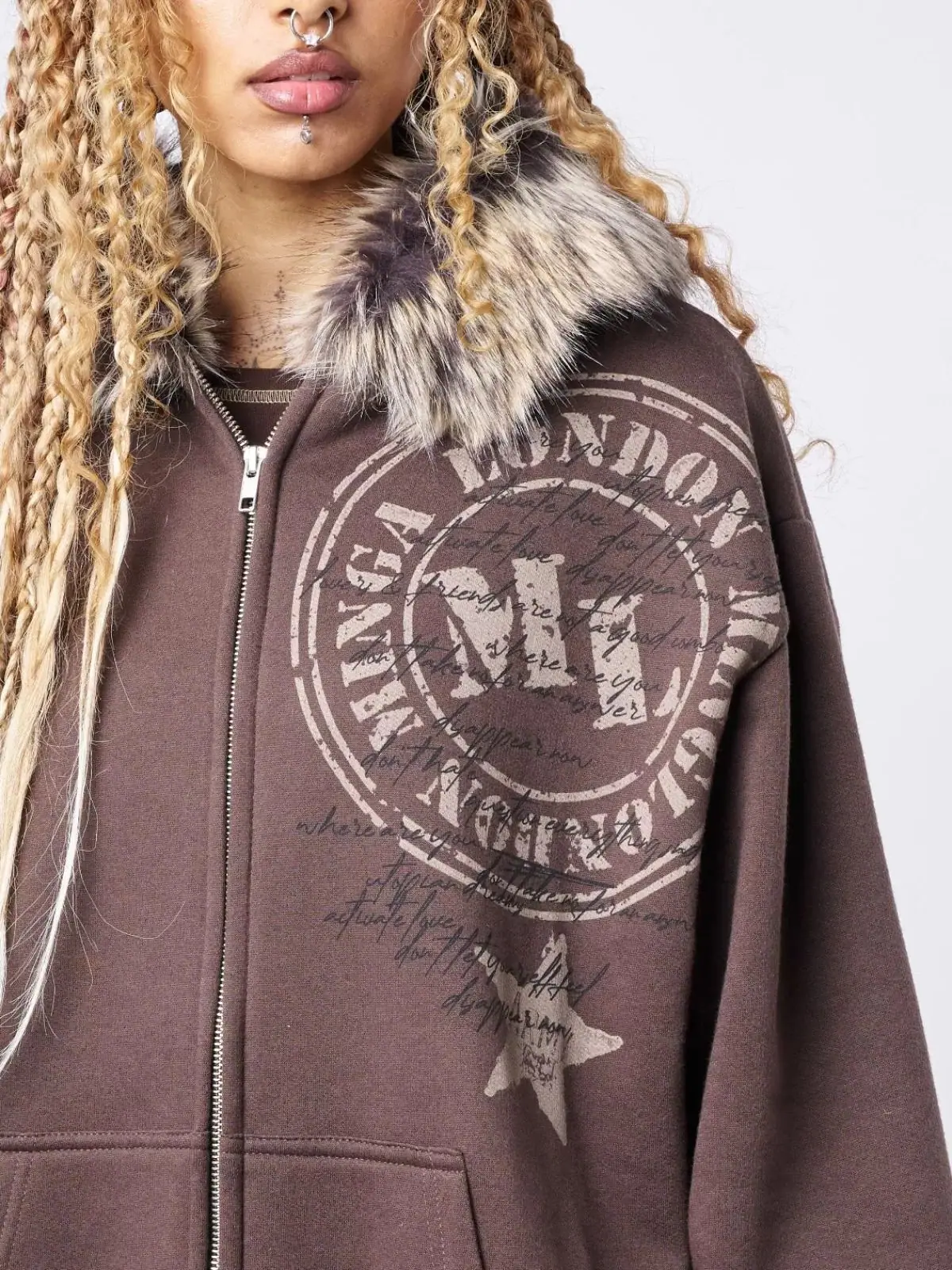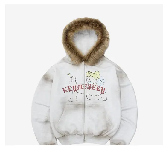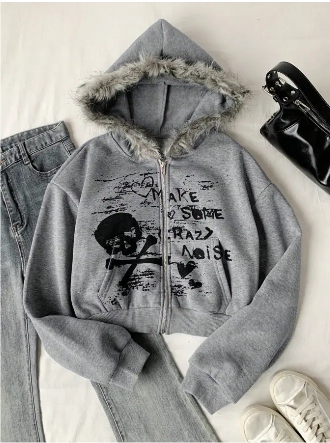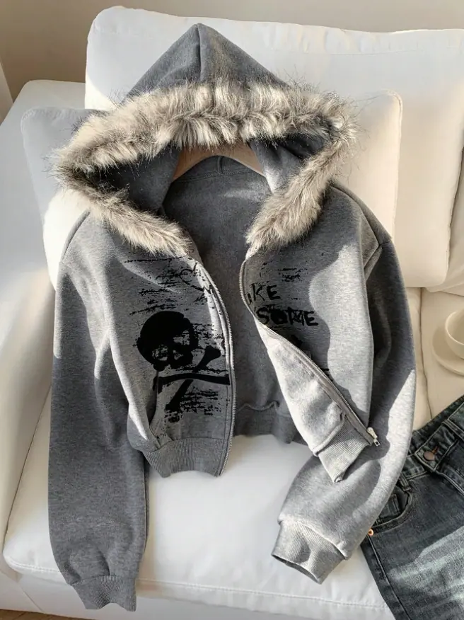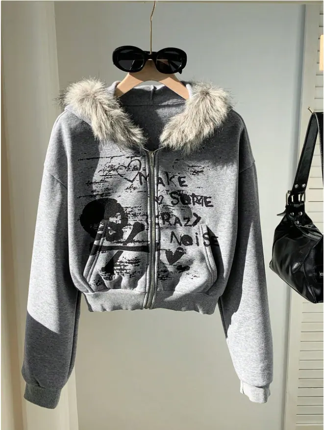 Sudadera con Capucha y Cremallera Estampada con Cuello de Piel Sintética al por Mayor Europea y Americana Jersey de Manga Larga Chaqueta Vintage Tendencia Urbana y2k al por Mayor