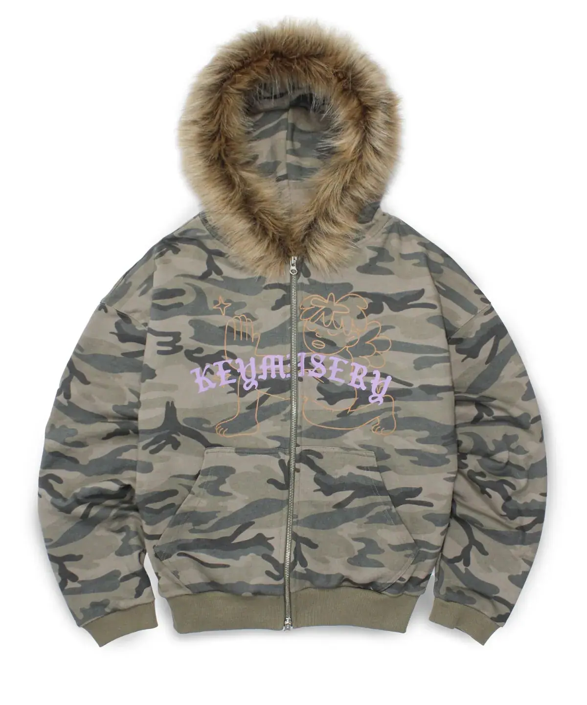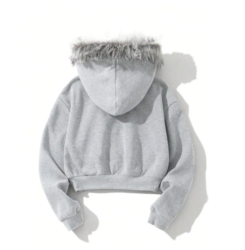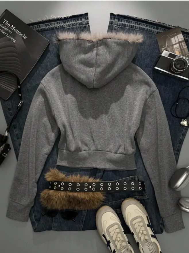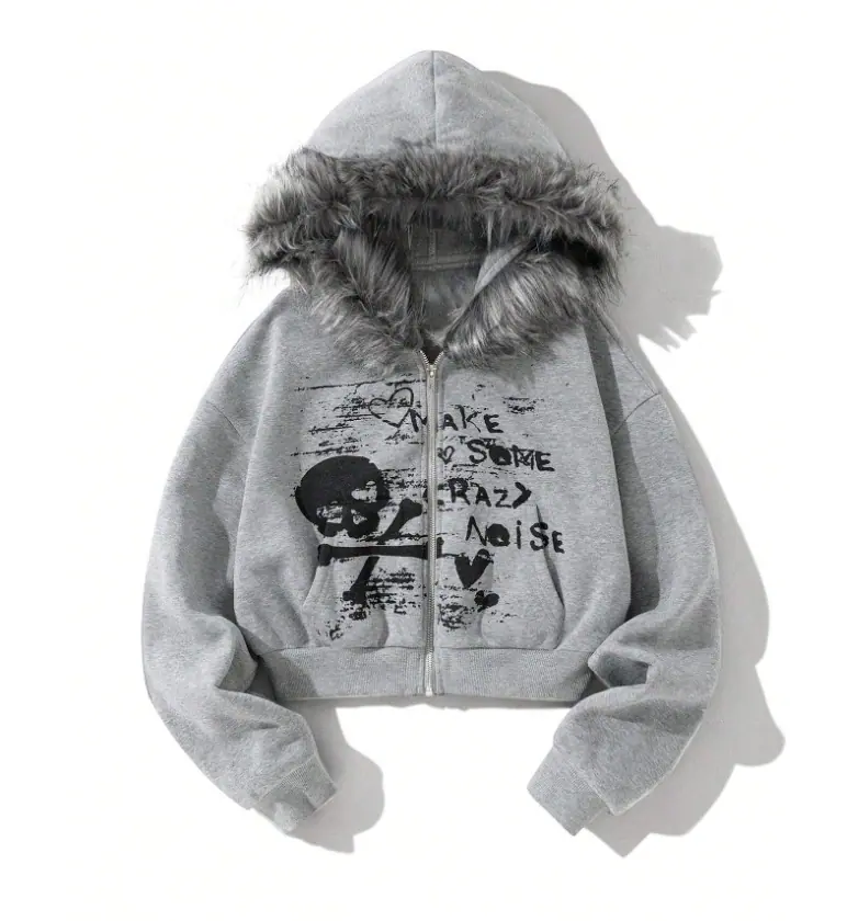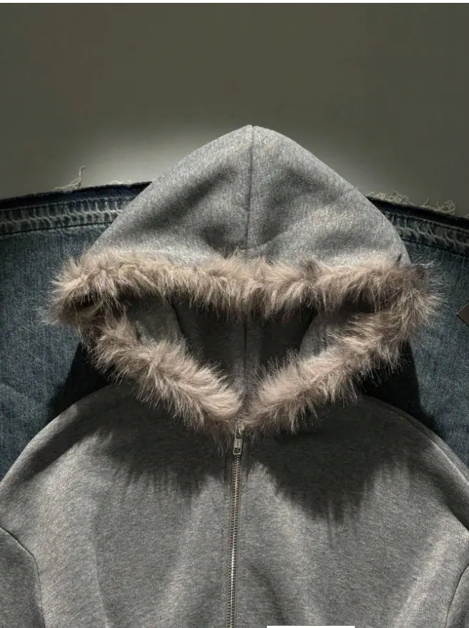 Sudadera con Capucha y Cremallera Estampada con Cuello de Piel Sintética al por Mayor Europea y Americana Jersey de Manga Larga Chaqueta Vintage Tendencia Urbana y2k al por Mayor