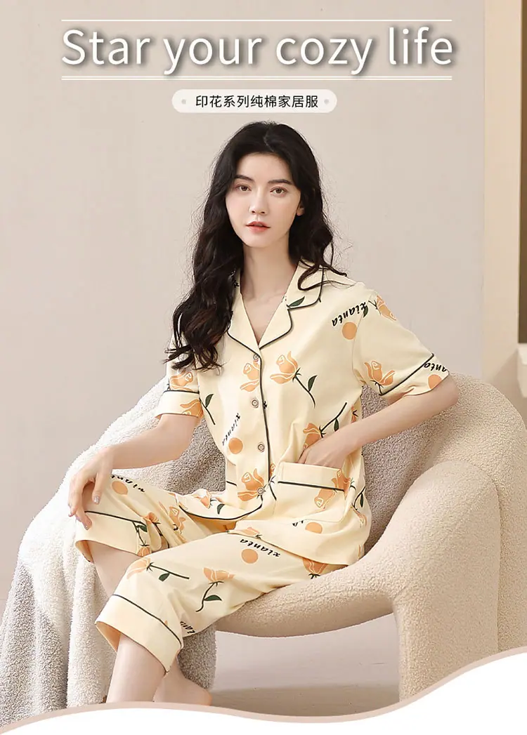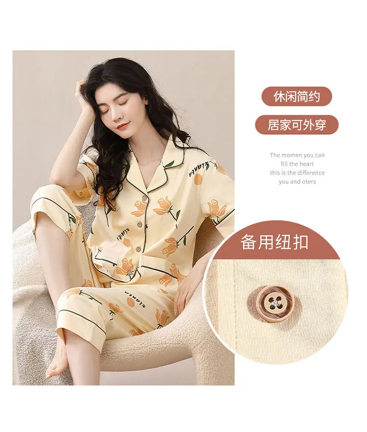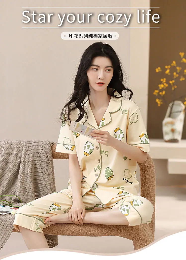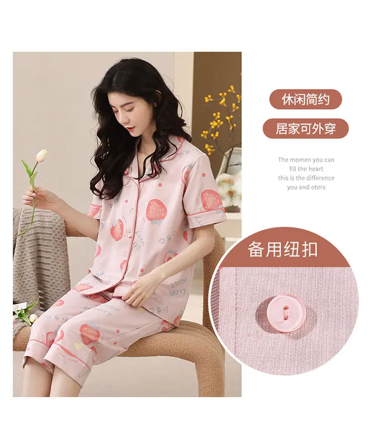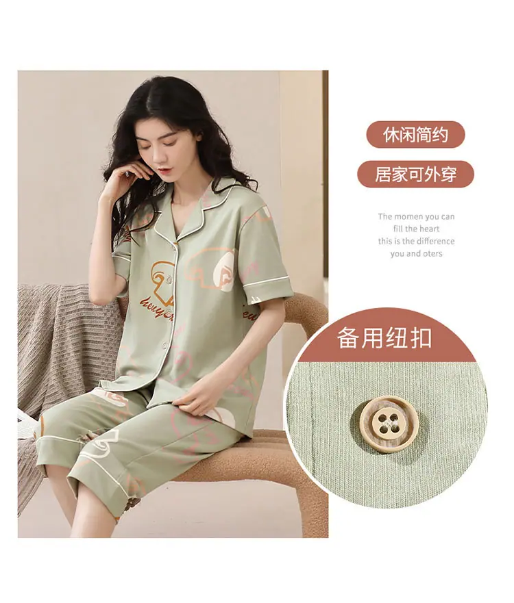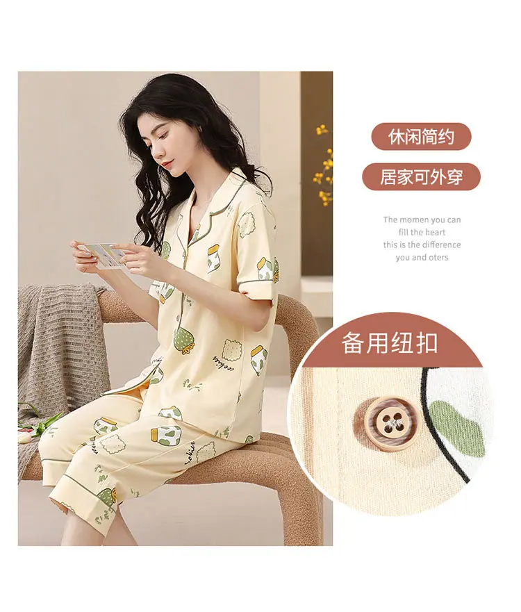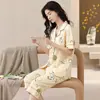 Pijama de algodón para mujer verano nuevo manga corta Nuevo pantalón capri delgado para exterior ropa de casa traje de verano