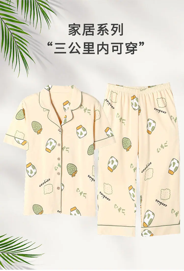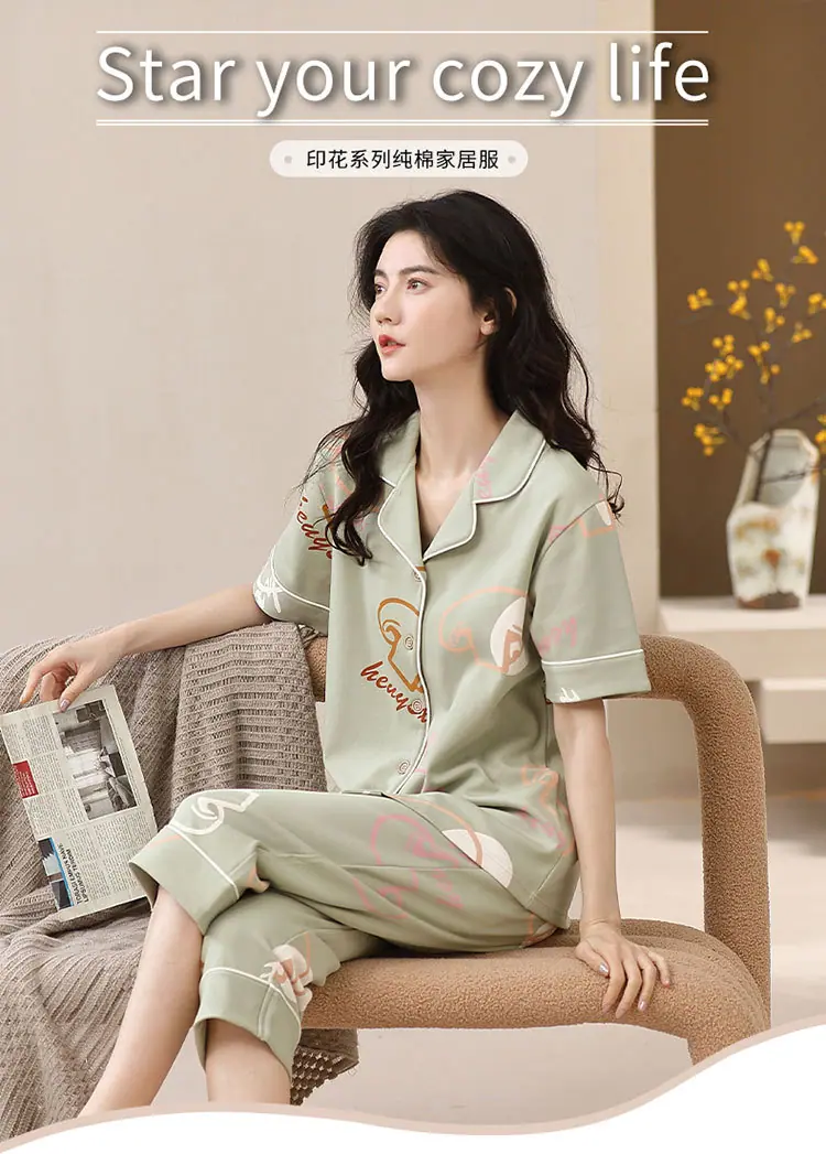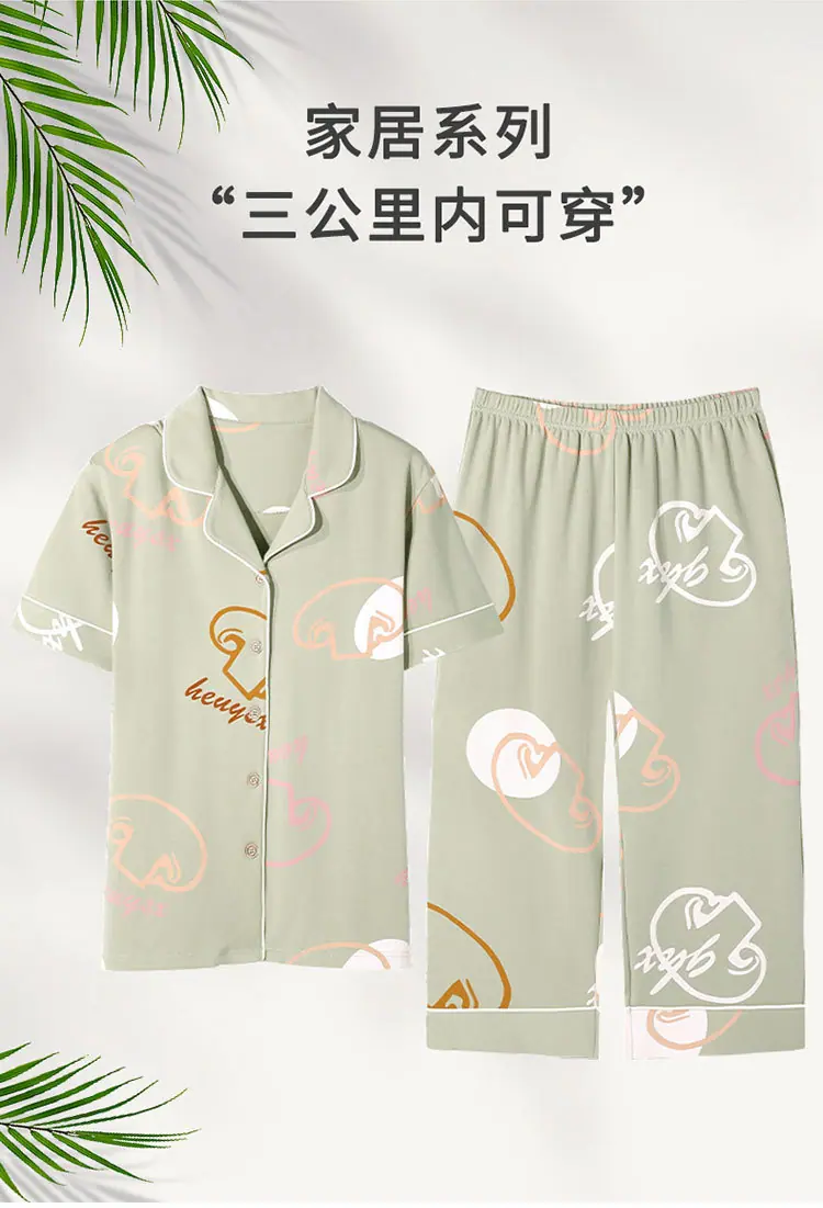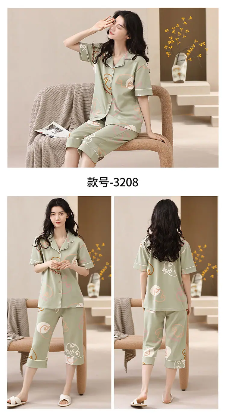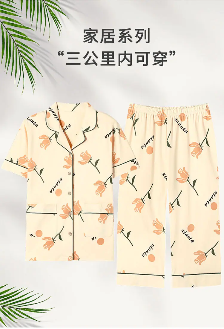 Pijama de algodón para mujer verano nuevo manga corta Nuevo pantalón capri delgado para exterior ropa de casa traje de verano