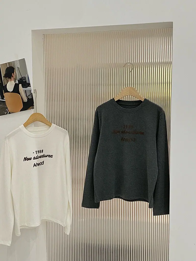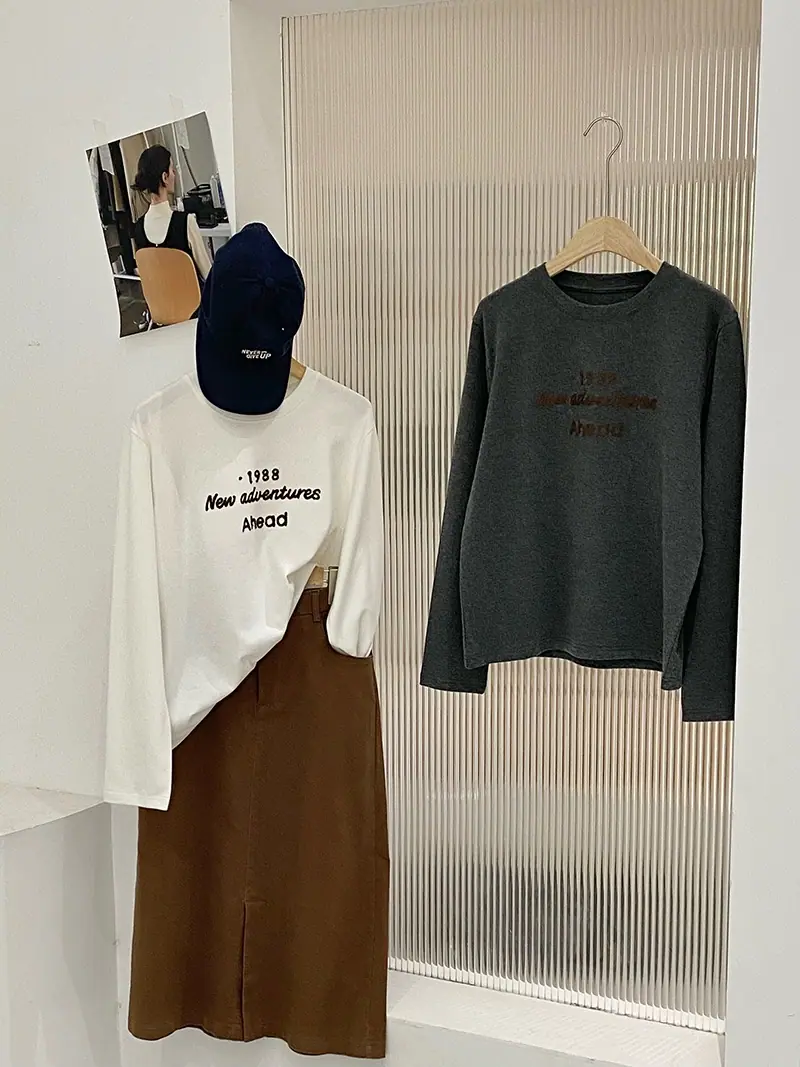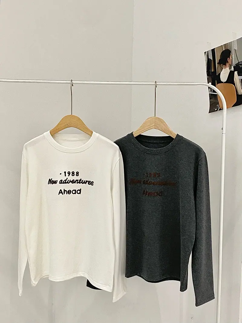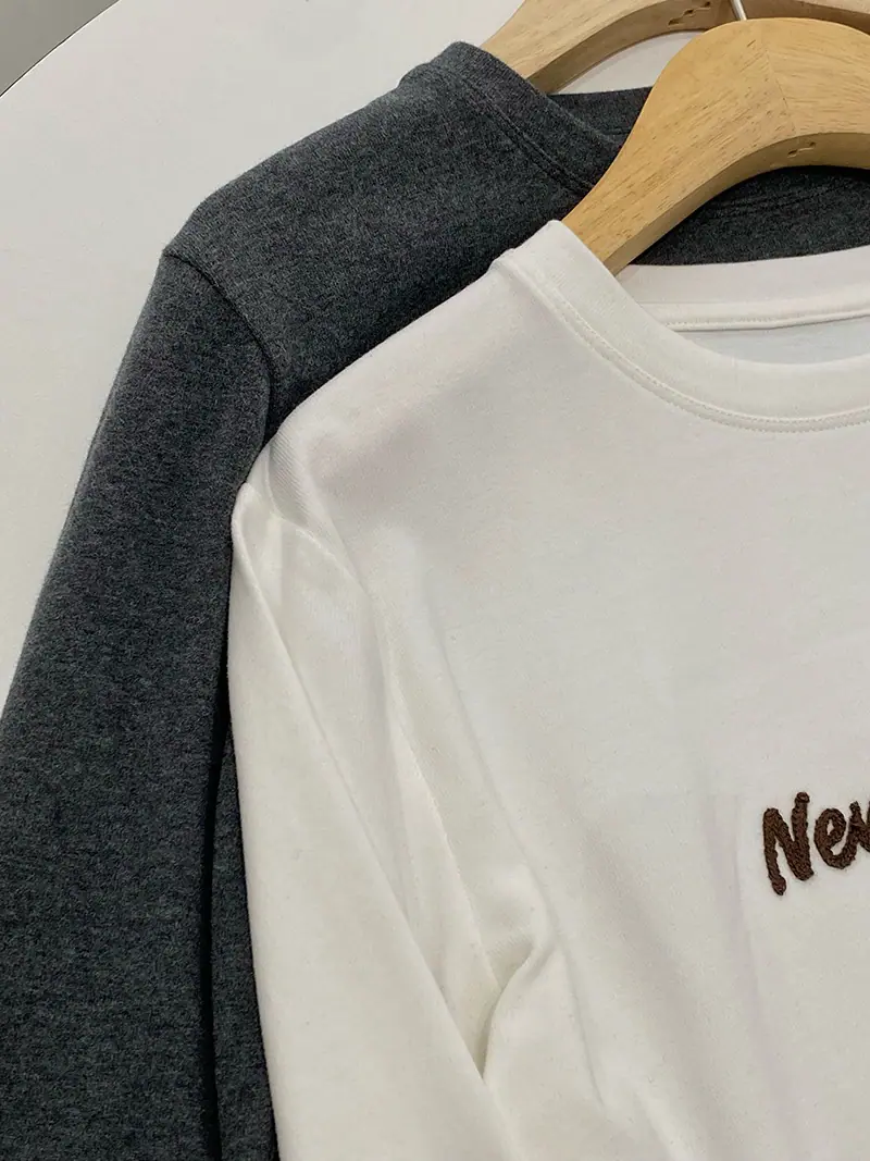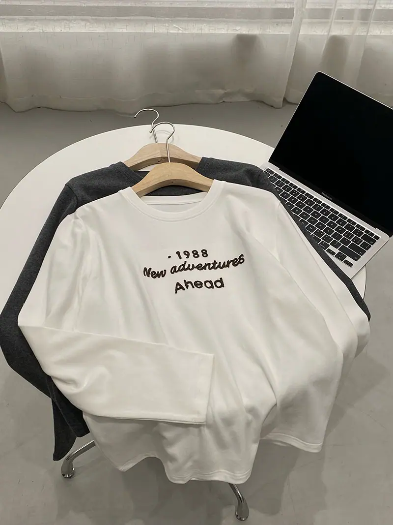 2025 Principios de Otoño Nuevo Estilo Coreano Adelgazante Versátil Cuello Redondo Bordado de Letras Manga Larga Camiseta Capa Base Top Mujer