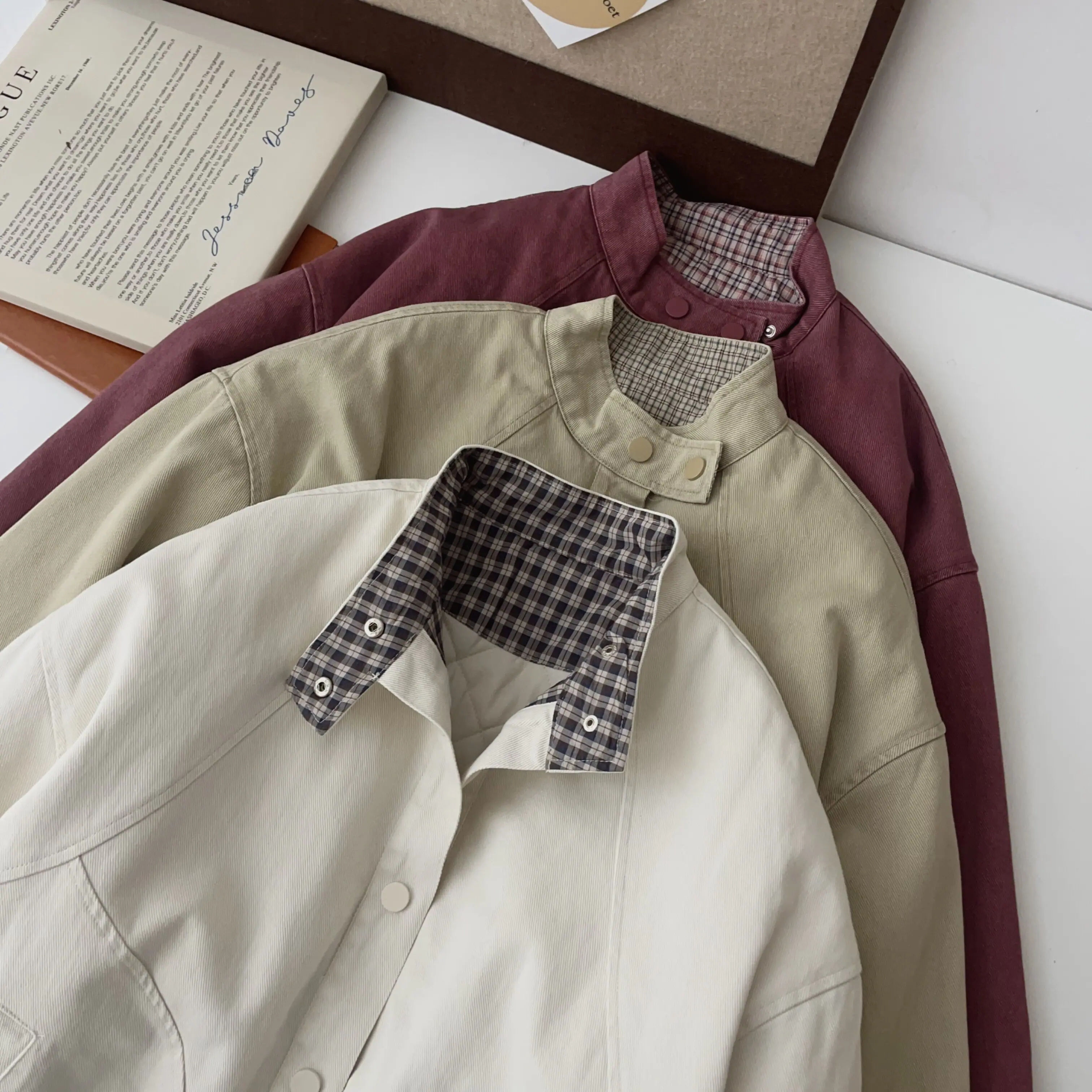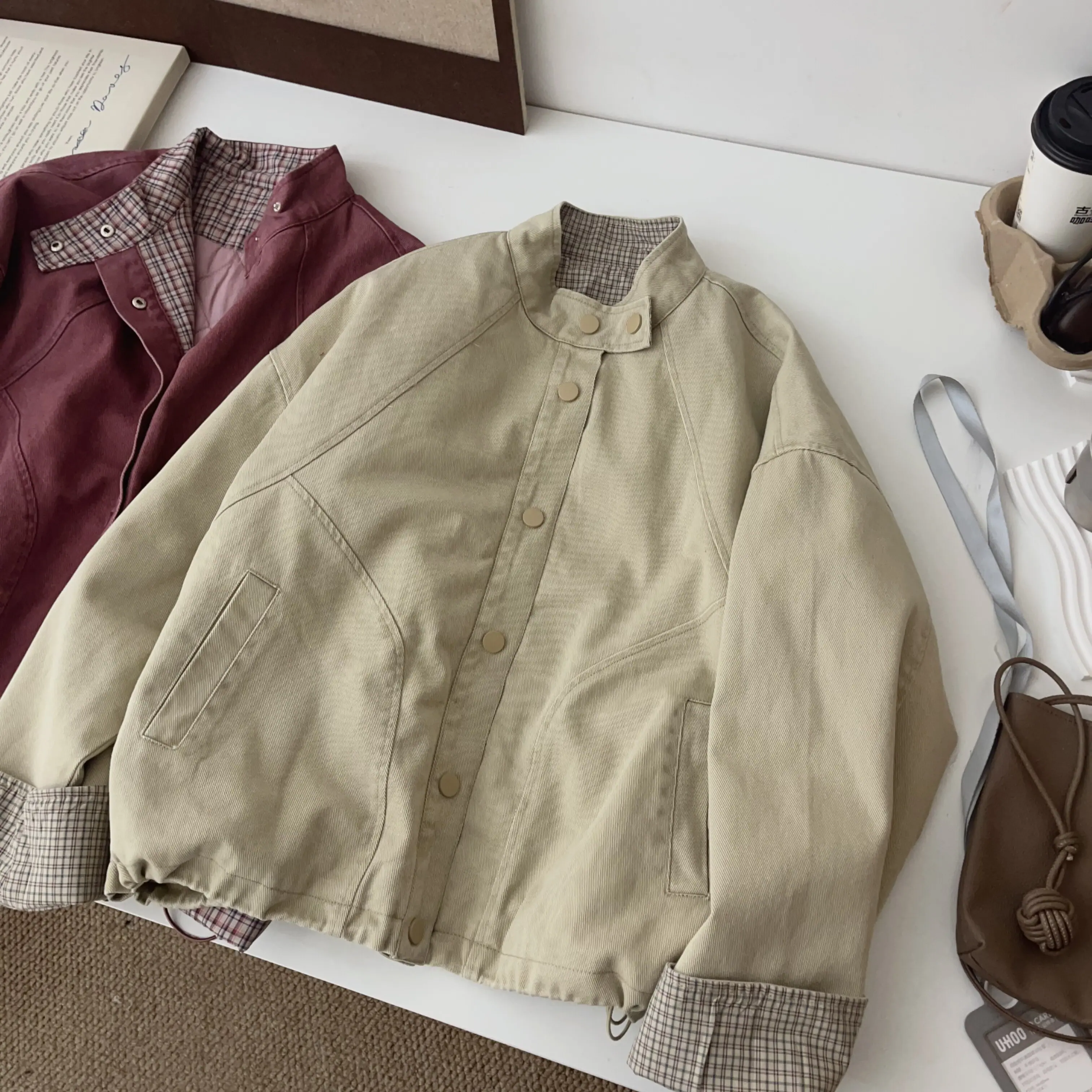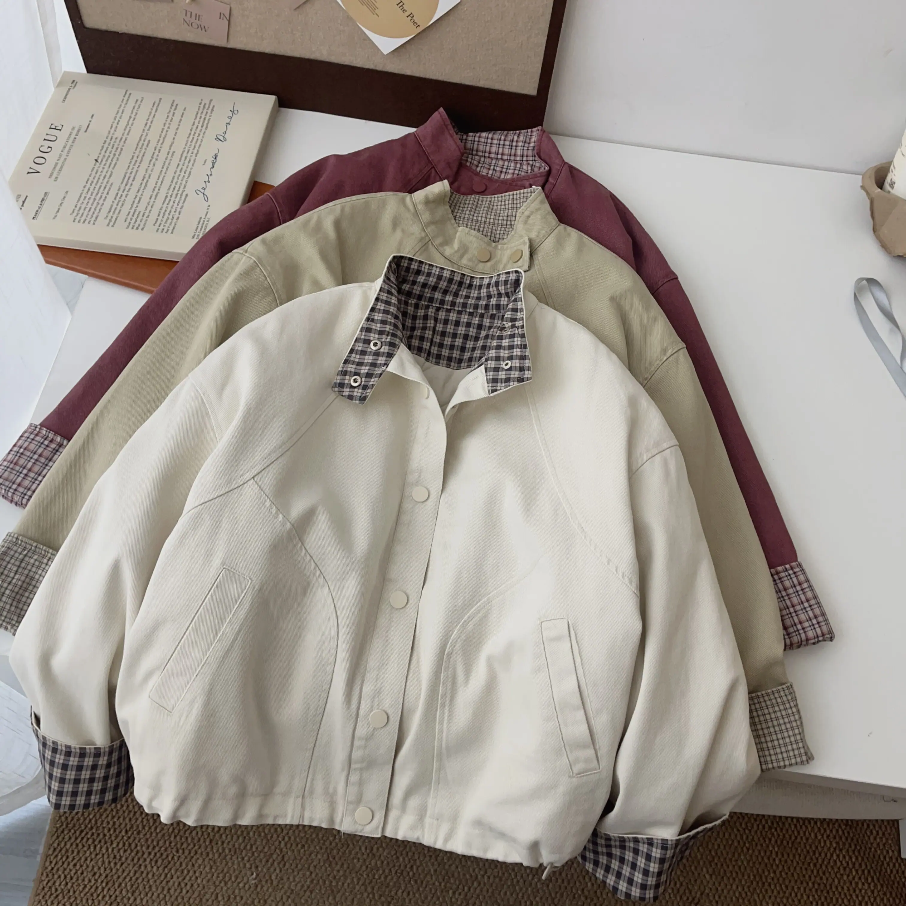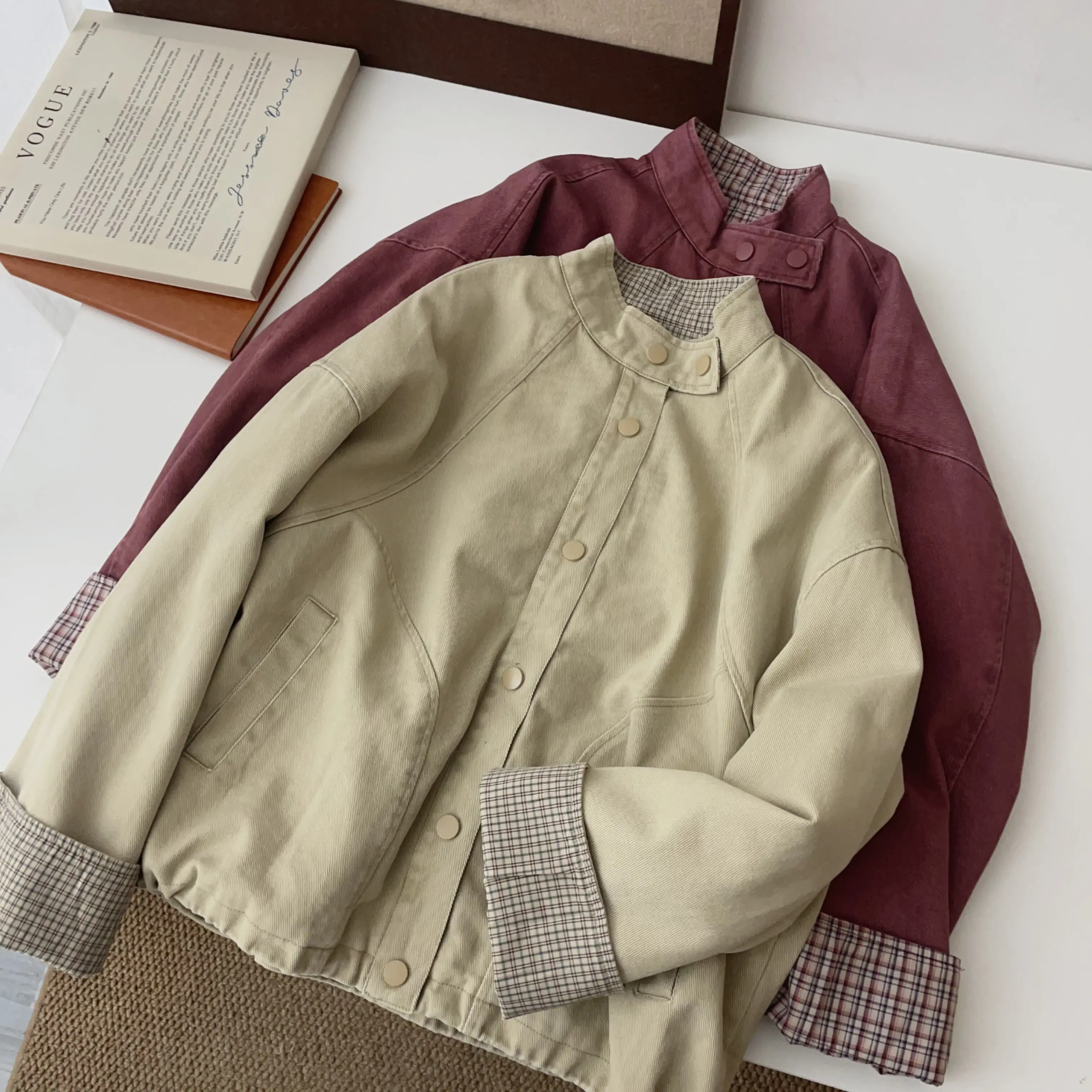 Chaqueta casual sencilla versátil estilo coreano con cuello alto y patchwork de cuadros para mujer, top holgado casual versátil para mujer