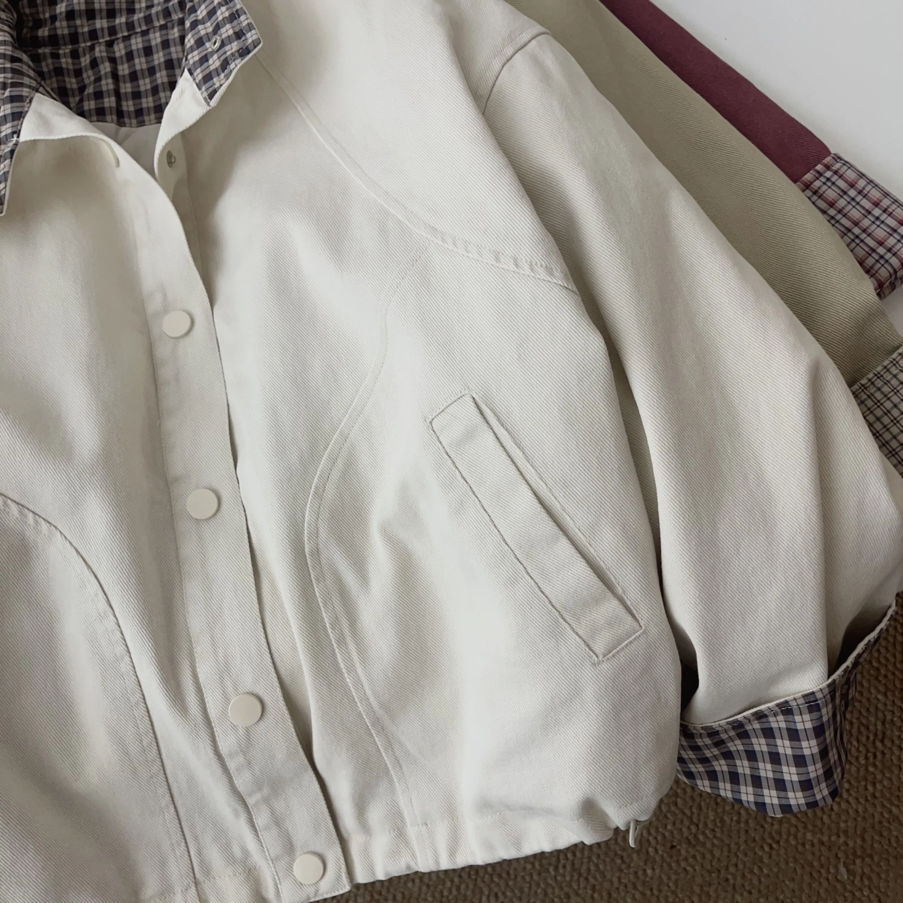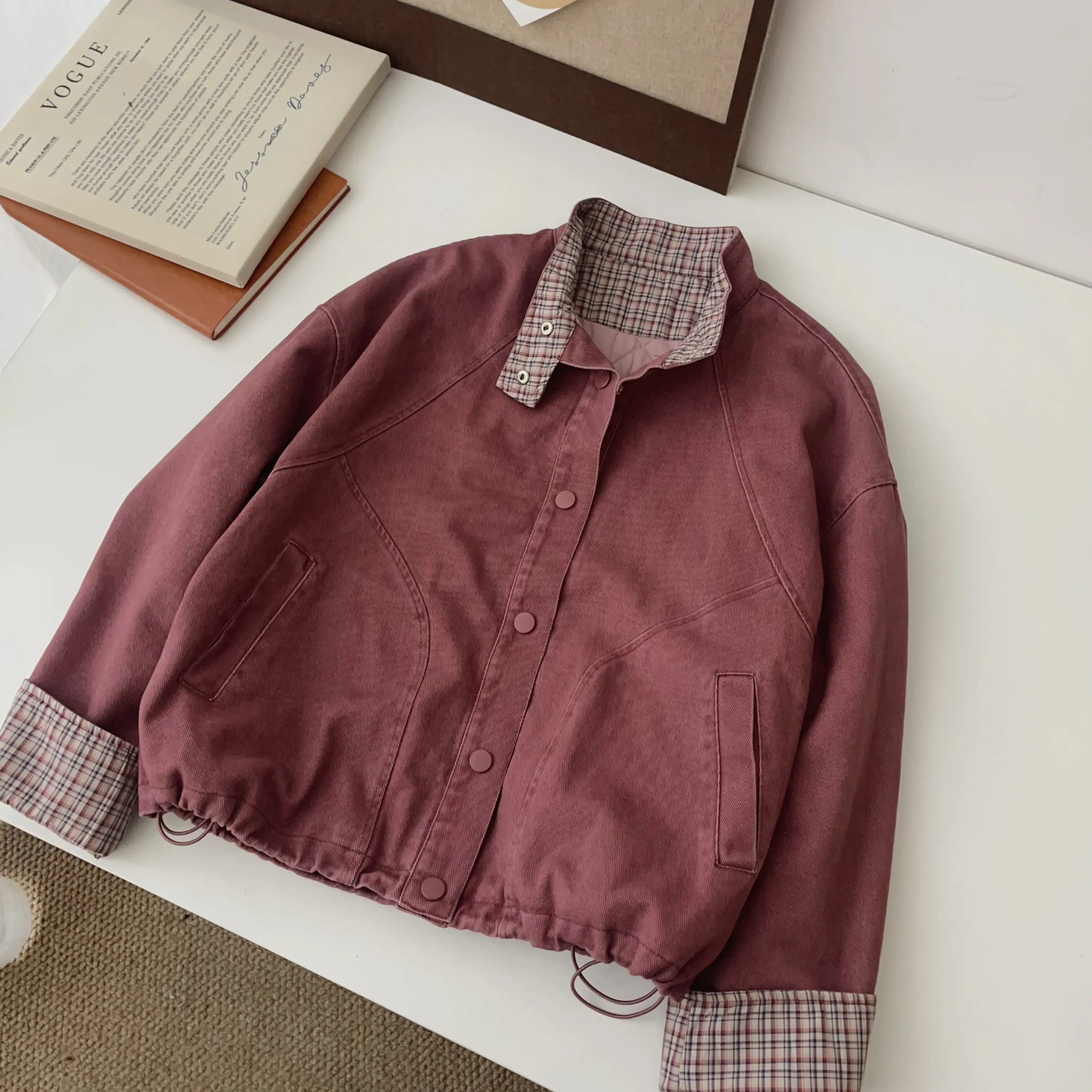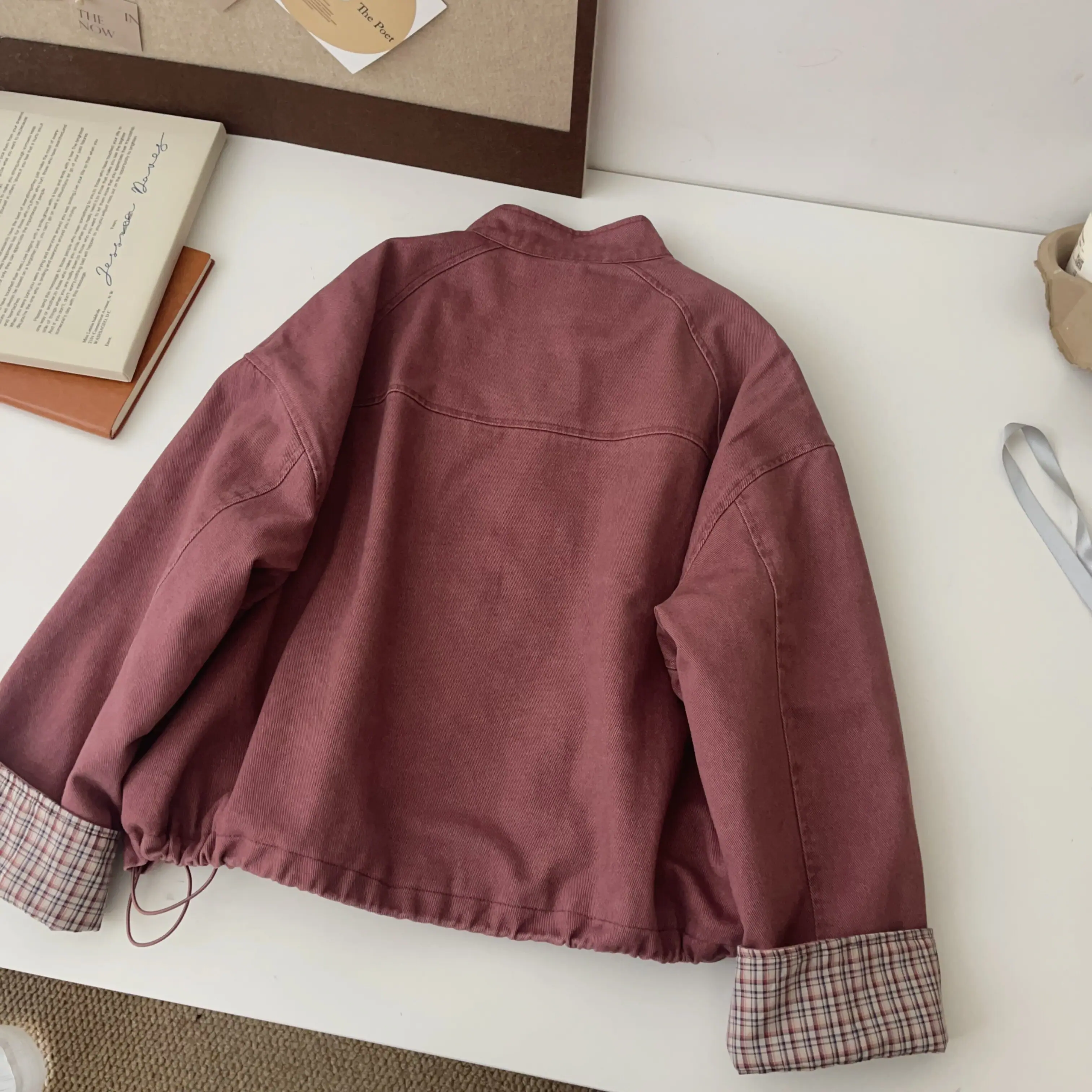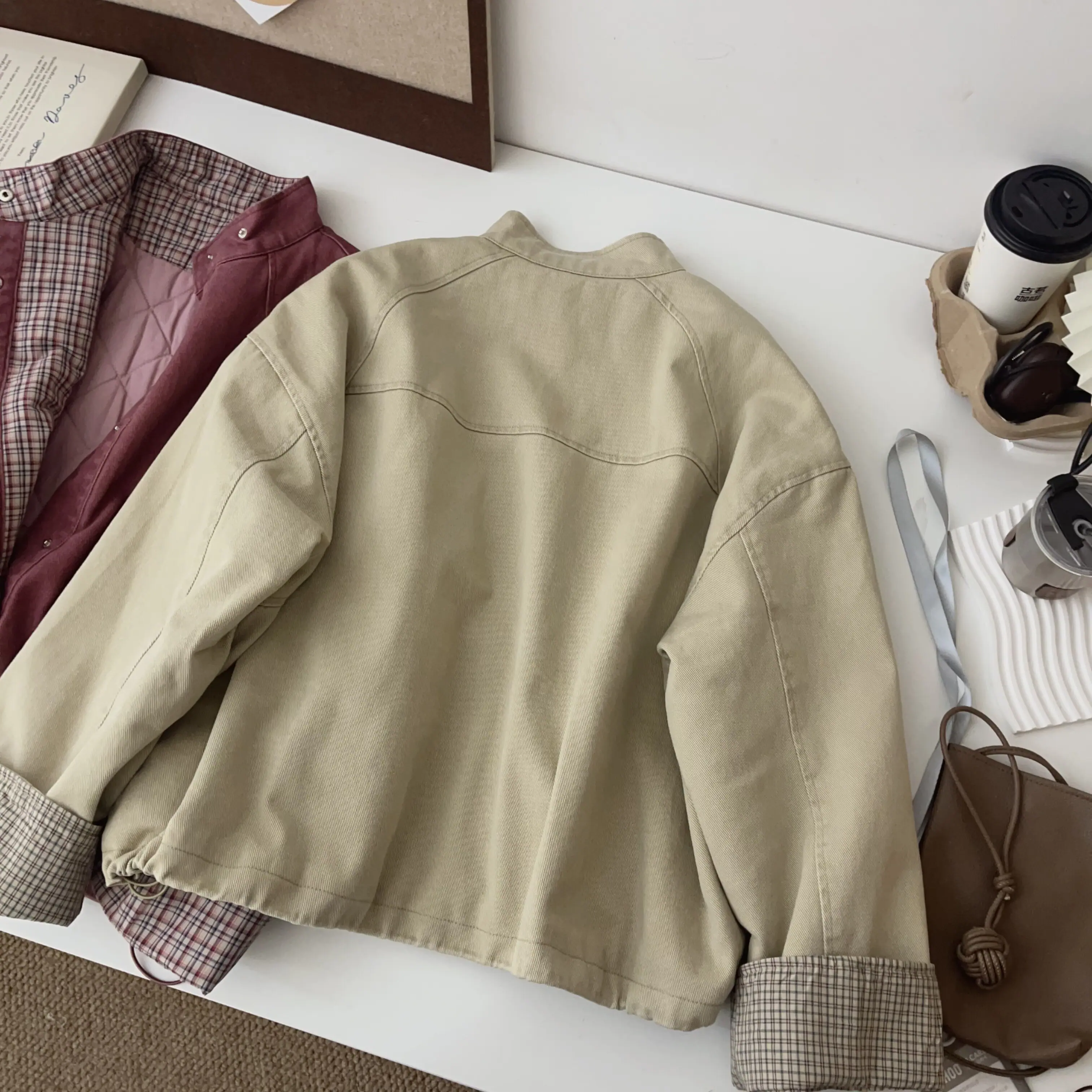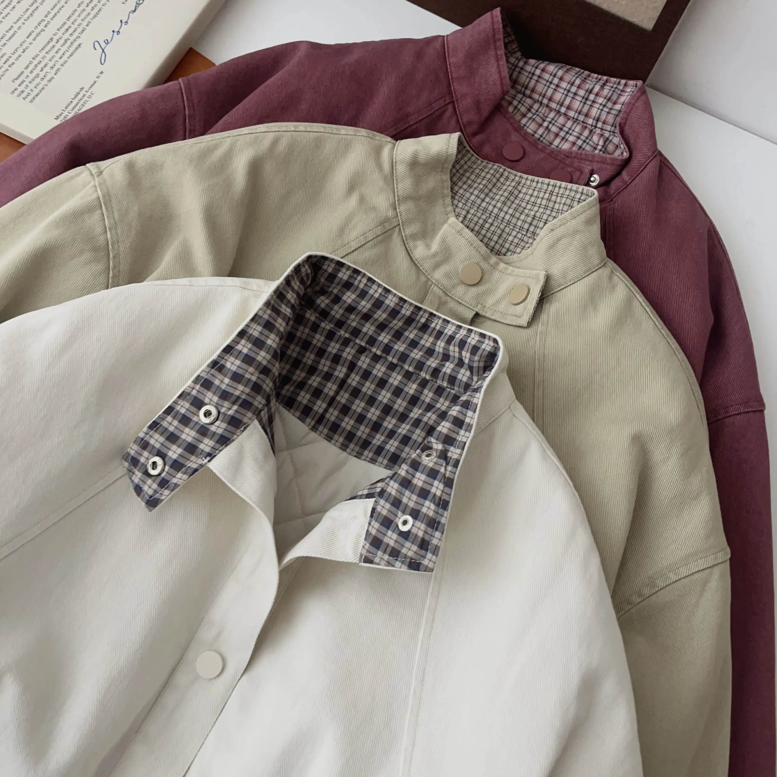 Chaqueta casual sencilla versátil estilo coreano con cuello alto y patchwork de cuadros para mujer, top holgado casual versátil para mujer