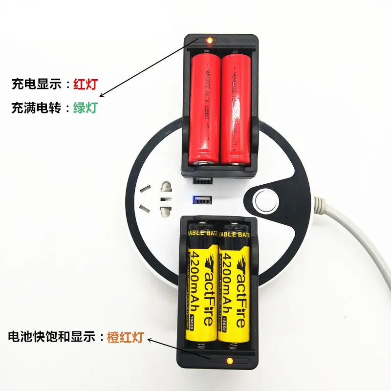 Características del producto: El cargador tiene indicador de polaridad positiva y negativa. Las baterías tienen prohibido colocarse al revés. Canal dual, se coloca una batería, la carga es más rápida, adecuado para baterías 18650, la luz de carga muestra rojo, cambia a verde cuando está completamente cargada y se detiene automáticamente cuando está completamente cargada.