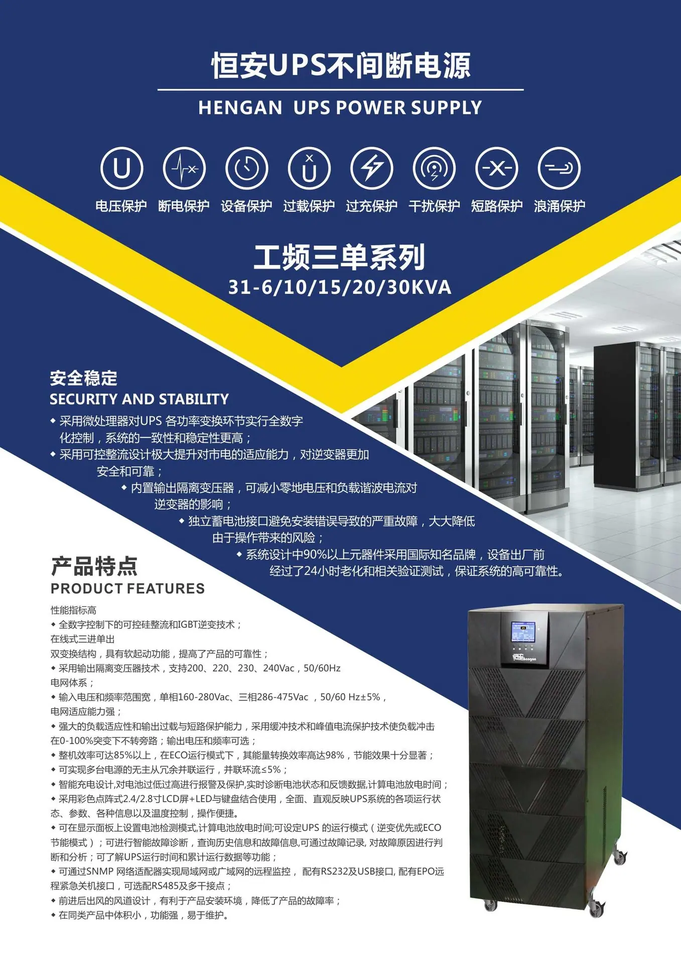 Heng'an Fuente de Alimentación UPS 3H3-100KVA Frecuencia Industrial Montaje en Rack Entrada Trifásica Salida Trifásica 100KVA Estabilizador de Voltaje para Sala de Computadoras