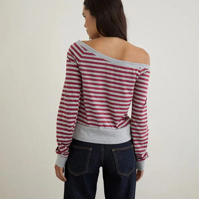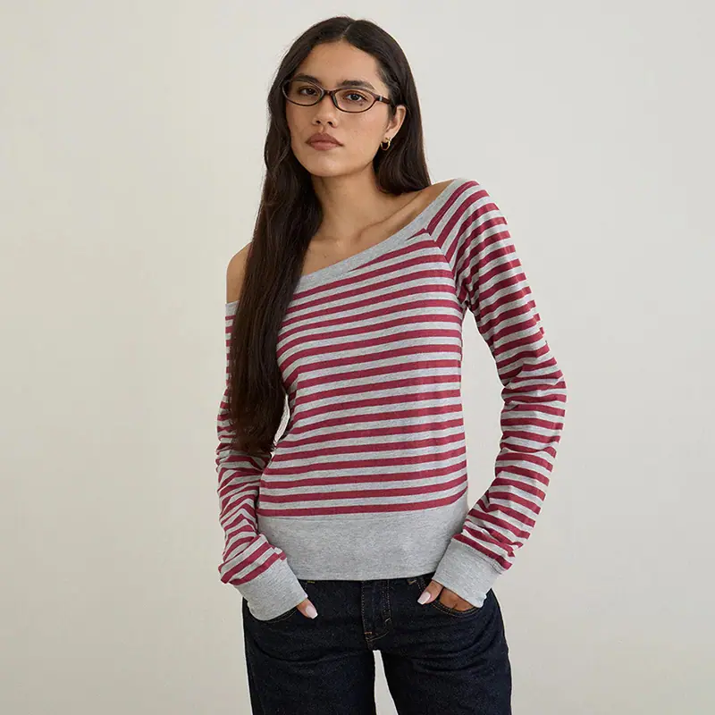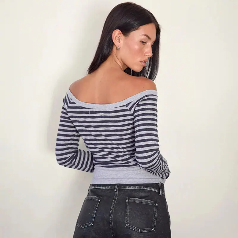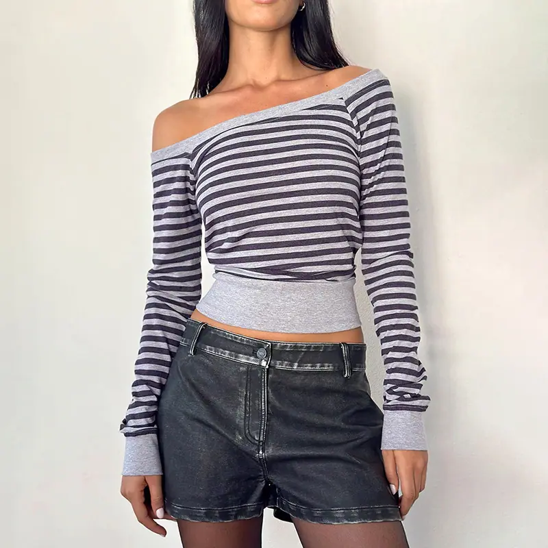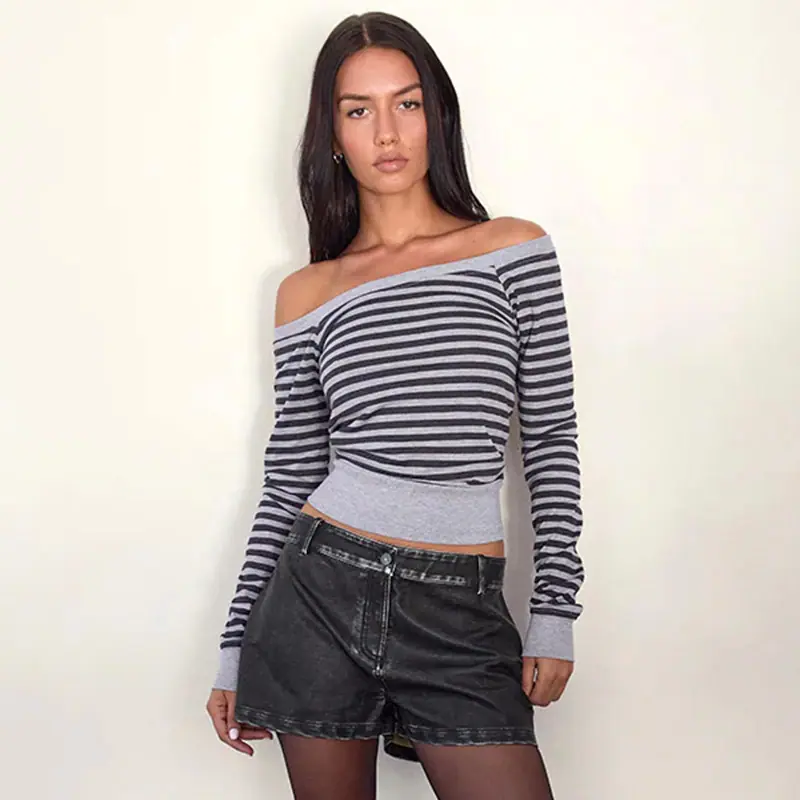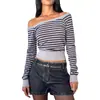 Y2k Ropa de otoño para mujer transfronteriza europea y americana, nuevo top corto versátil de patchwork a rayas con hombros descubiertos y manga larga, venta al por mayor