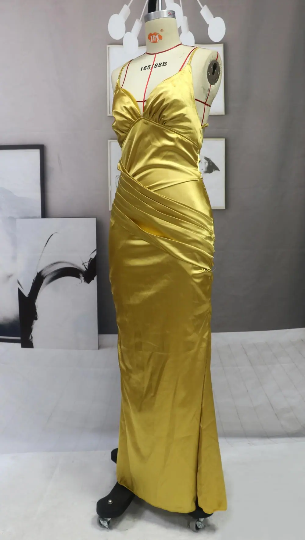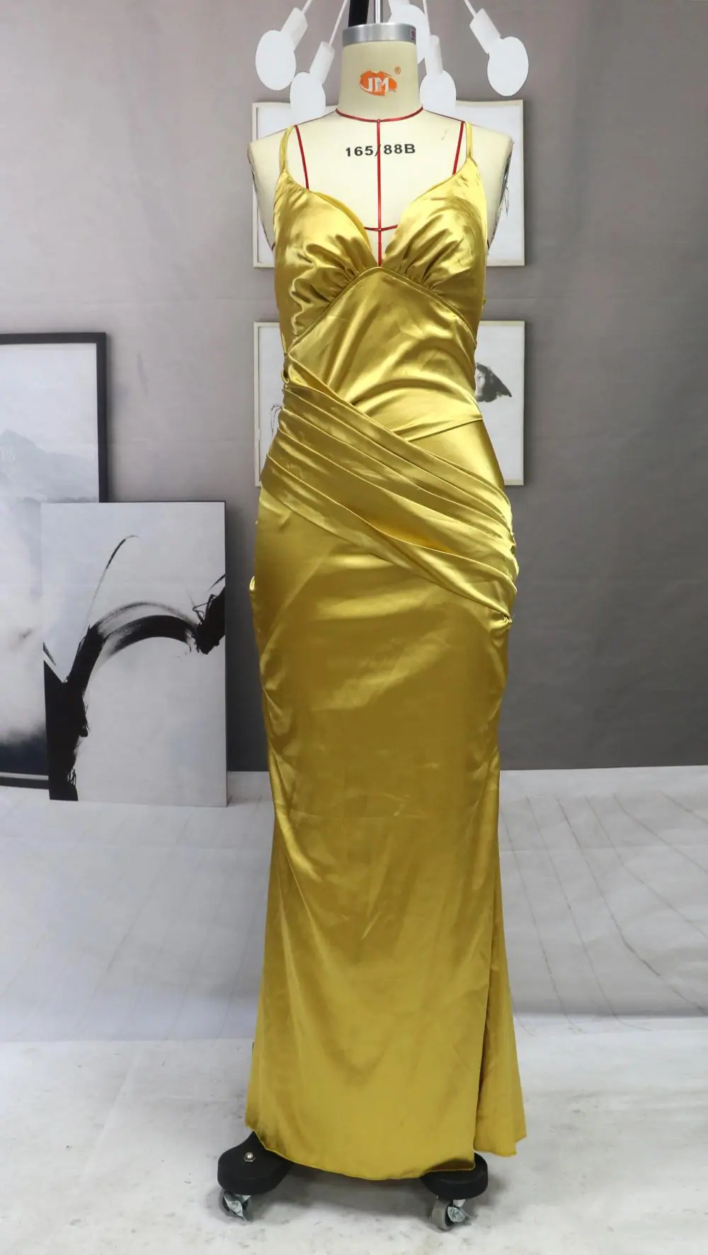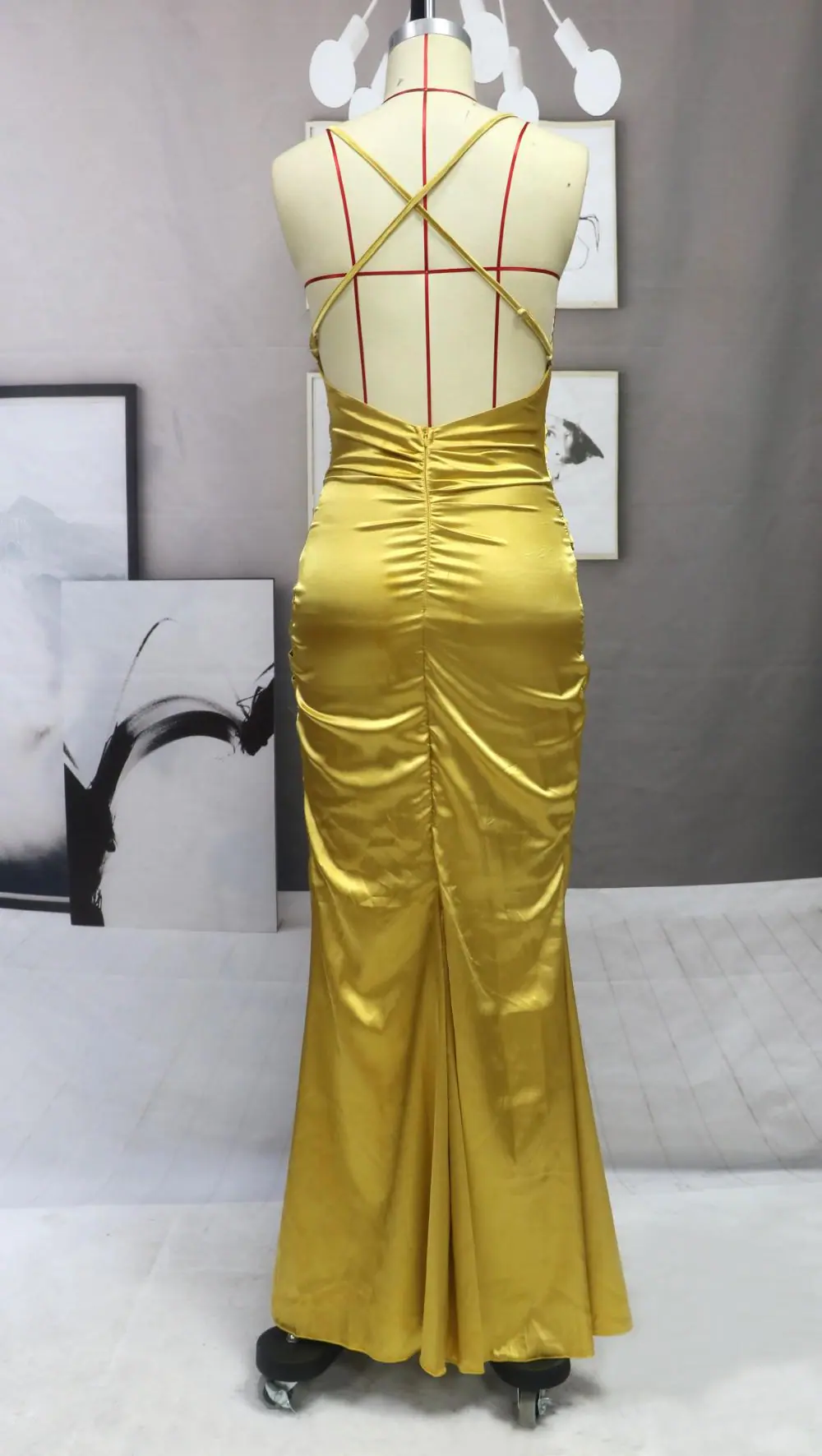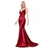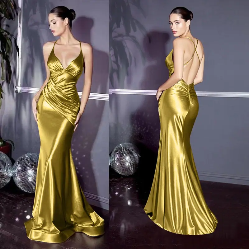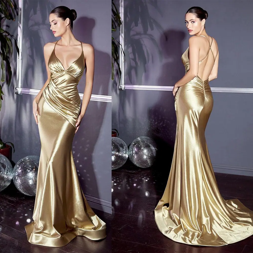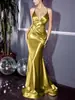 Vestido Nuevo 2025 Exportación Europea y Americana Slim Elegante Dorado Elegante Espalda Descubierta Cola de Pez Largo Tirantes Vestido de Noche