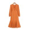 Venta al por mayor 2024 verano nuevo estilo europeo y americano vestido de punto naranja de manga larga con cuello en V para mujer