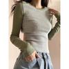 Camiseta de Manga Larga Hombro Descubierto para Mujer, Top Interior de Color Contrastante Estilo Retro 2025 Otoño Nueva Camiseta Base Ajustada de Canalé