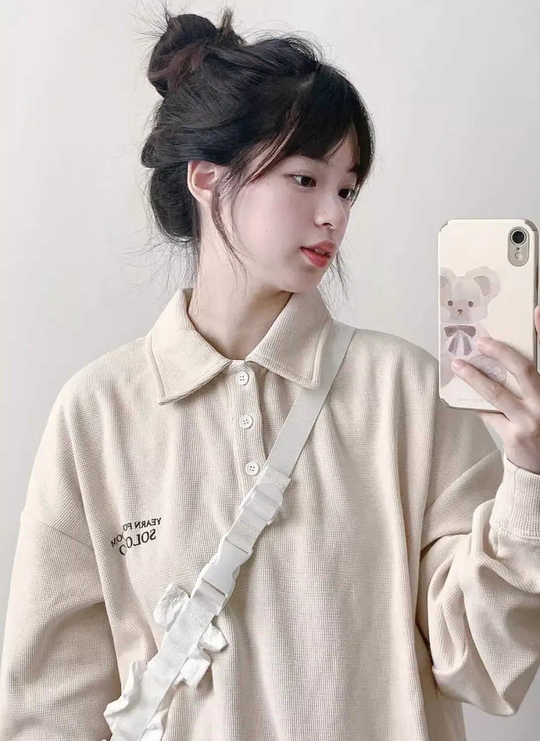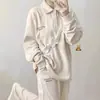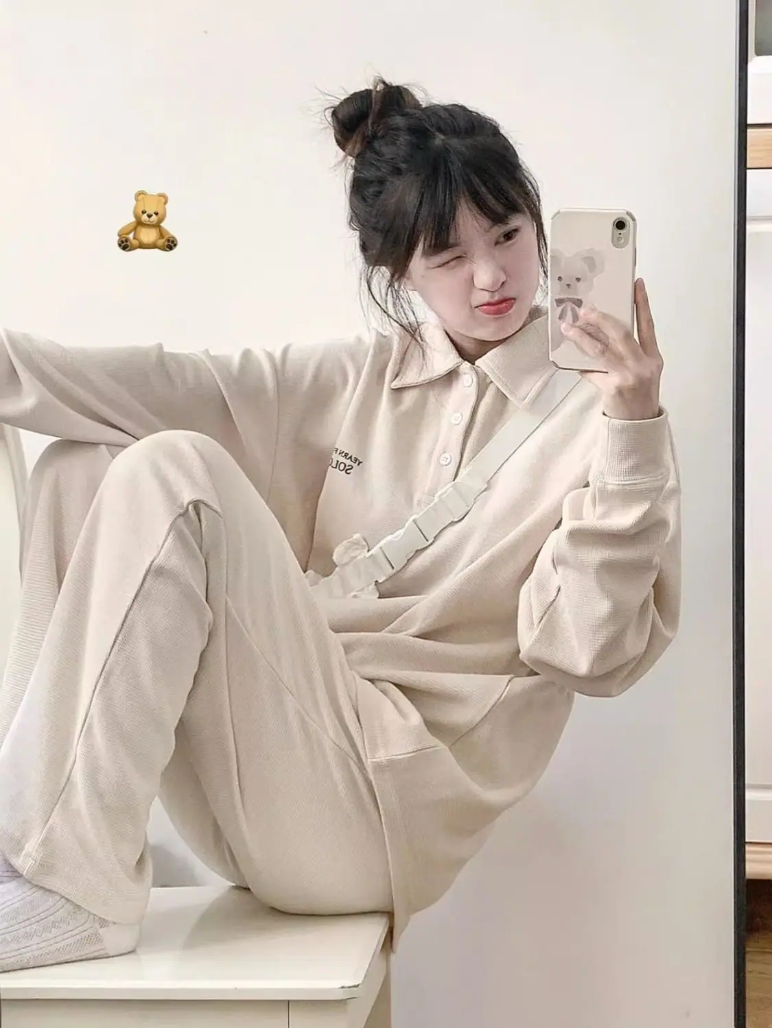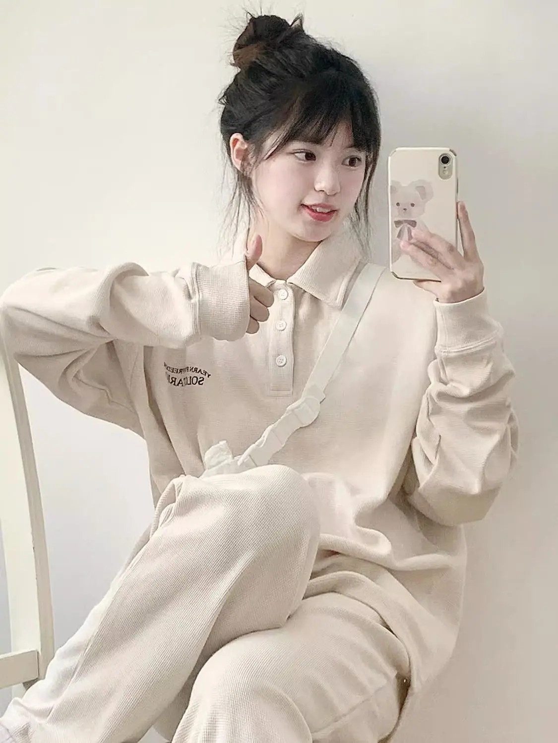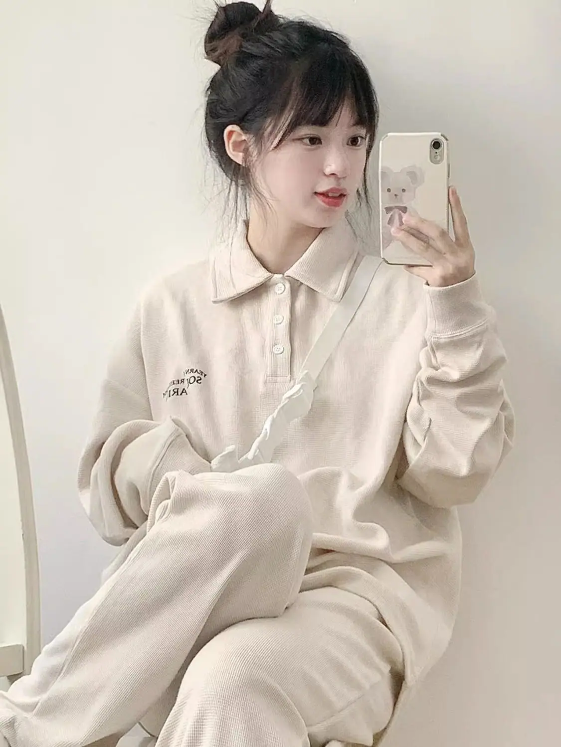 Traje Deportivo Estilo Universitario para Mujer Primavera y Otoño Estilo Salado Calle Frita Sudadera con Cuello Polo Waffle Pantalones Set Casual de Dos Piezas