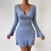 Elegante Vestido Europeo y Americano con Cuello en V Profundo y Manga Campana Otoño e Invierno Sexy Elegante Espalda Descubierta con Cordones Manga Larga Falda Corta Ceñida a la Cadera para Mujer