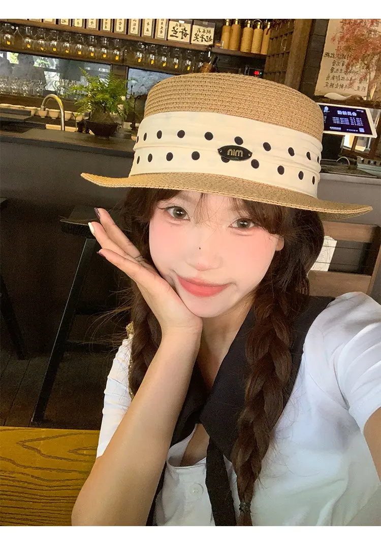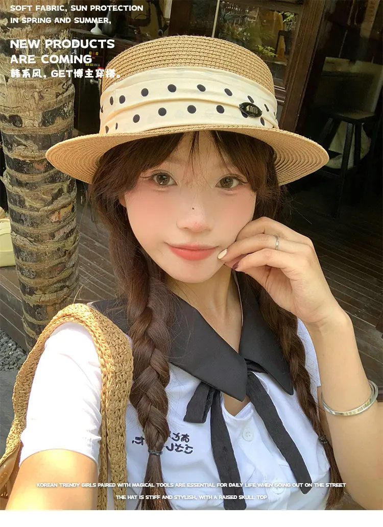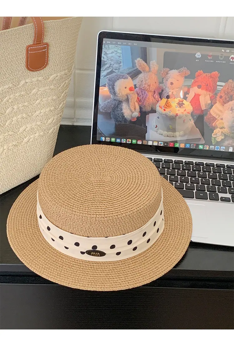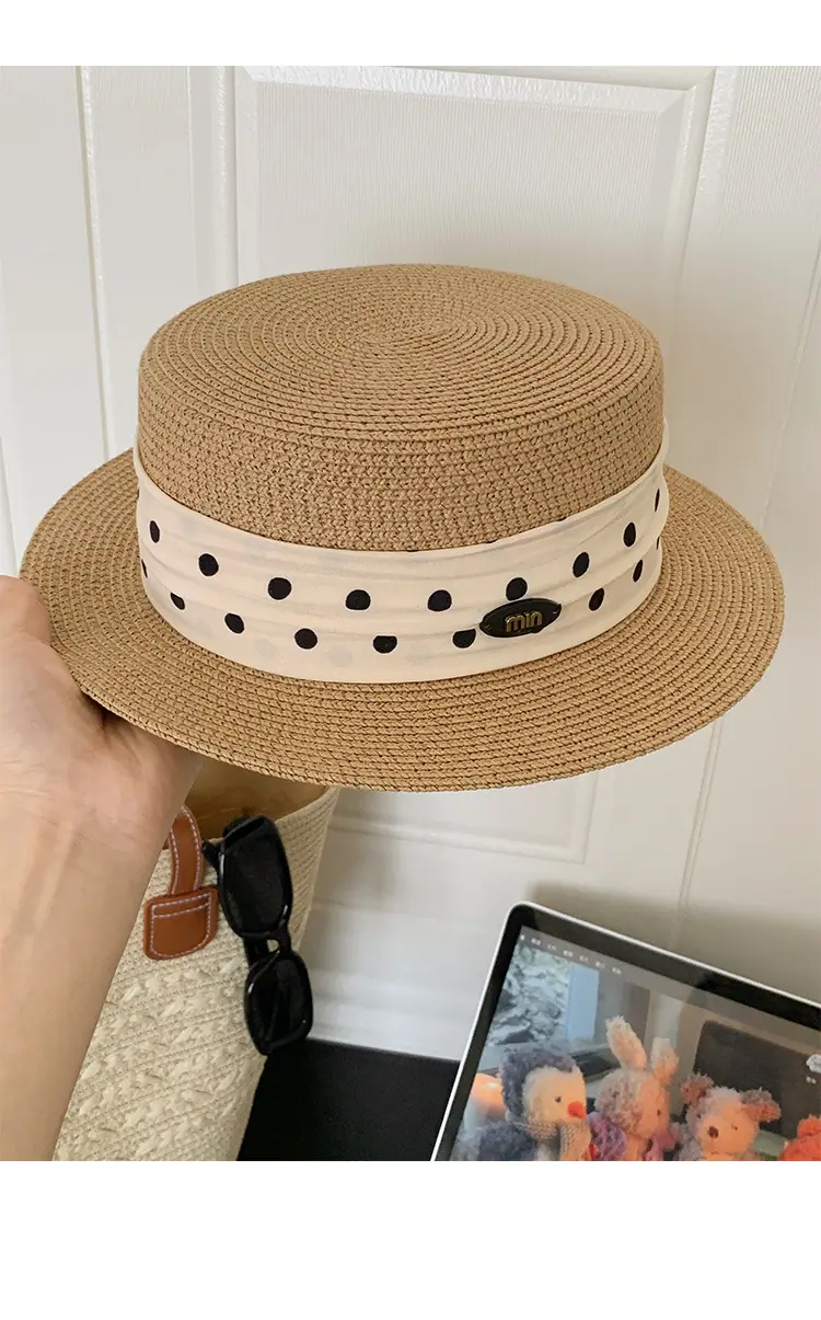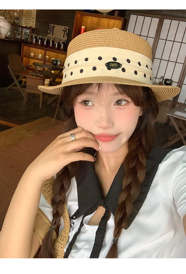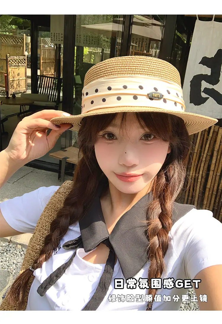 Sombrero de Paja de Copa Baja con Lunares Ondulados Estilo Francés para Mujer Verano Vacaciones en la Playa Sombrero de Copa Pequeño Sombrero para el Sol Sombrero Protector Solar Tejido de Paja Sombrero para el Sol