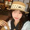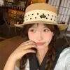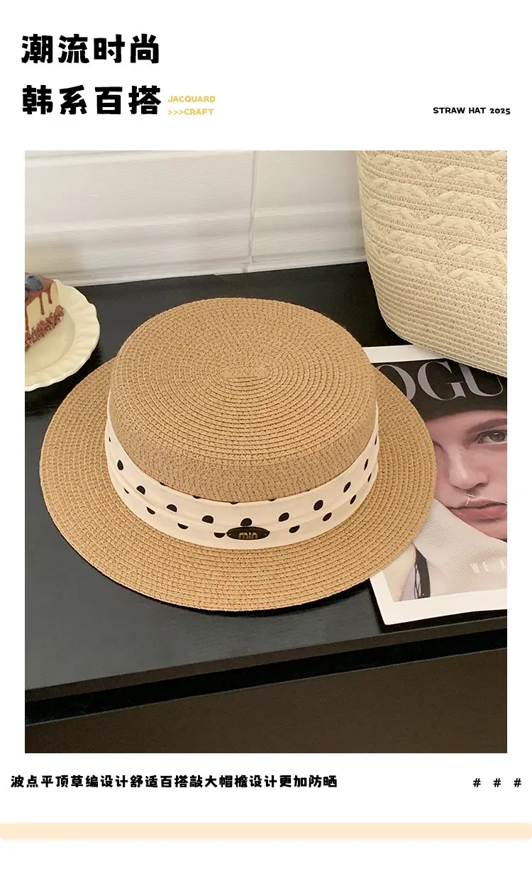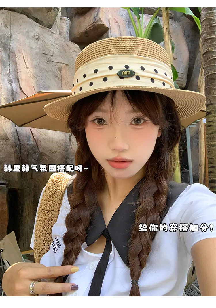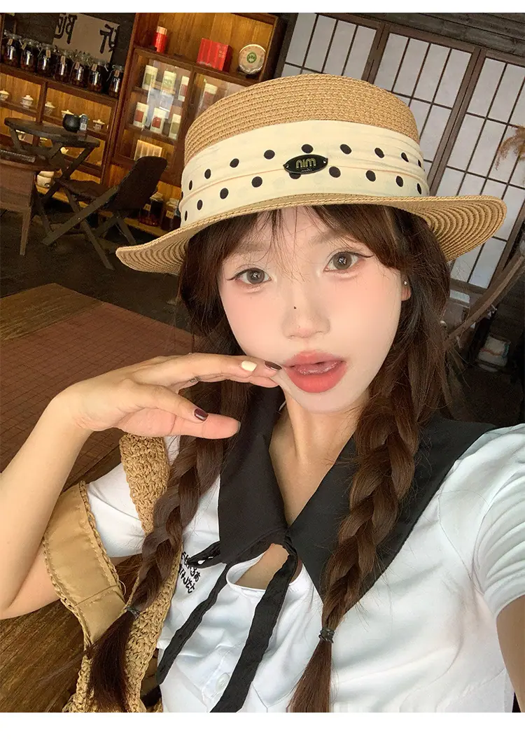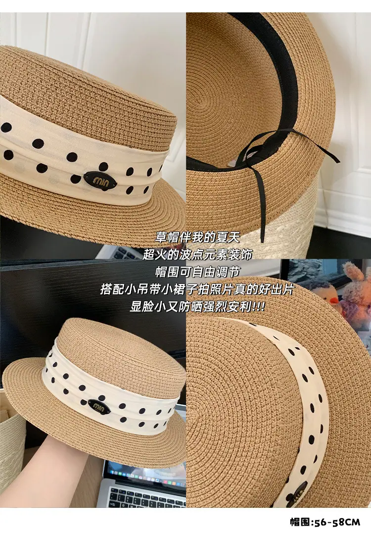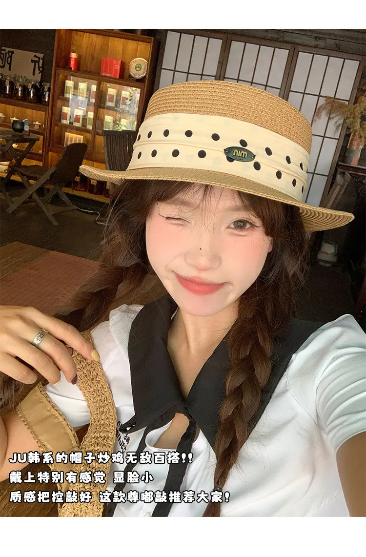 Sombrero de Paja de Copa Baja con Lunares Ondulados Estilo Francés para Mujer Verano Vacaciones en la Playa Sombrero de Copa Pequeño Sombrero para el Sol Sombrero Protector Solar Tejido de Paja Sombrero para el Sol