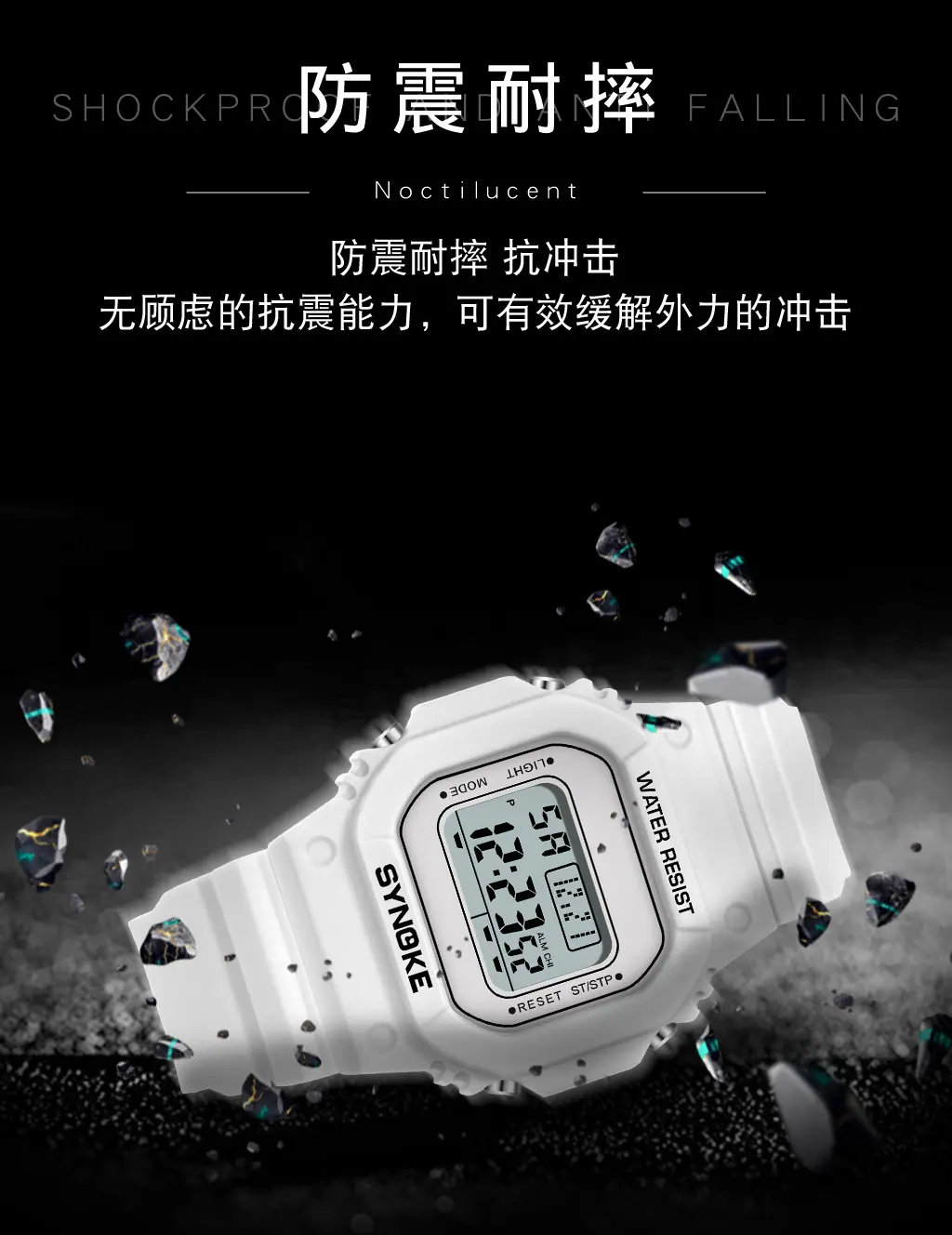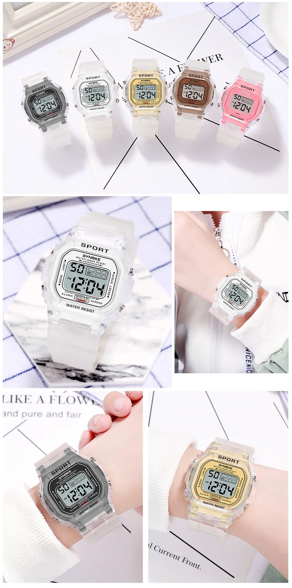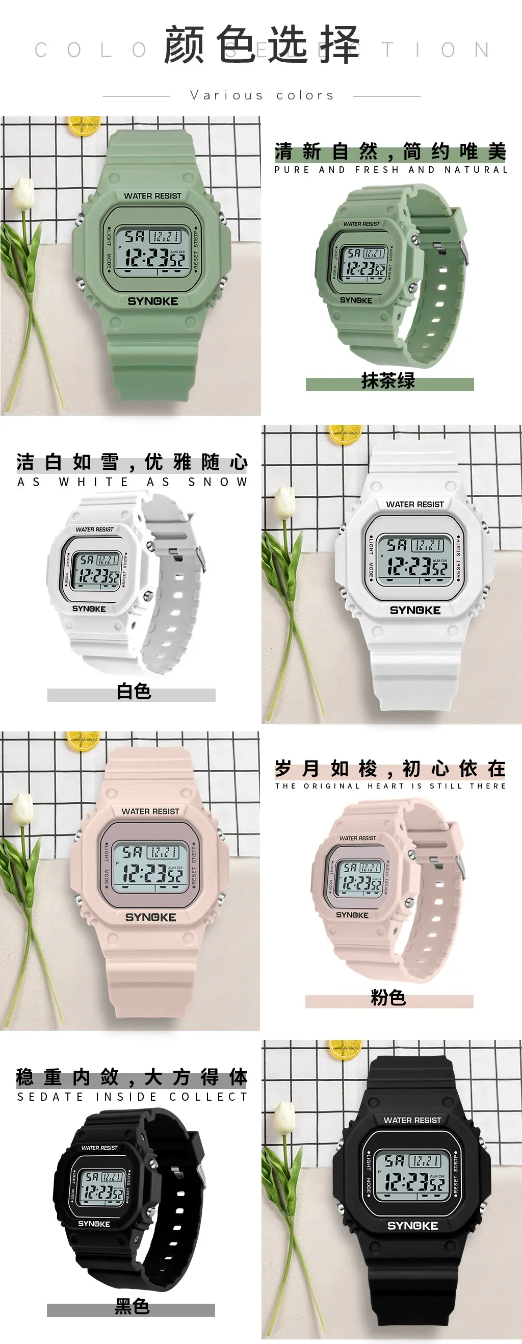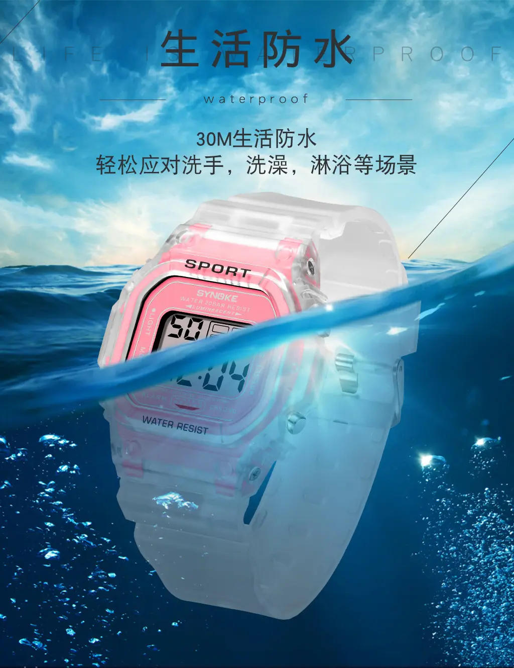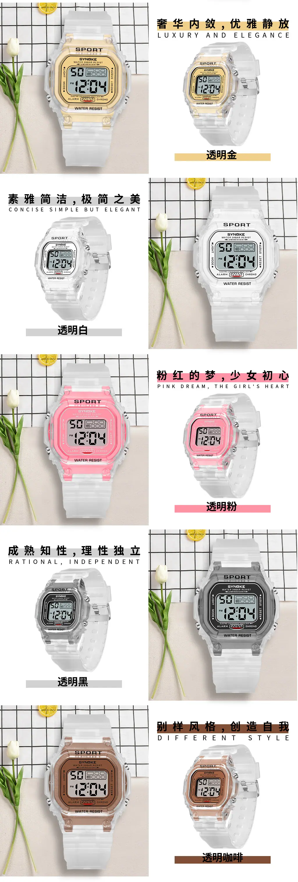 Correa de plástico PU, caja de plástico, tapa inferior de acero inoxidable, espejo acrílico, hebilla de acero inoxidable. |