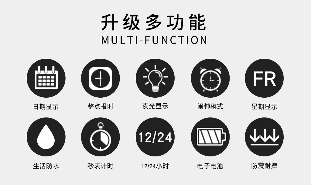 Visualización de día, luminoso, reloj despertador, señal horaria, resistente al agua 30M, segundero, formato de 12/24 horas. |