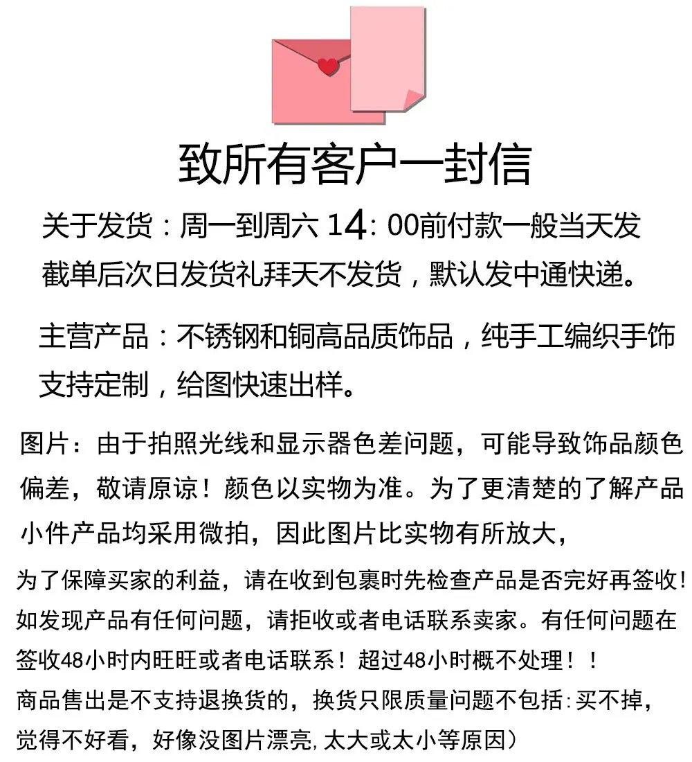 | Admite 7 días de devoluciones y cambios sin motivo Compra única con descuento completo y envío gratis, compra más obtén más descuentos, soporte para facturación contactar servicio al cliente Se prefiere una gran cantidad, se admite la toma de muestras, nuestra tienda por defecto utiliza Zhongtong Express, si necesita otro servicio exprés, por favor contacte con el servicio de atención al cliente para consulta. La entrega exprés puede verse sobrepasada durante las vacaciones, por favor no insistan, los hermanos de entrega ya son muy eficientes |