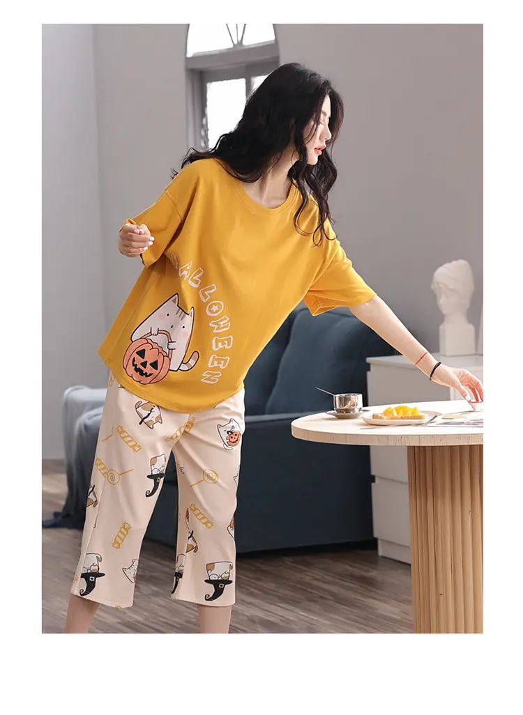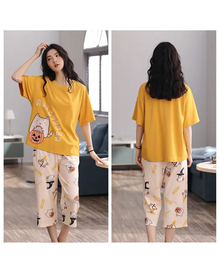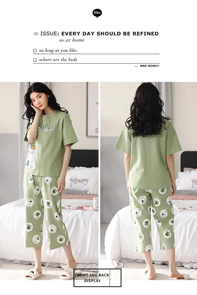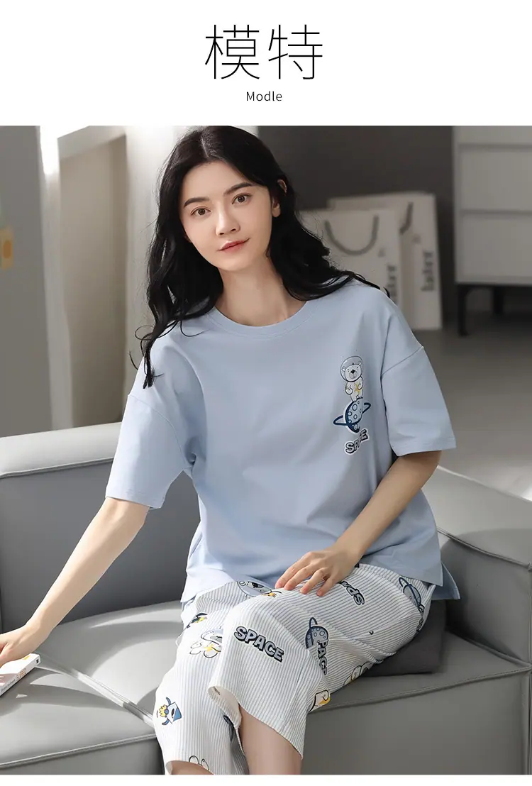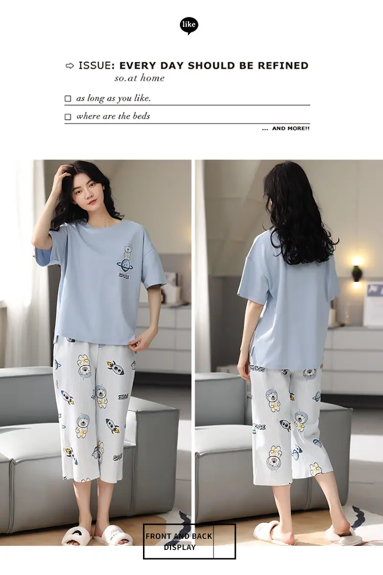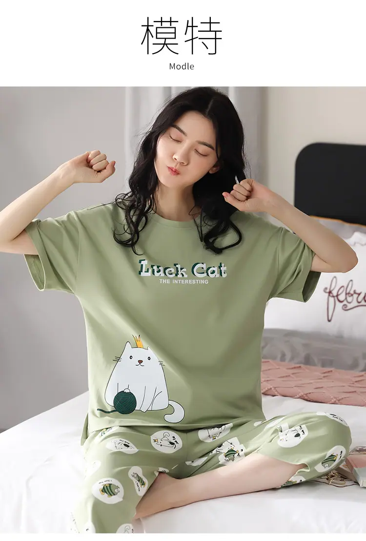 [7] Pijama de Verano para Mujer Algodón Manga Corta Set de Shorts Cortos Crop Verano Delgado Talla Grande Ropa para el Hogar