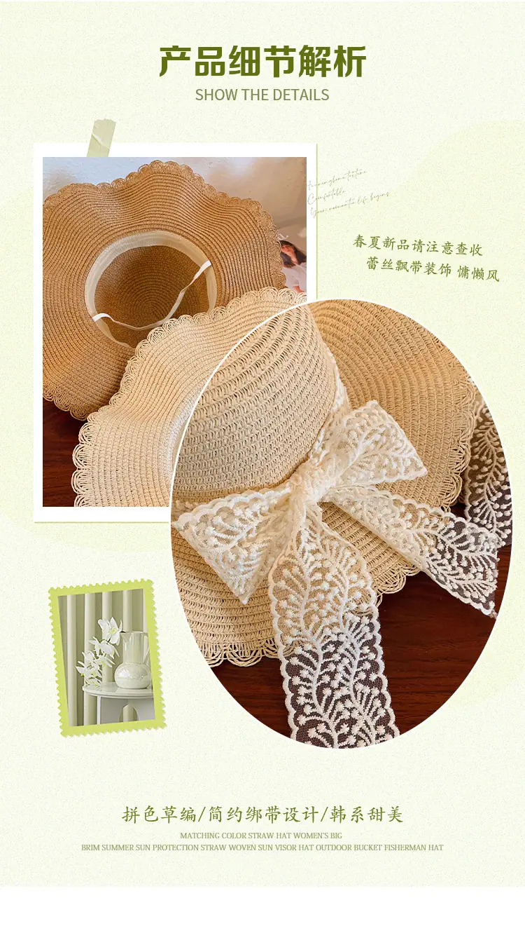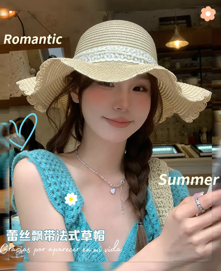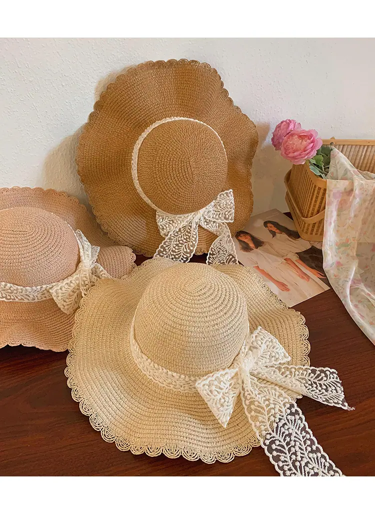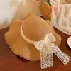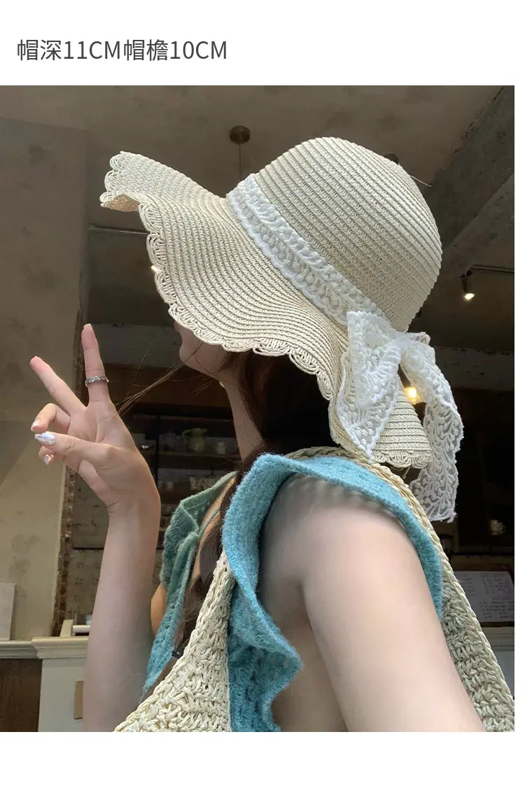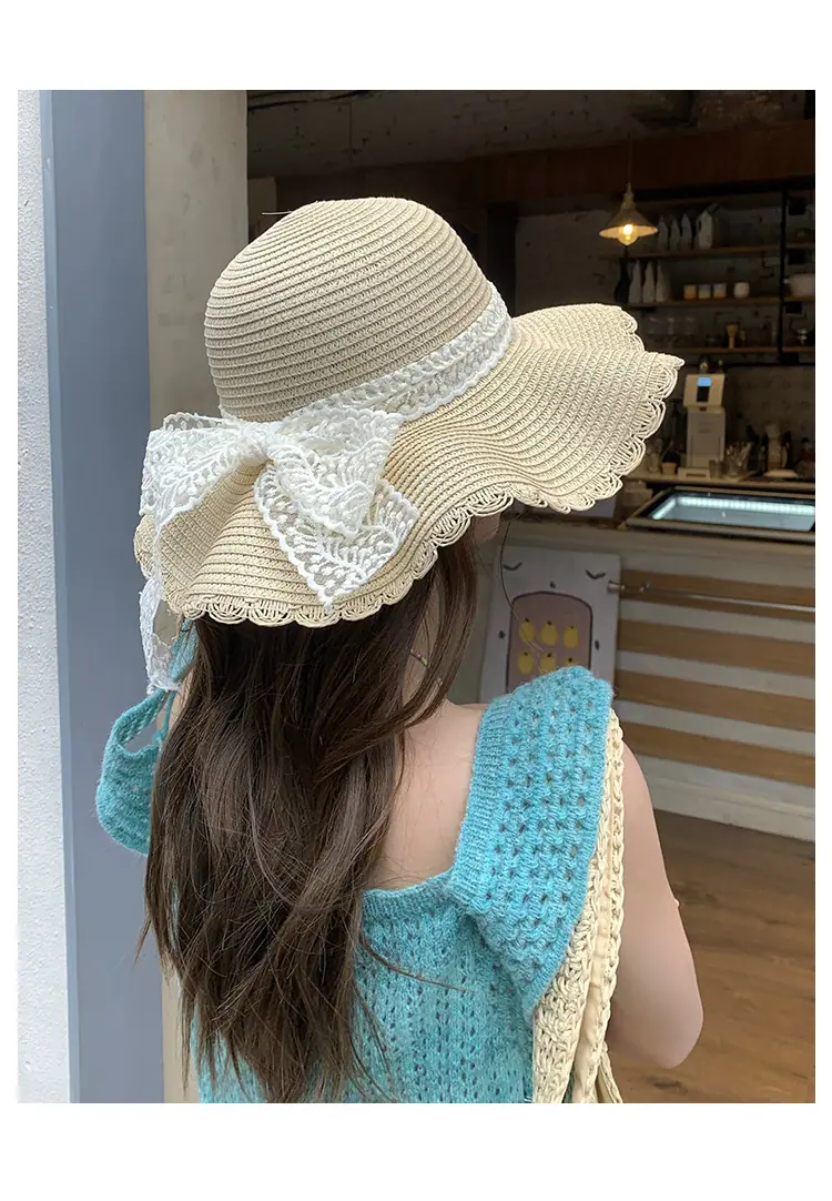 Sombrero de Paja con Lazo de Encaje de Borde Ondulado para Mujer Verano Ala Ancha Tejido Sombrero para Vacaciones en la Playa Junto al Mar Sombrero para el Sol
