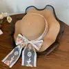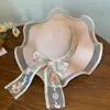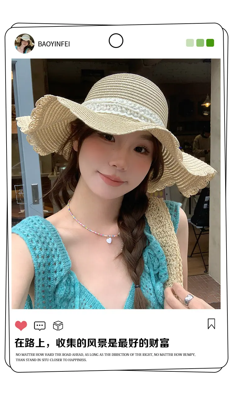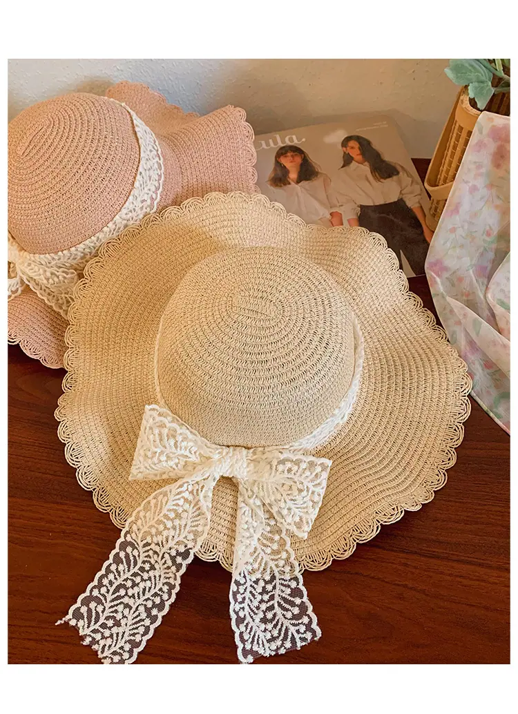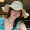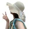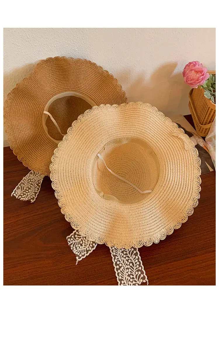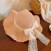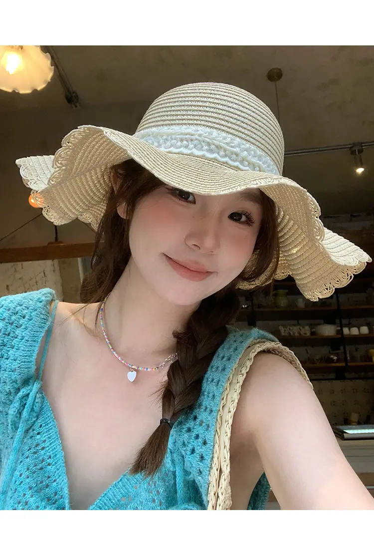 Sombrero de Paja con Lazo de Encaje de Borde Ondulado para Mujer Verano Ala Ancha Tejido Sombrero para Vacaciones en la Playa Junto al Mar Sombrero para el Sol