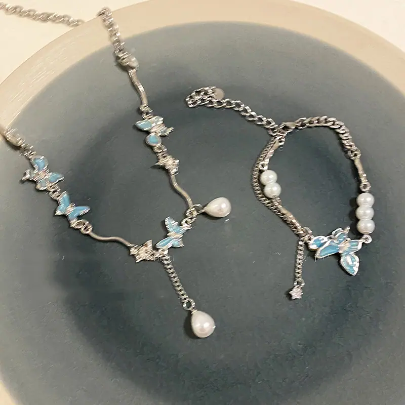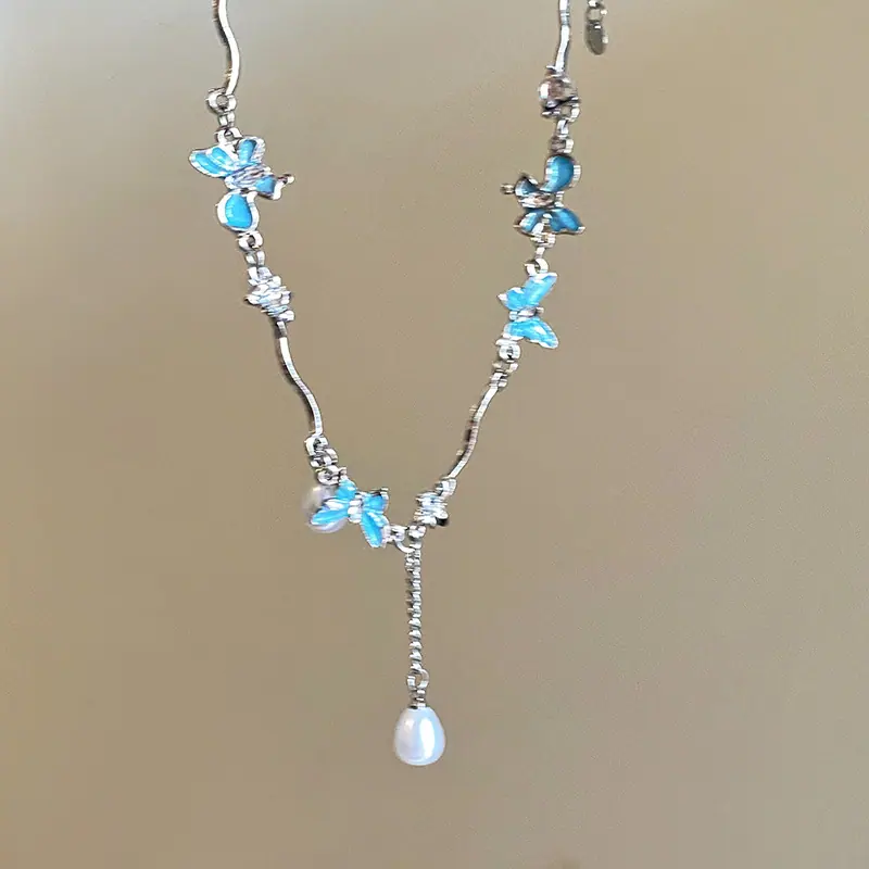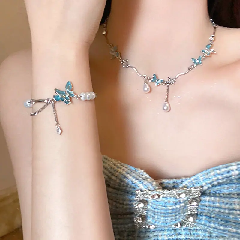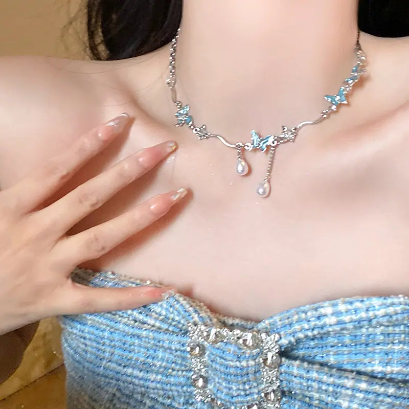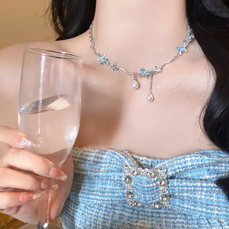 Collar de perlas y mariposa azul para mujer, estilo Spice Girl, elegante y de alta gama, con cadena de clavícula y diseño de nicho.