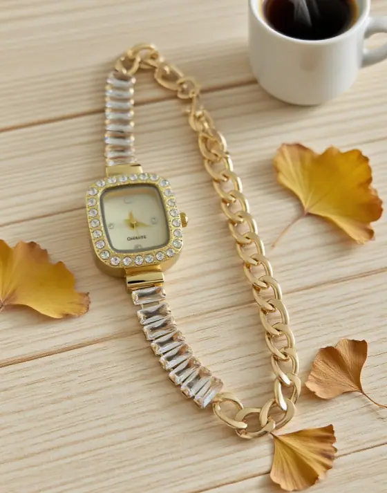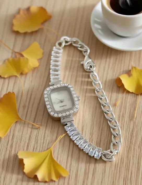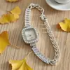 Square Diamond-Studded Chain Gold Bracelet Watch, Square Rhinestone Chain Silver Bracelet Watch, Round Gold Pi...