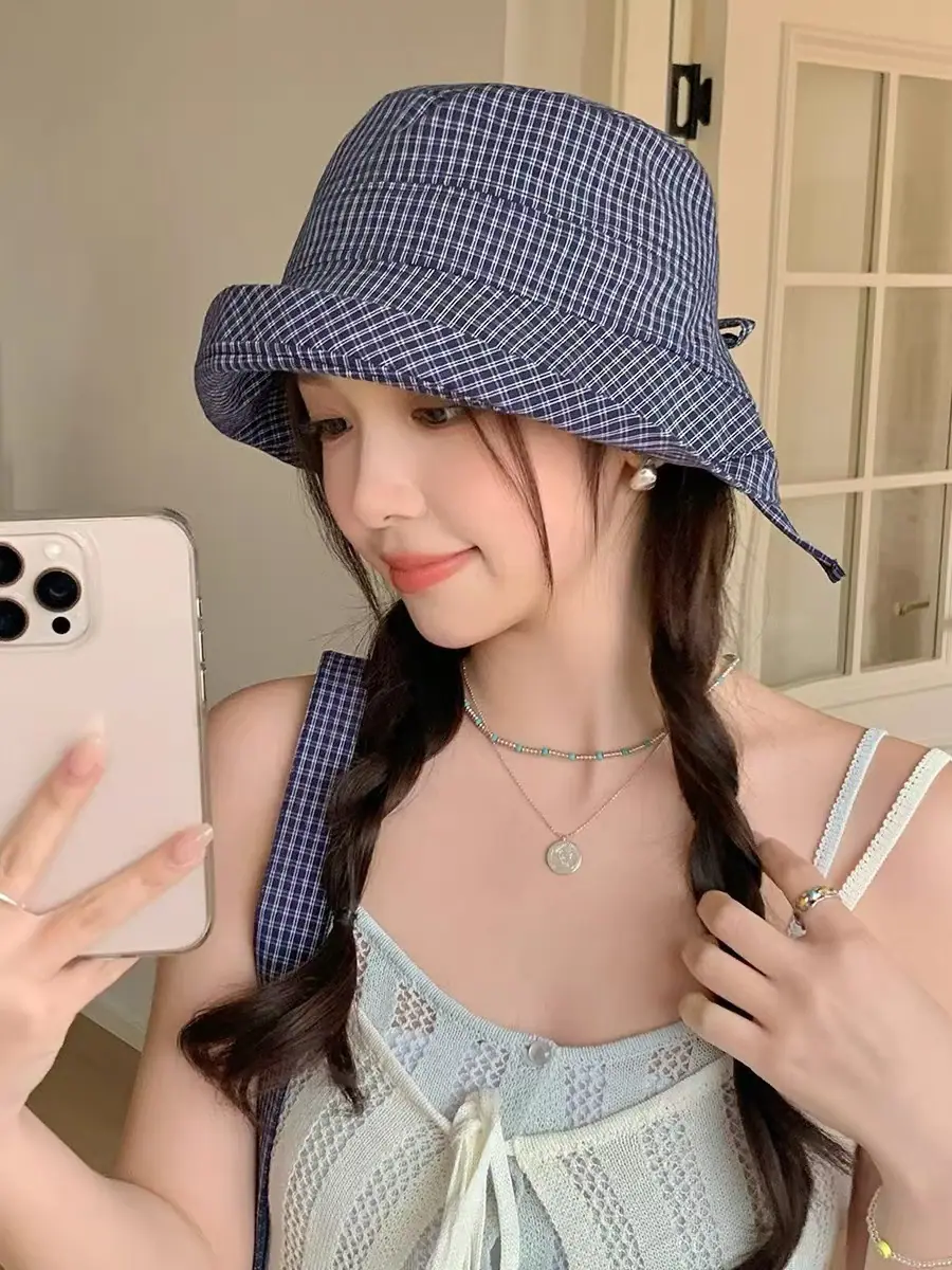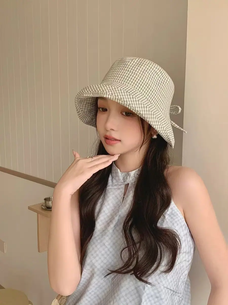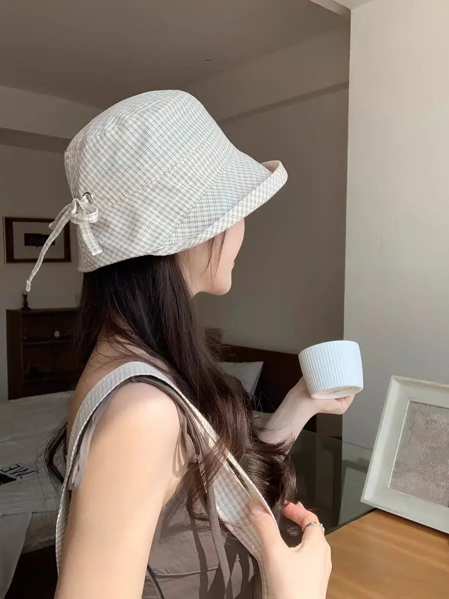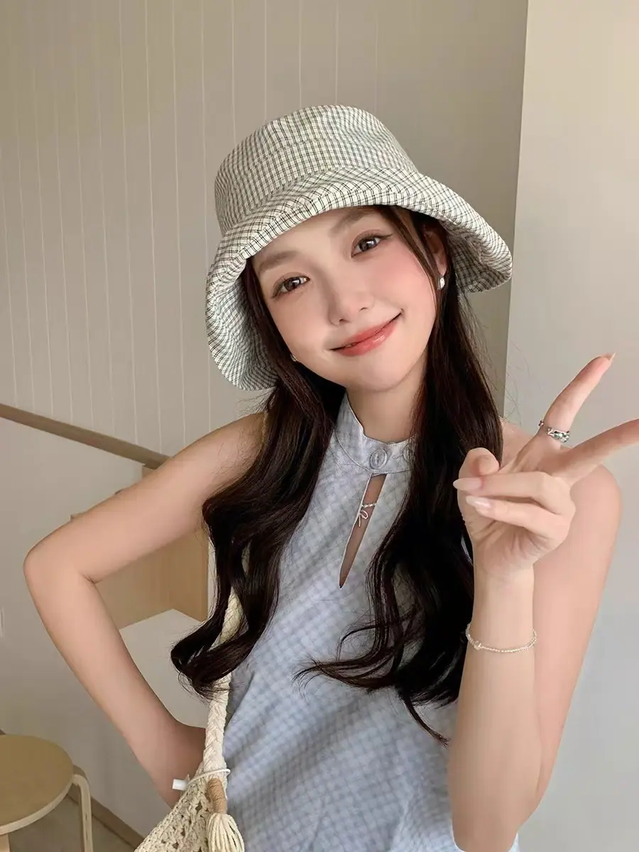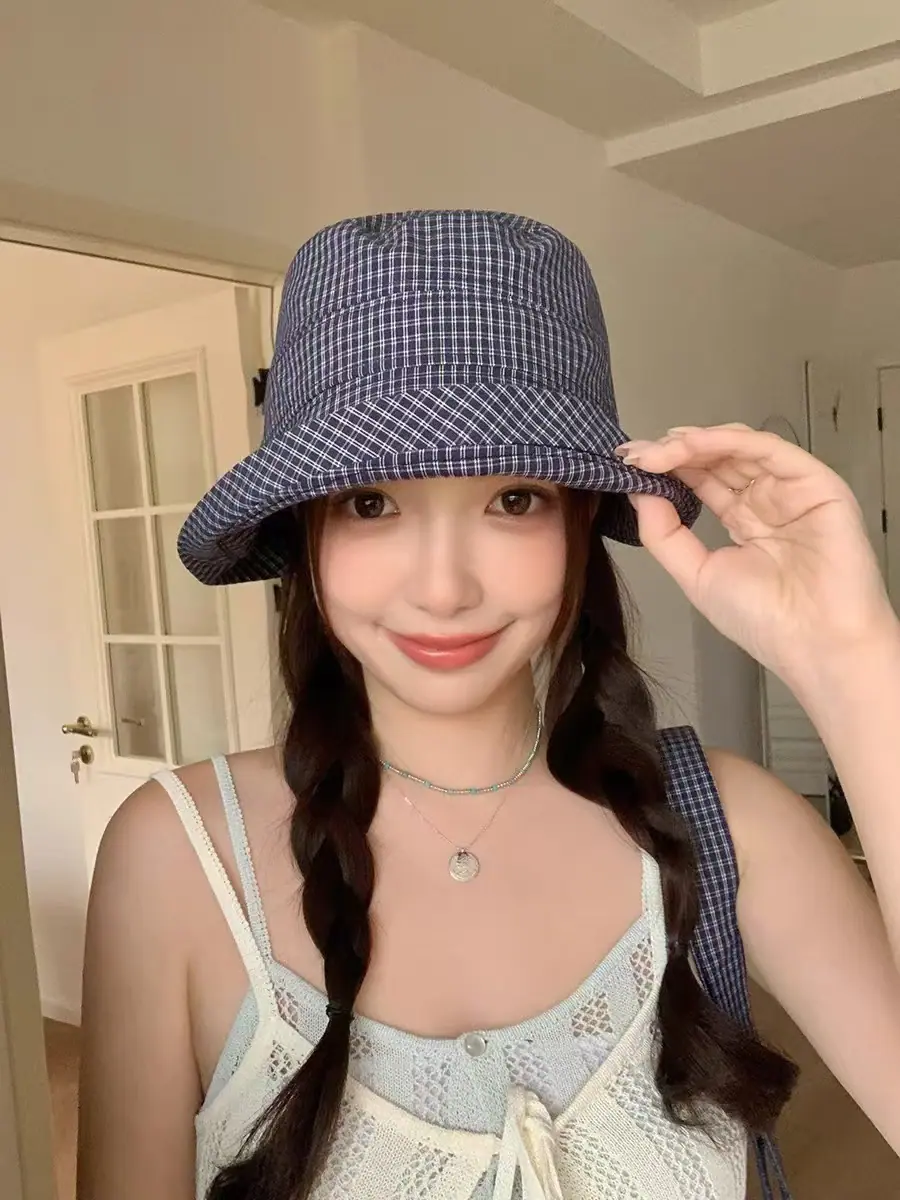 Nuevo Sombrero de Pescador de Cuadros Japoneses para Mujer Primavera Verano Estilo Coreano Ala Ancha Viaje Protección Solar Sombrero de Sol Cara Pequeña Sombrero de Cubo Literario