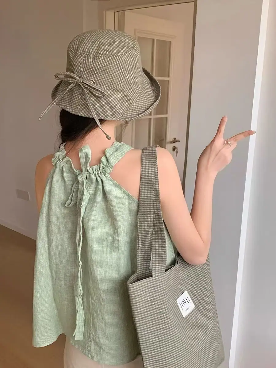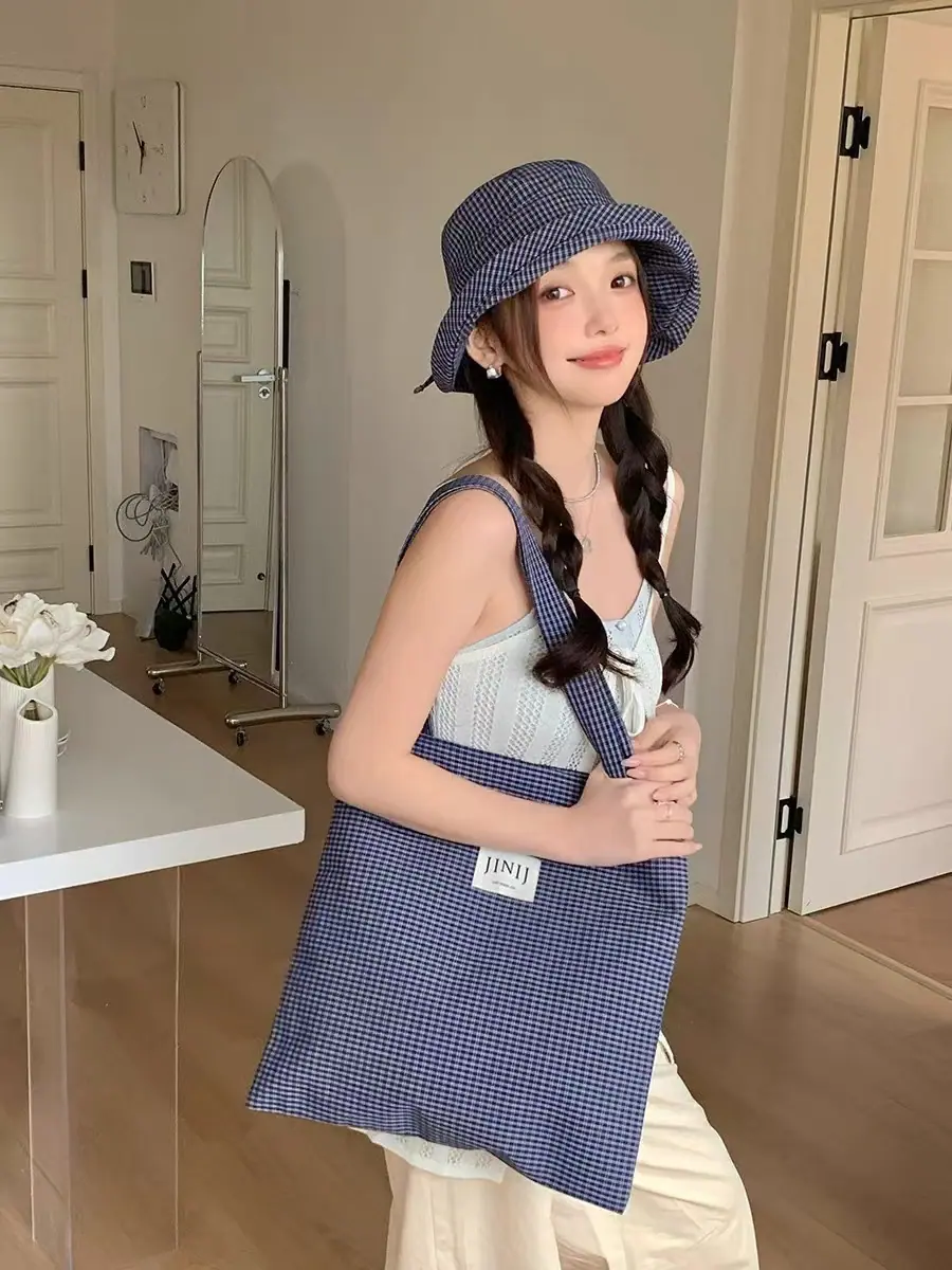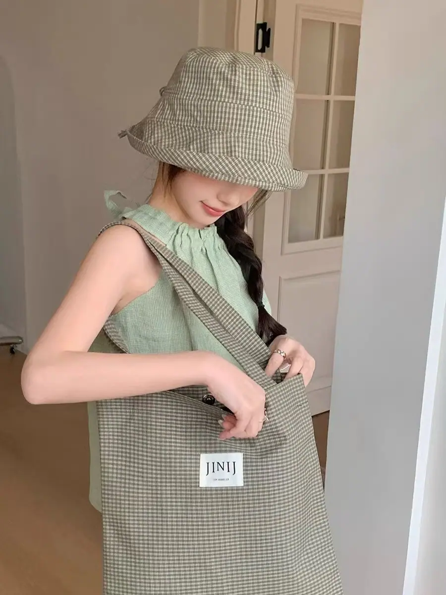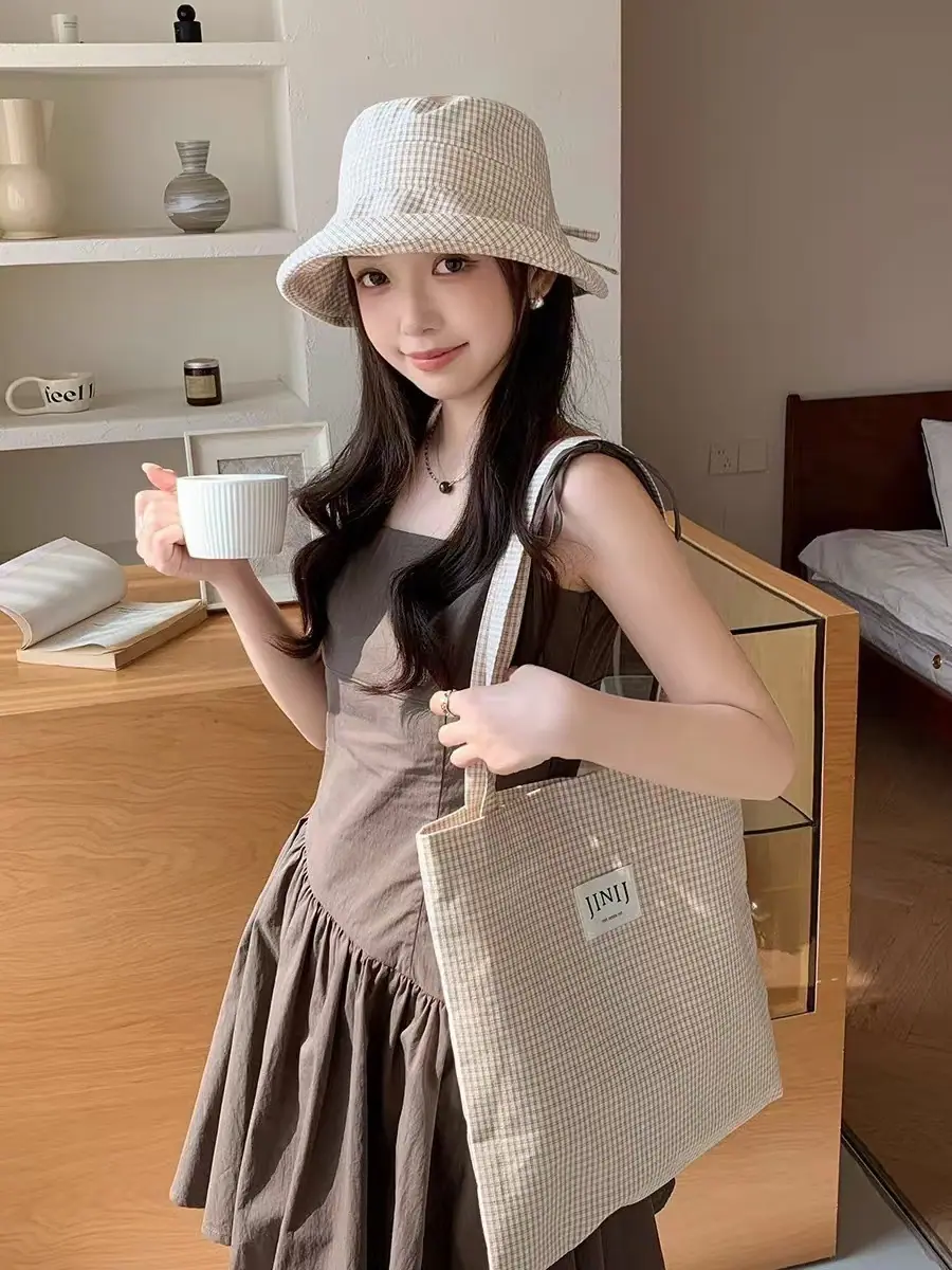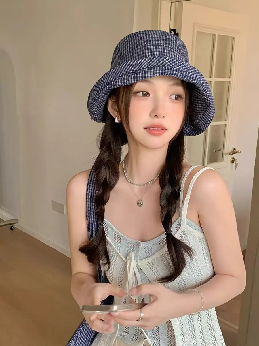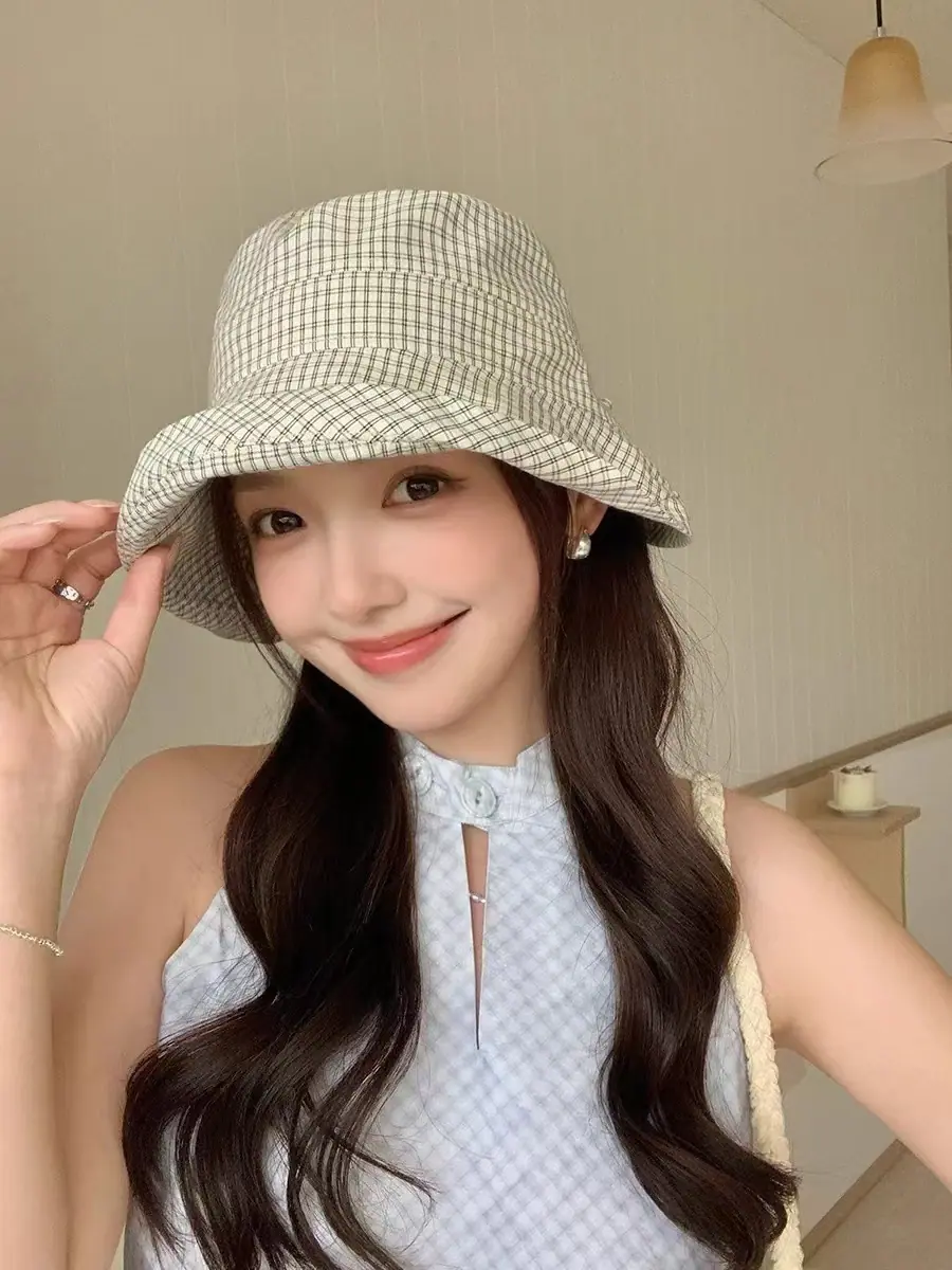 Nuevo Sombrero de Pescador de Cuadros Japoneses para Mujer Primavera Verano Estilo Coreano Ala Ancha Viaje Protección Solar Sombrero de Sol Cara Pequeña Sombrero de Cubo Literario