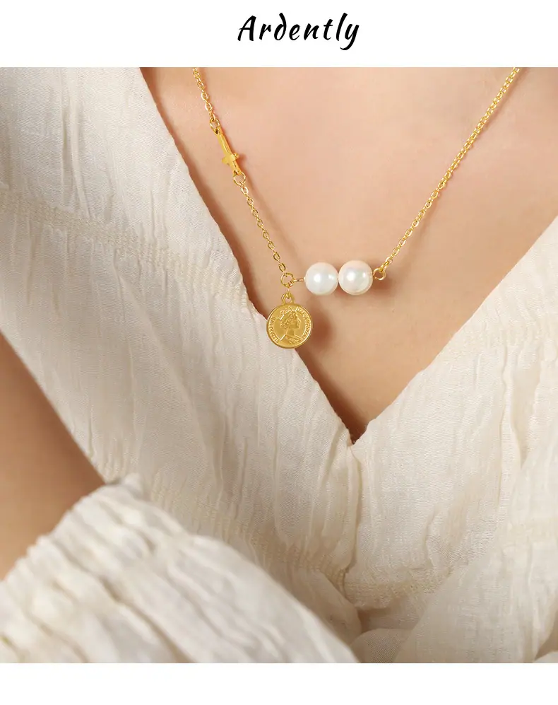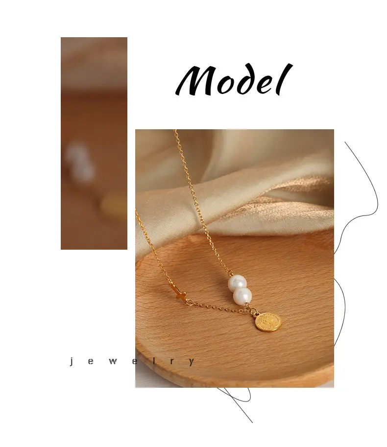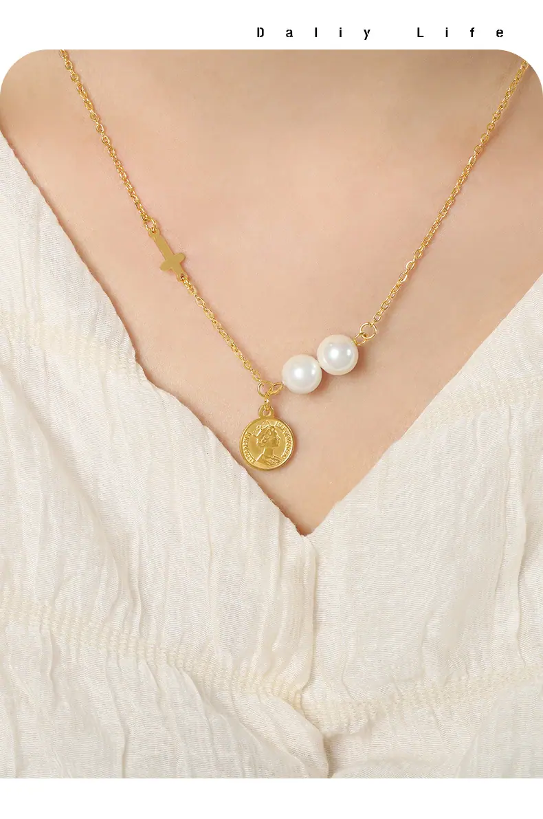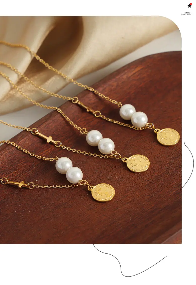 Collar colgante redondo con retrato en relieve a doble cara, accesorios de cruz, cadena de cuentas cosida, acero de titanio, temperamento versátil, cadena para clavícula