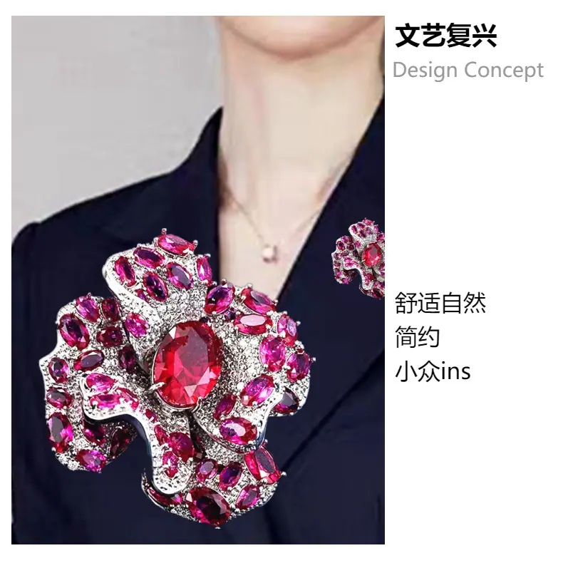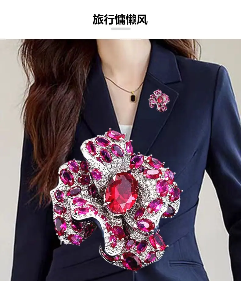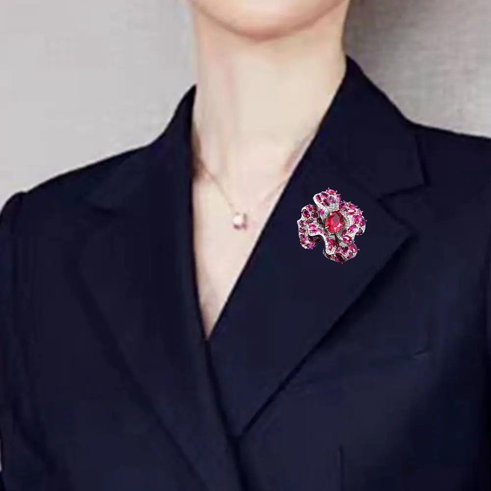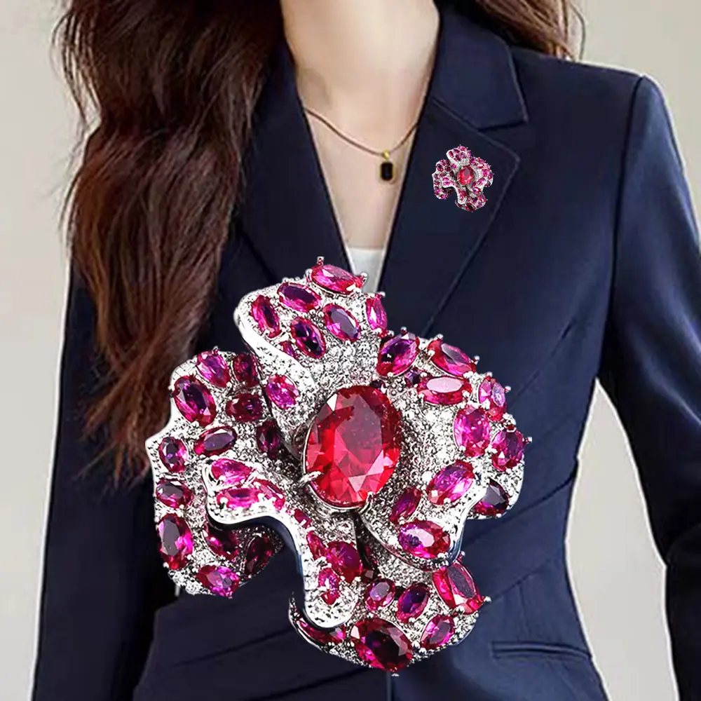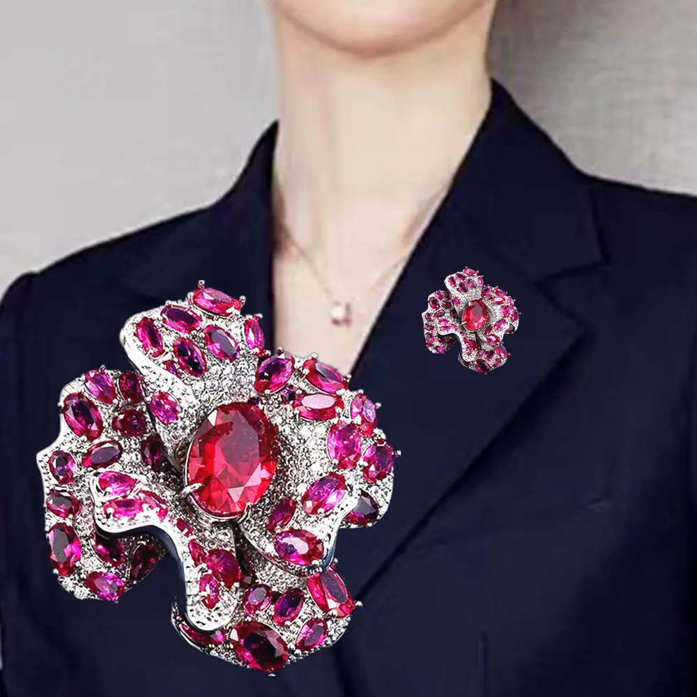 Broche Camelia de Industria Pesada Lujo Ligero de Alta Gama Incrustado Rubí Corindón Rojo Pin Colgante de Doble Uso Accesorio de Ropa Versátil