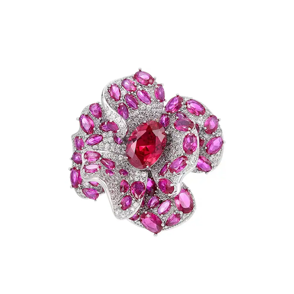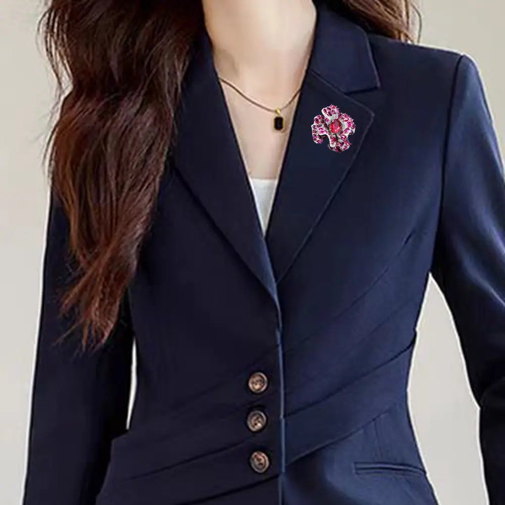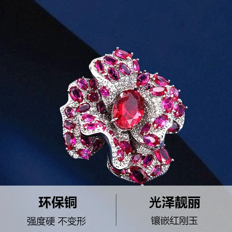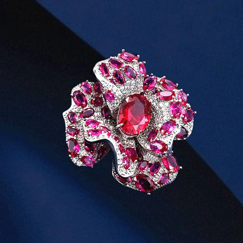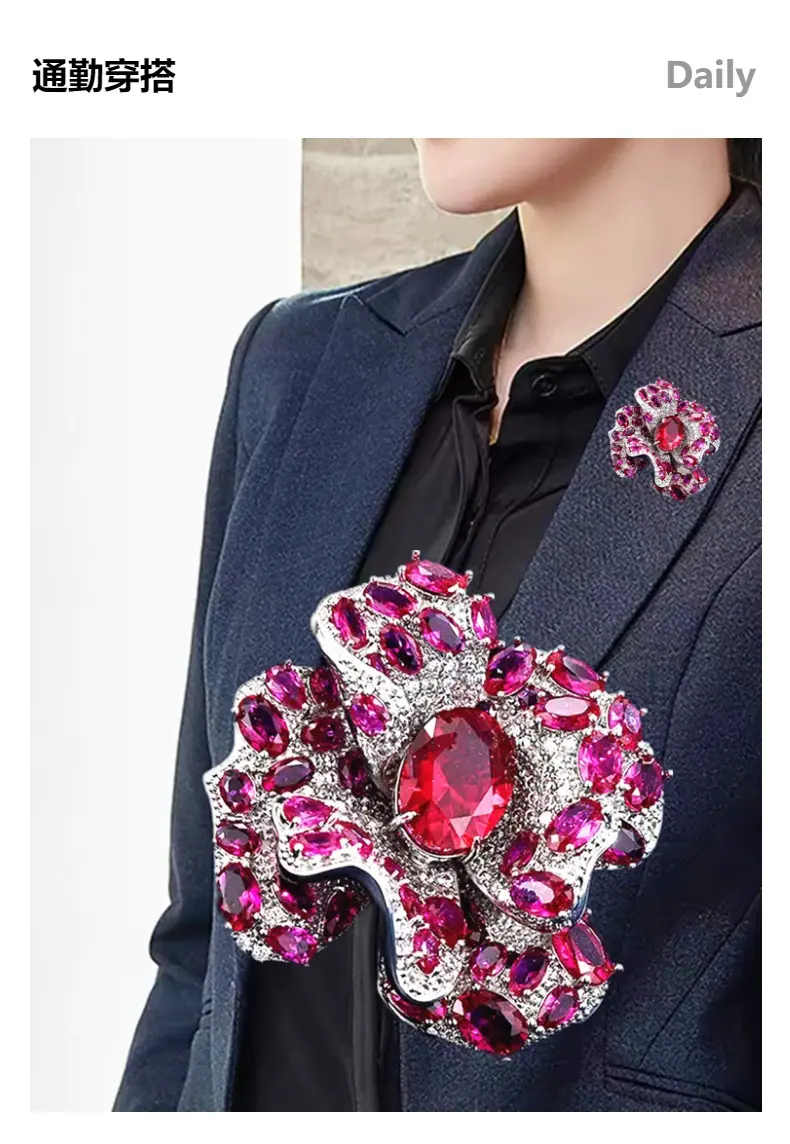 Broche Camelia de Industria Pesada Lujo Ligero de Alta Gama Incrustado Rubí Corindón Rojo Pin Colgante de Doble Uso Accesorio de Ropa Versátil