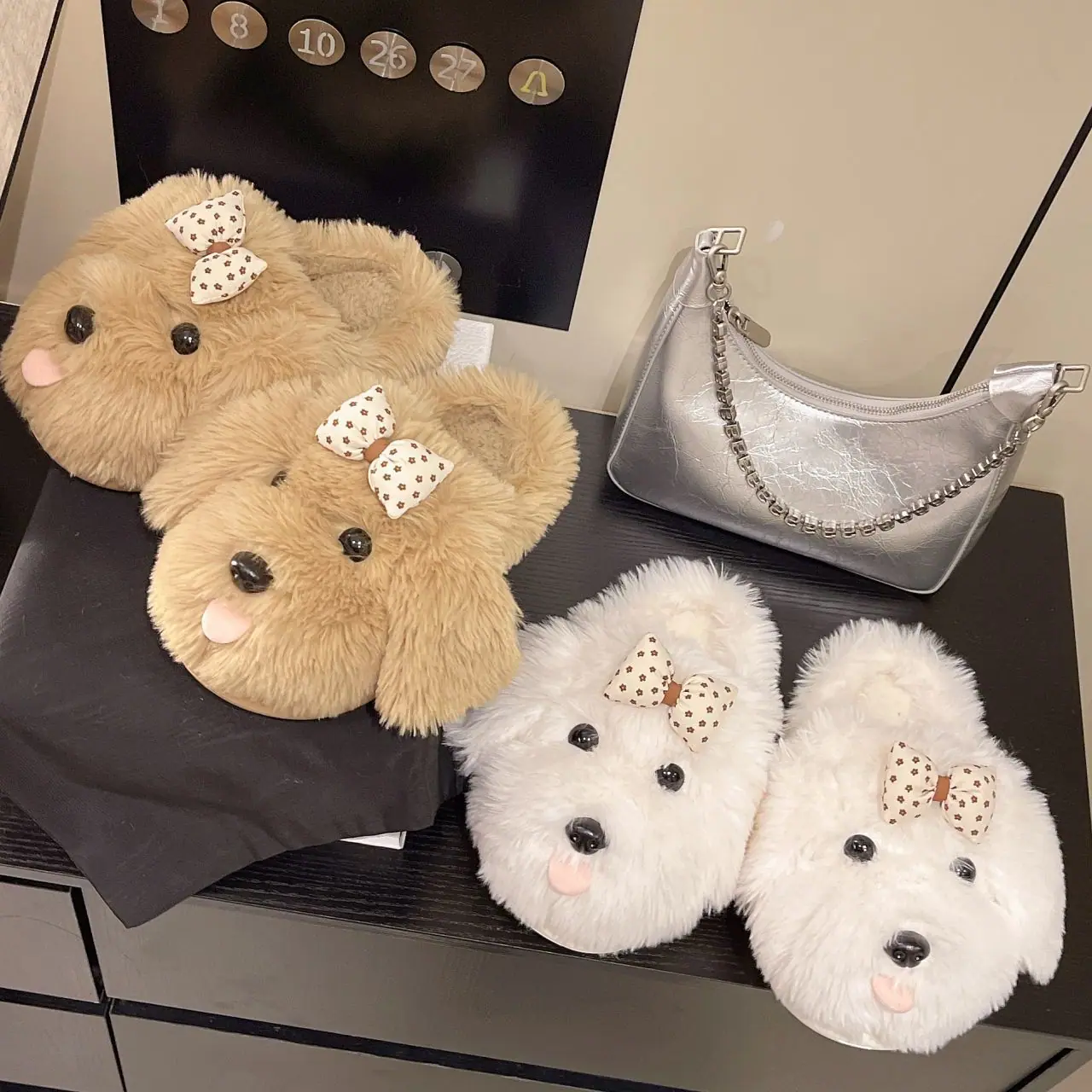 2025 Otoño/Invierno Nueva Ropa Exterior Pantuflas Peludas de Cachorro de Dibujos Animados Lindas Femeninas para Mujer para Casa de Punta Cerrada Medias Pantuflas