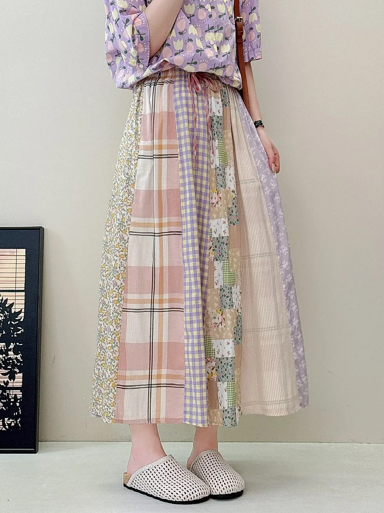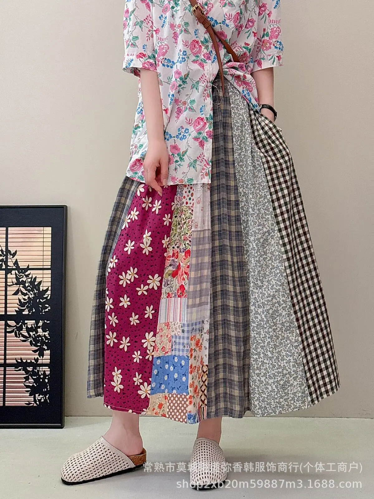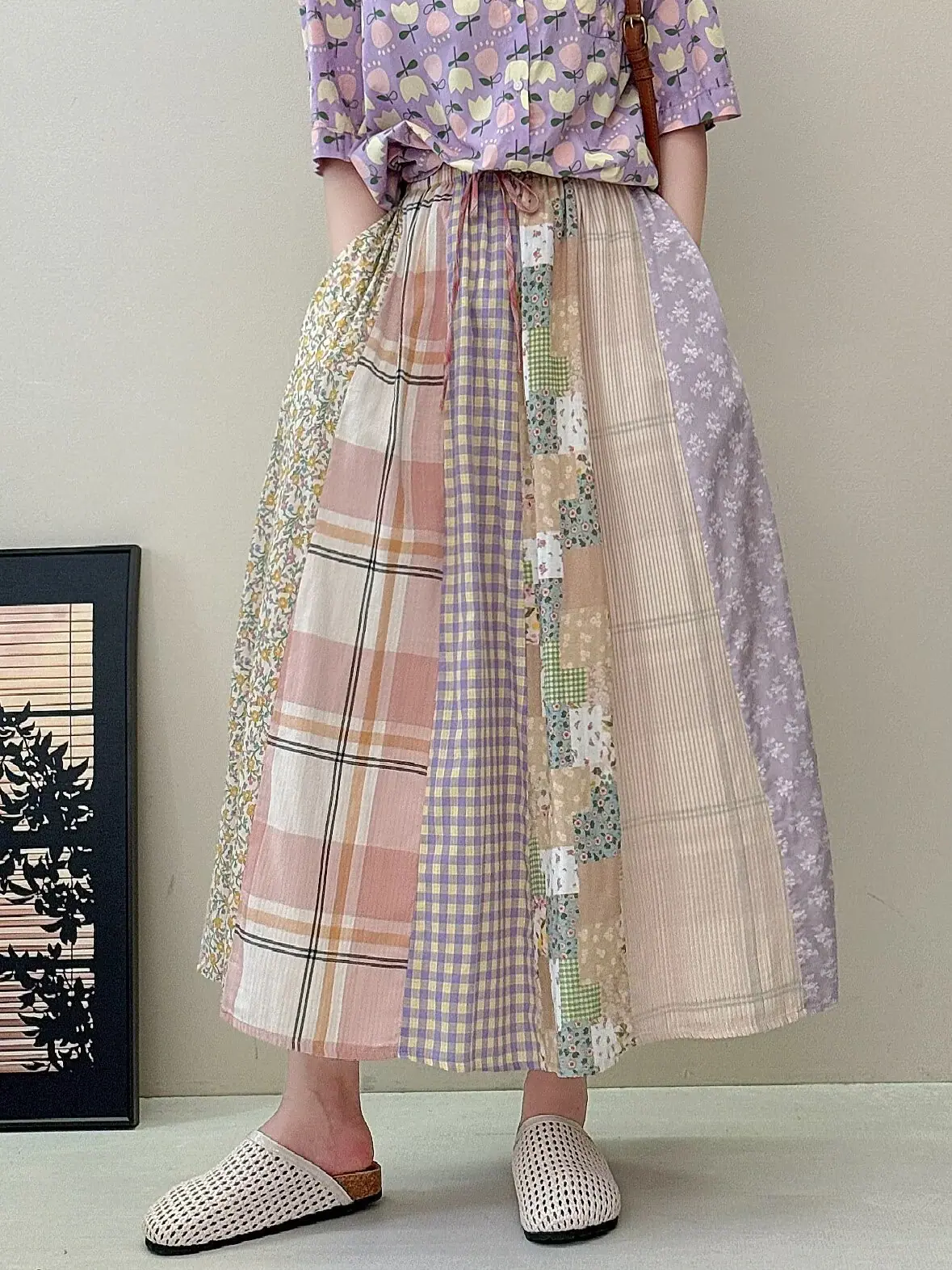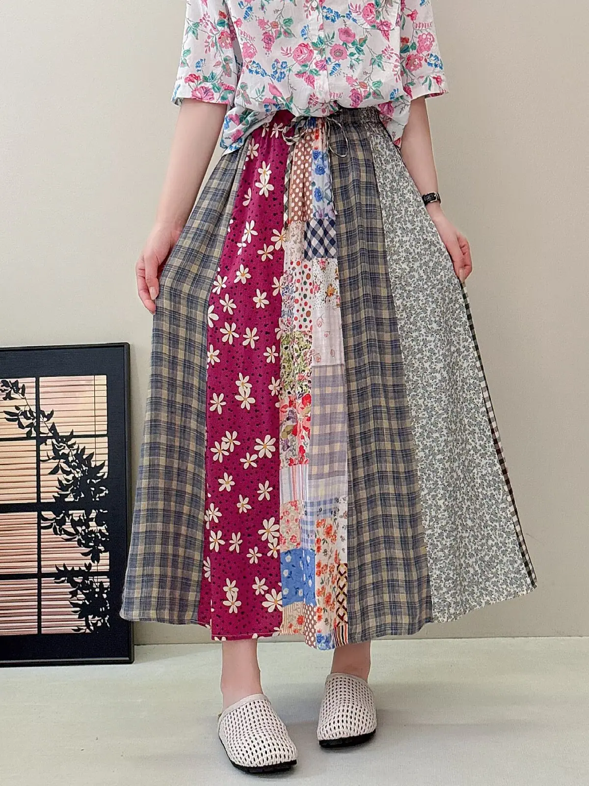 Falda de Algodón y Lino Estilo Japonés Retro Floral Pequeño Cintura Elástica Combinación de Colores Verano Casual Falda Línea A Aspecto Adelgazante