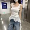 Top de Tirantes Espagueti con Encaje y Dobladillo Irregular para Mujer, Verano, Puro y Sexy, para Interior/Exterior, Ajustado