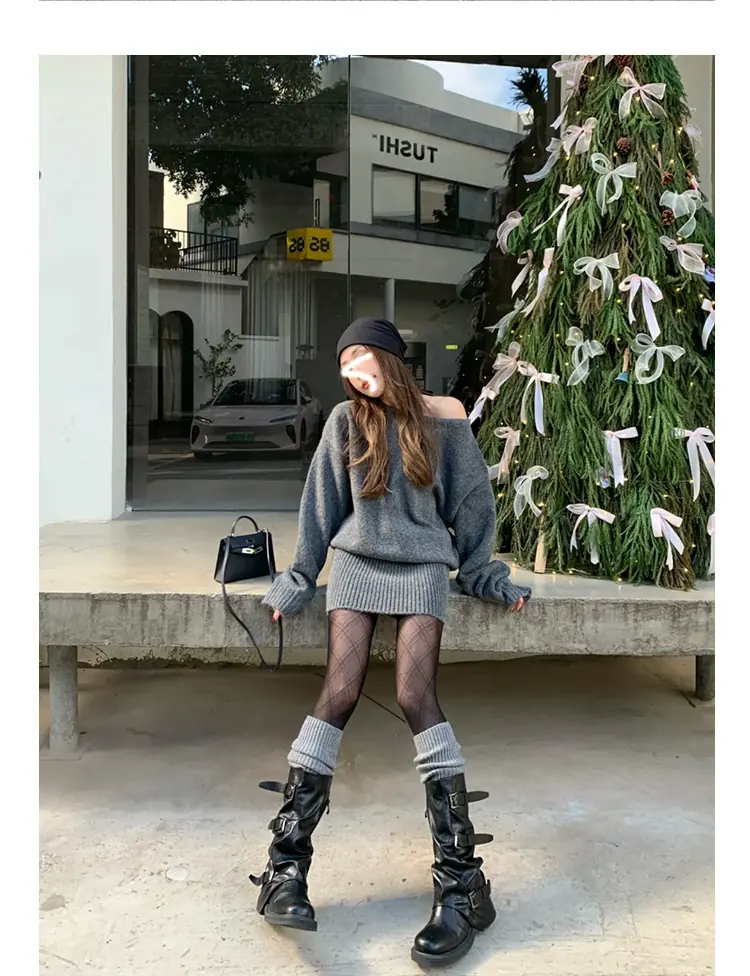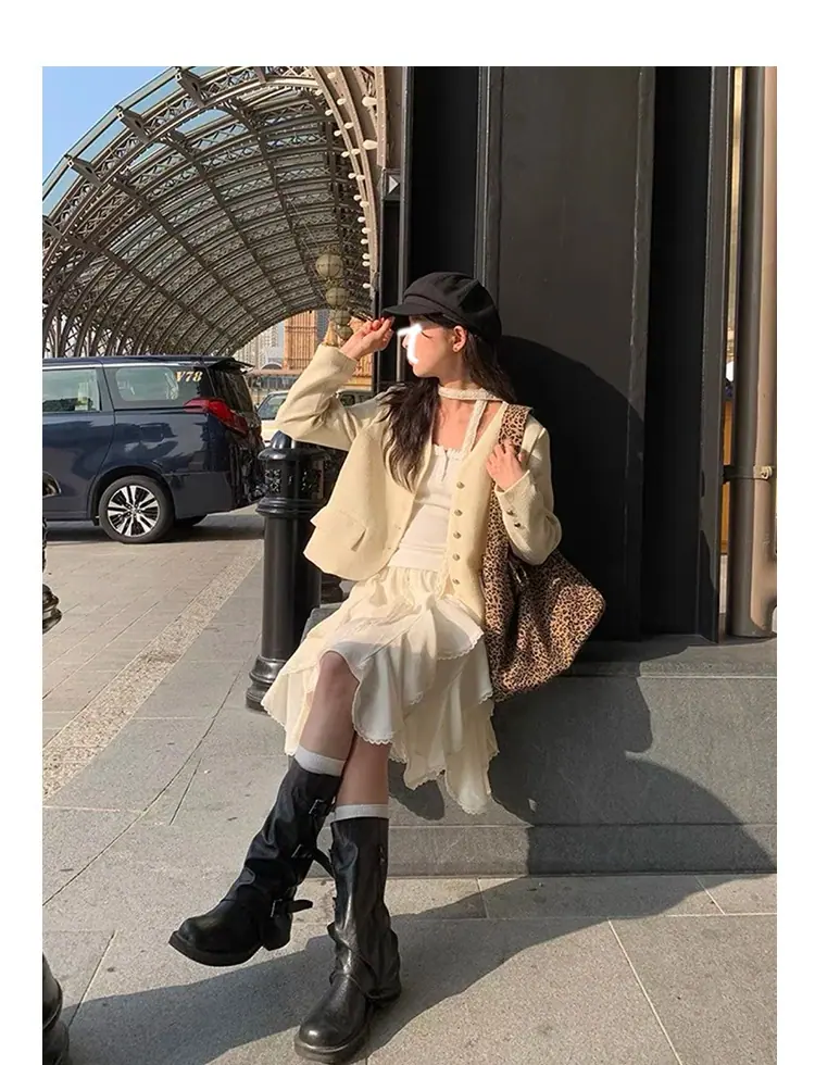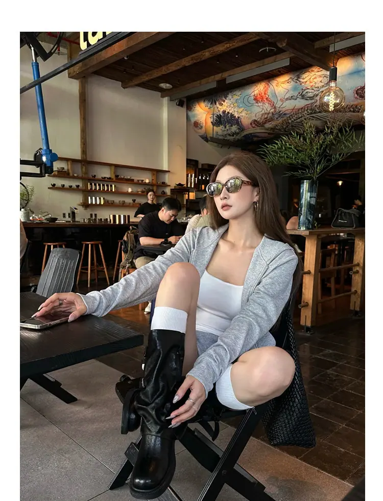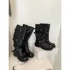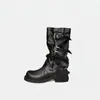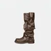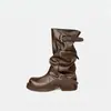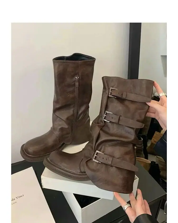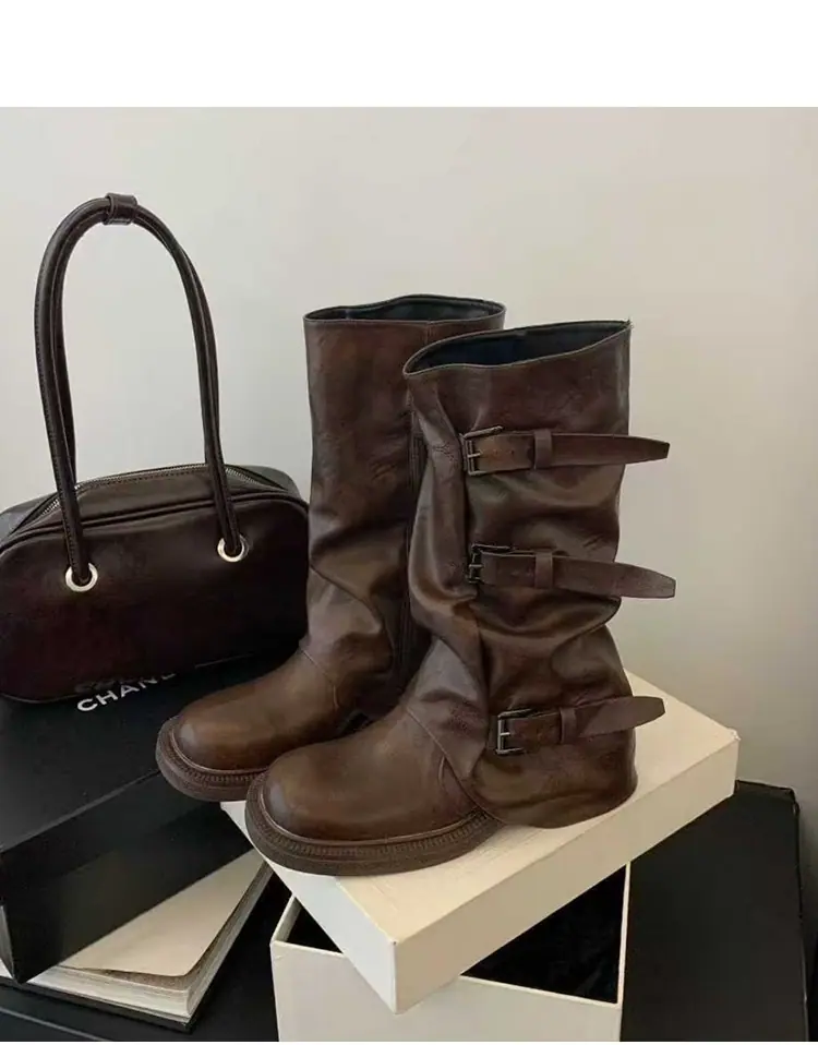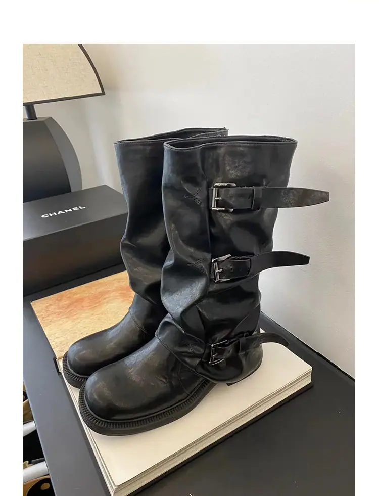Botas hasta la rodilla para mujer 2025 Nuevas Retro Fruncidas Apiladas Hebilla Tacón Chunky Caña Media Bota de Montar de Caña Alta