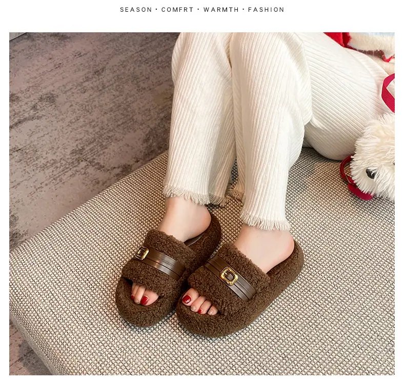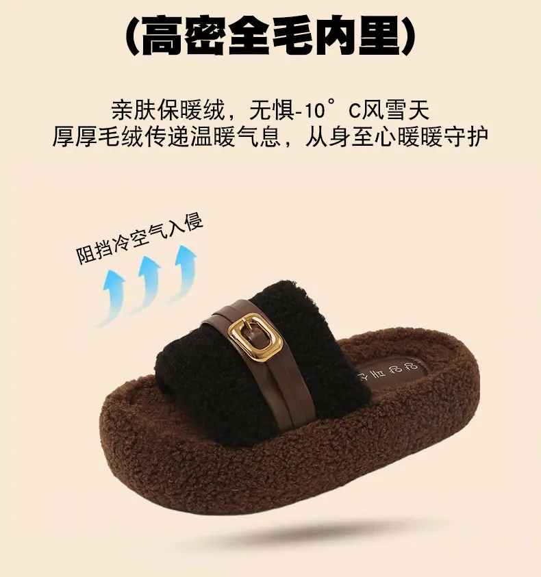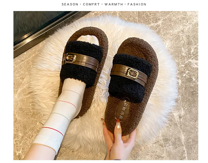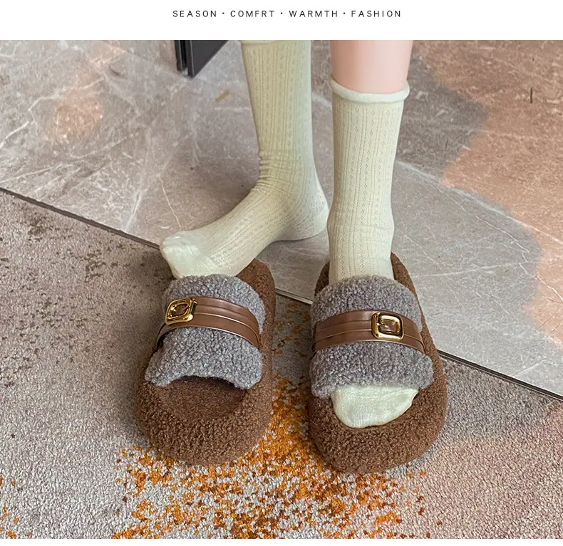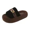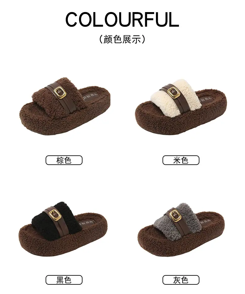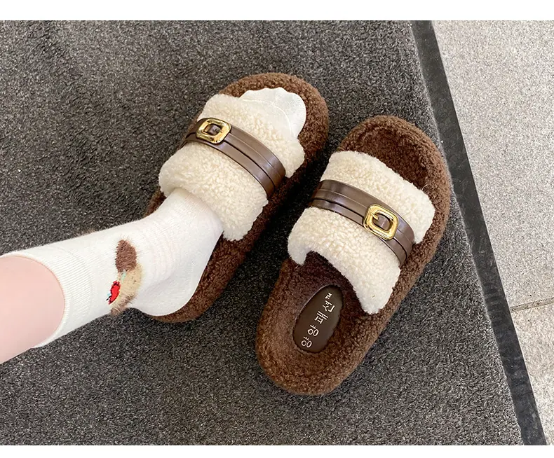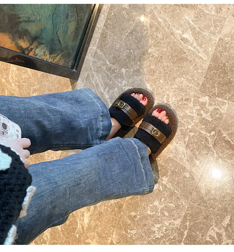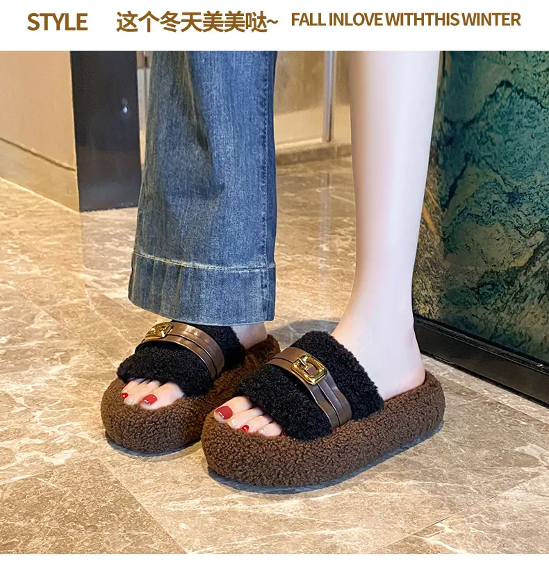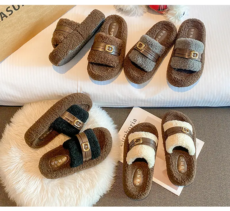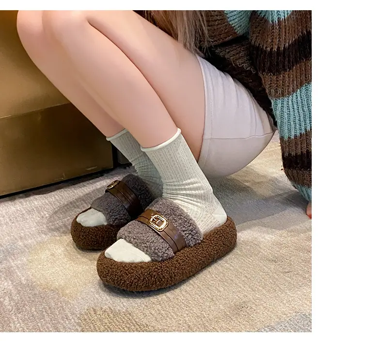 Pantuflas Peludas de Fondo Grueso Estilo Coreano para Mujer para Exterior 2025 Otoño/Invierno Nuevas Cómodas de Moda Versátiles de Algodón con Una Tira para Mujer