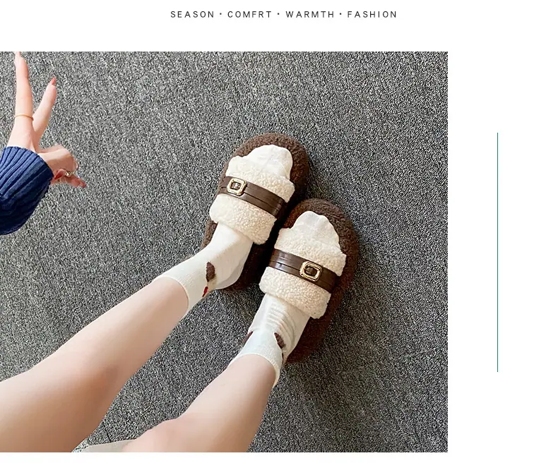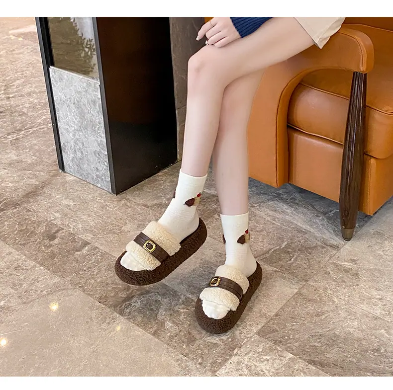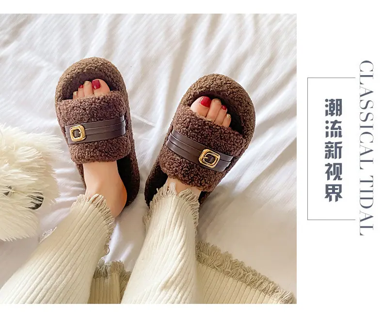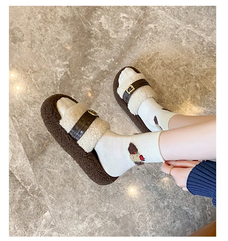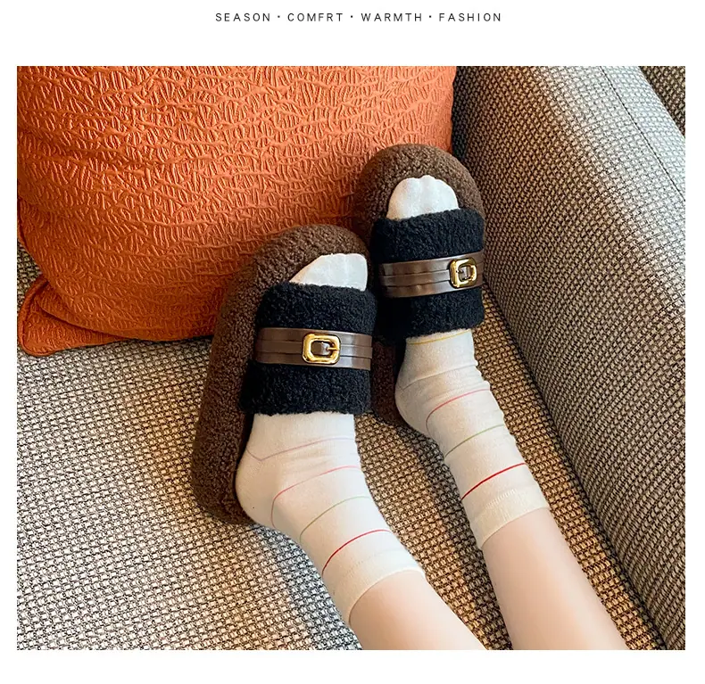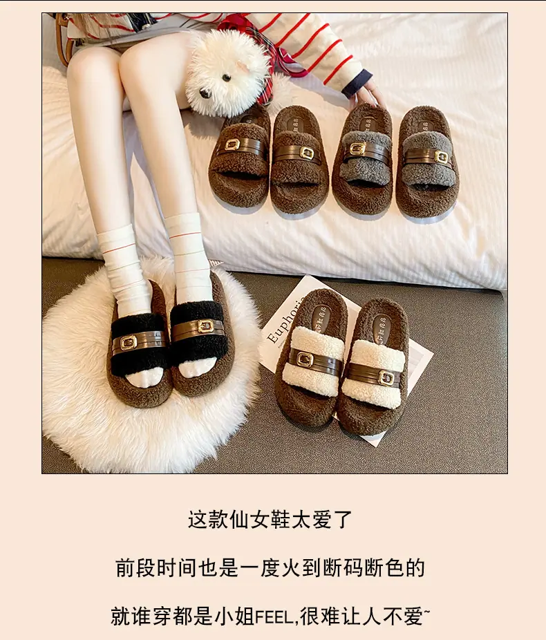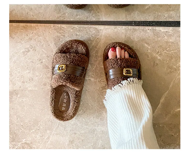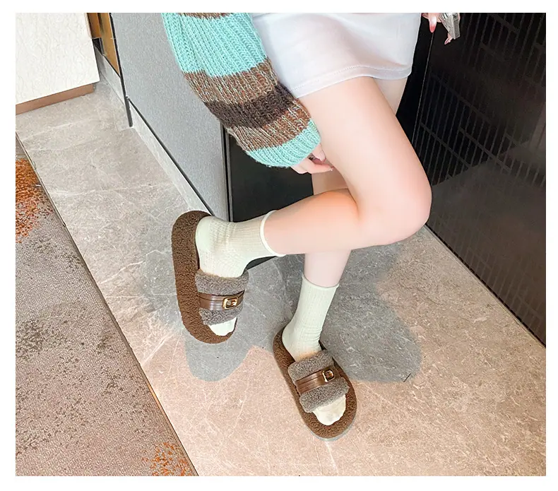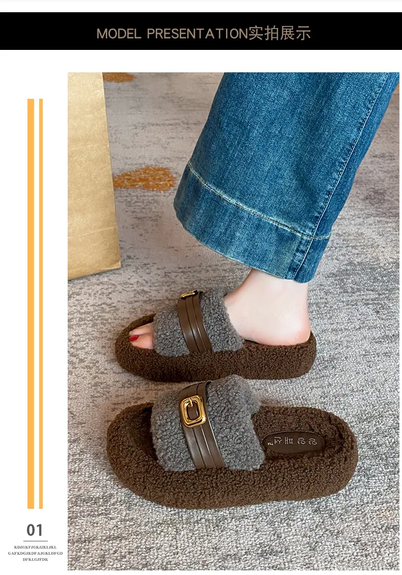 Pantuflas Peludas de Fondo Grueso Estilo Coreano para Mujer para Exterior 2025 Otoño/Invierno Nuevas Cómodas de Moda Versátiles de Algodón con Una Tira para Mujer
