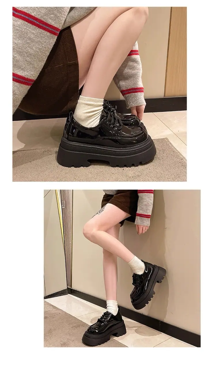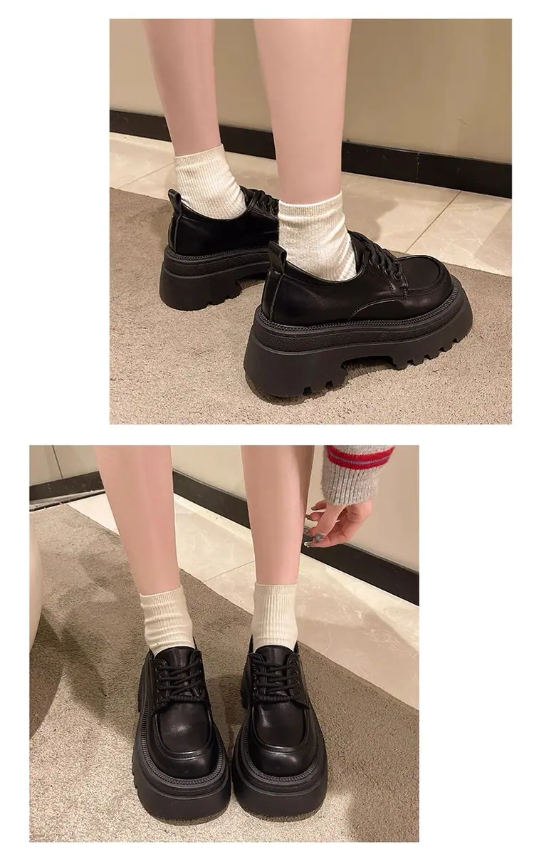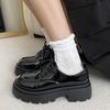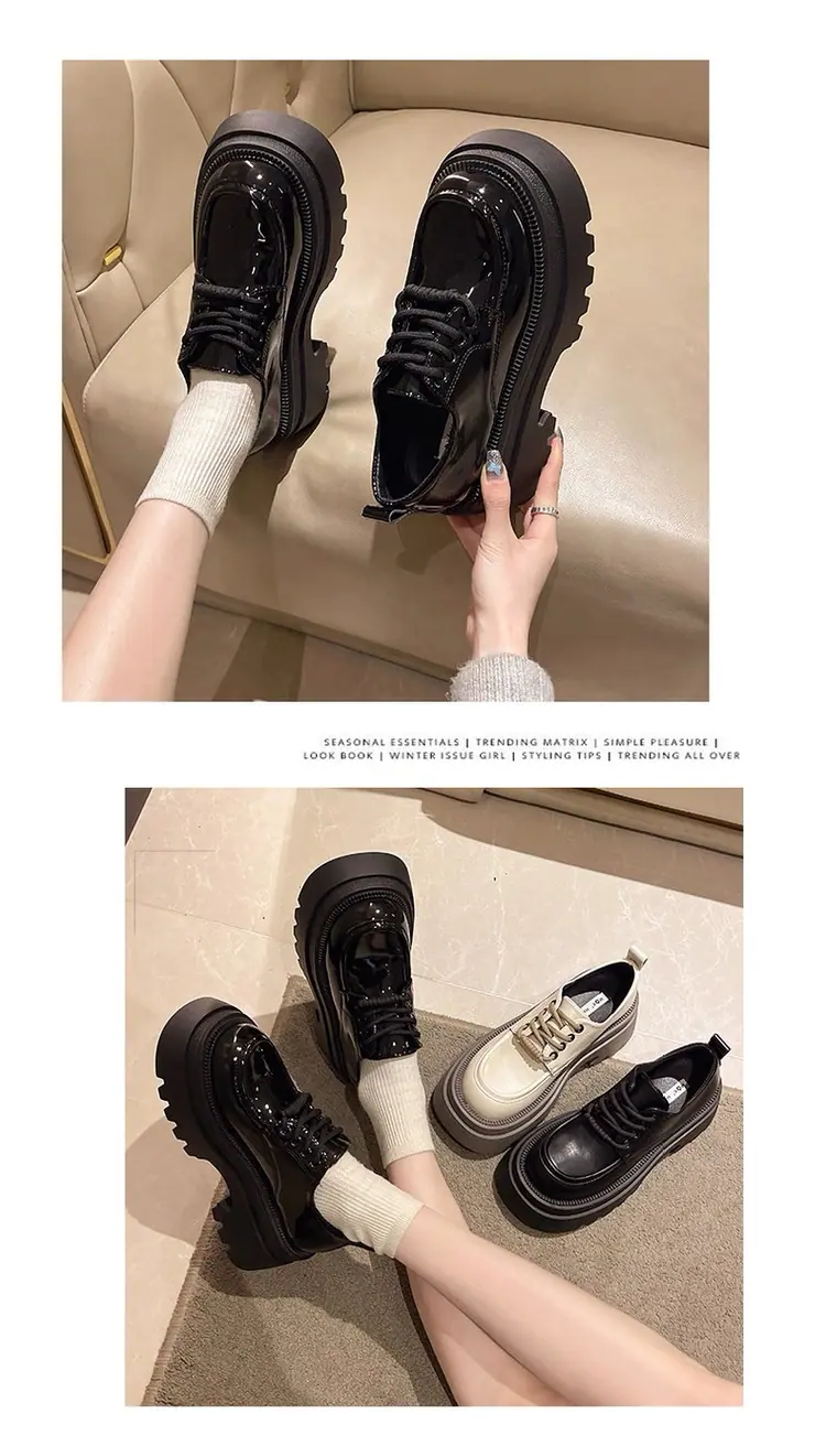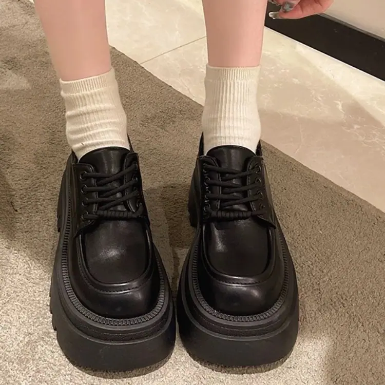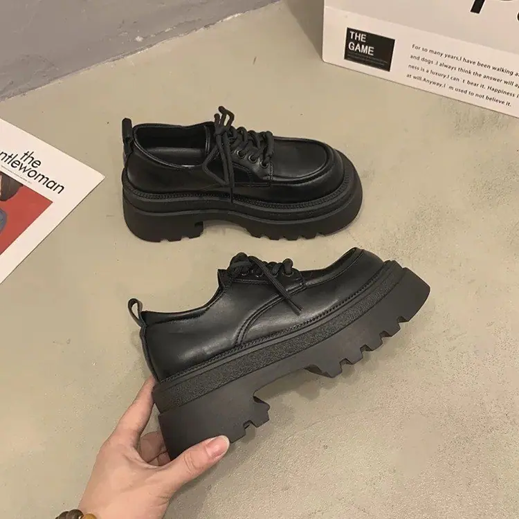 Zapatos de cuero negros de mujer con cordones y suela gruesa pequeña, otoño 2025, nuevos, retro, versátiles, estilo británico, mocasines con plataforma