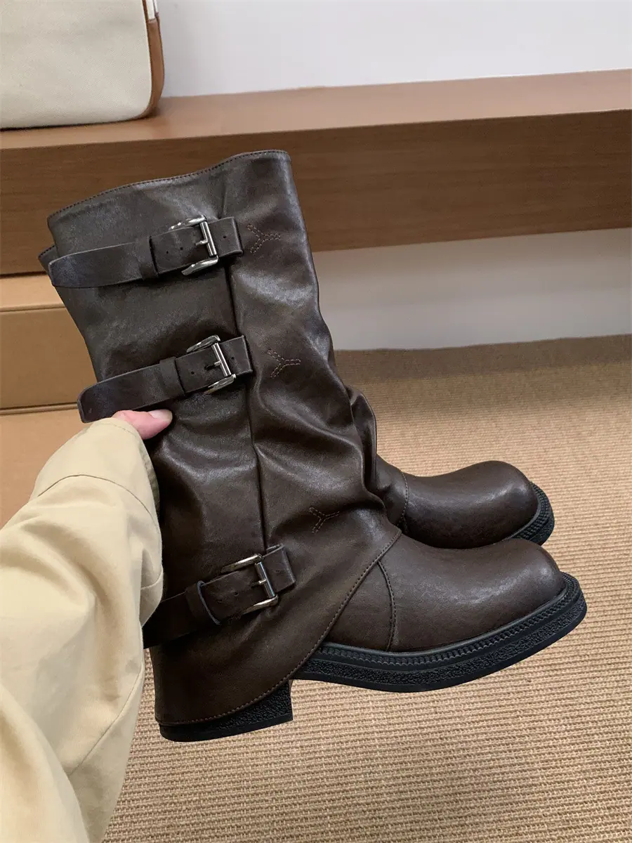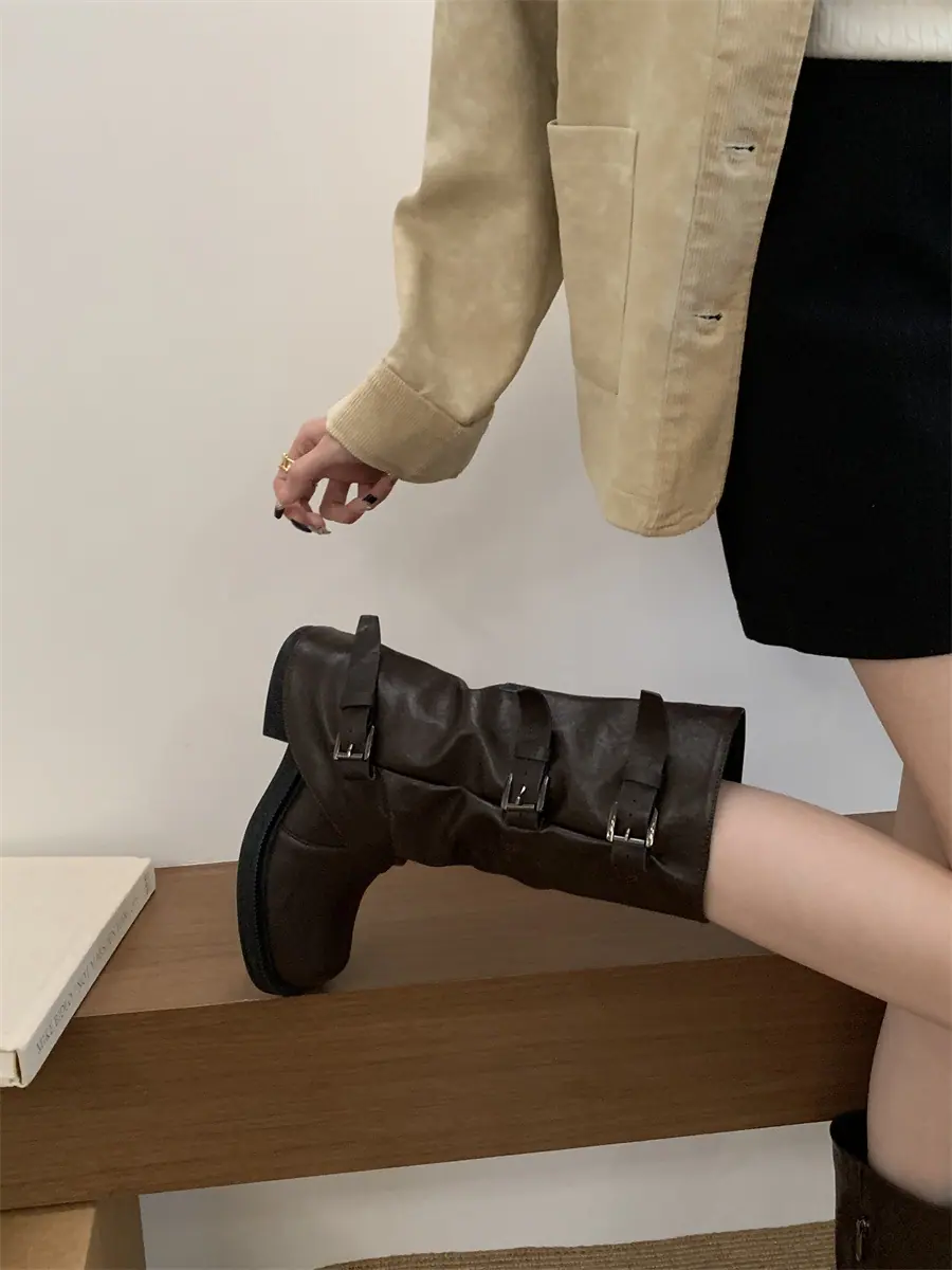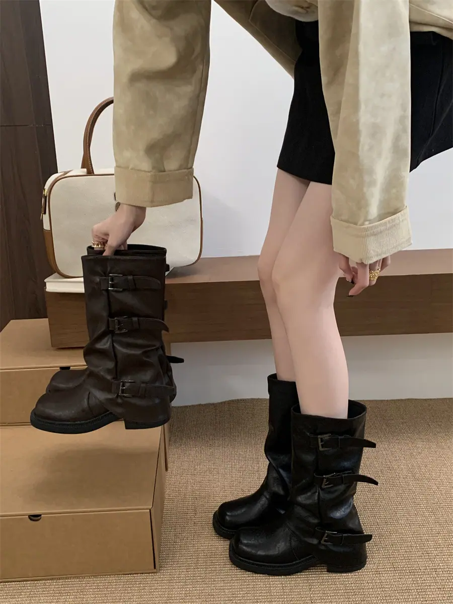 Botas Retro de Tacón Grueso de Media Caña Vaqueras del Oeste Apiladas Botas de Jinete Otoño Temprano Botas Martin Botas Francesas para Mujer