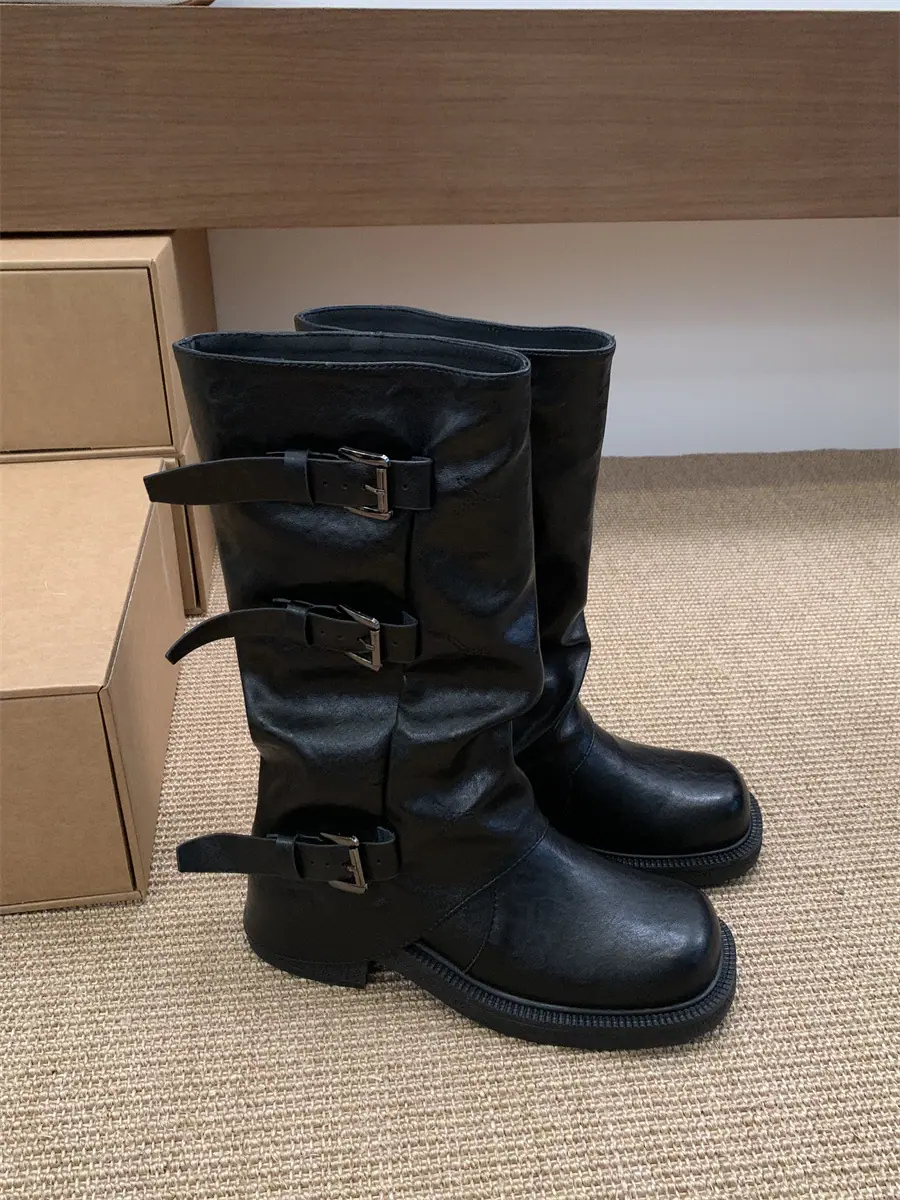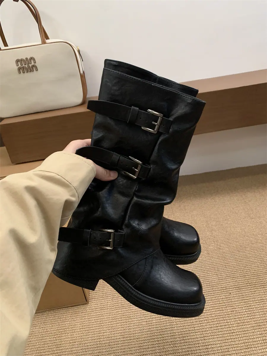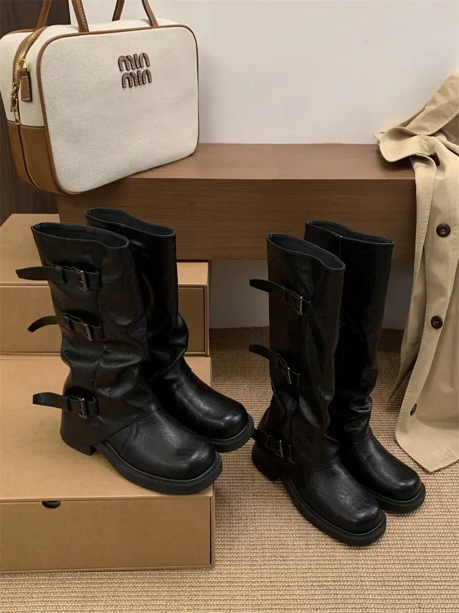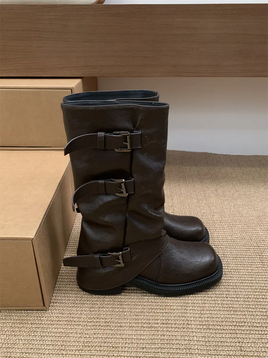 Botas Retro de Tacón Grueso de Media Caña Vaqueras del Oeste Apiladas Botas de Jinete Otoño Temprano Botas Martin Botas Francesas para Mujer
