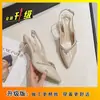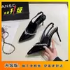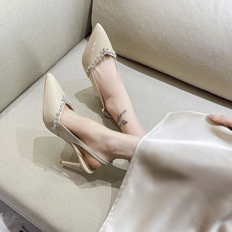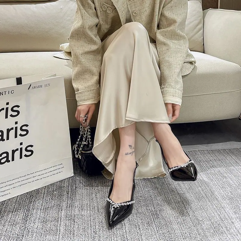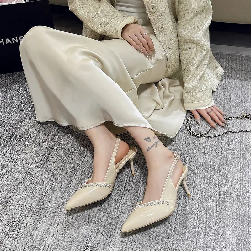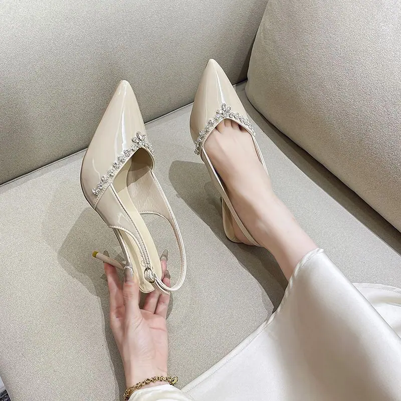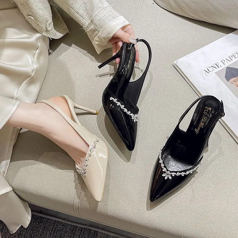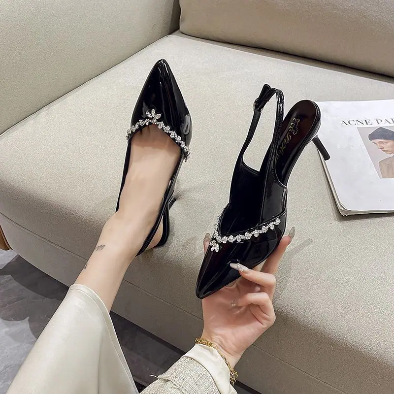 Tacones Altos Slingback de Punta con Pedrería de Estilo Maduro Negro, Sandalias Versátiles Cómodas con Temperamento para Mujer, Primavera/Verano 2025 Nuevo