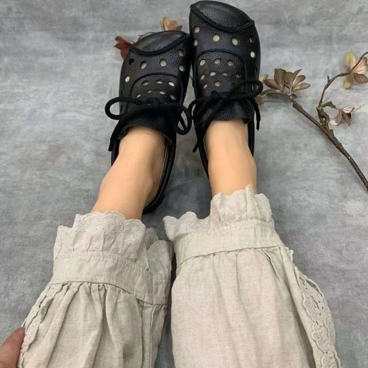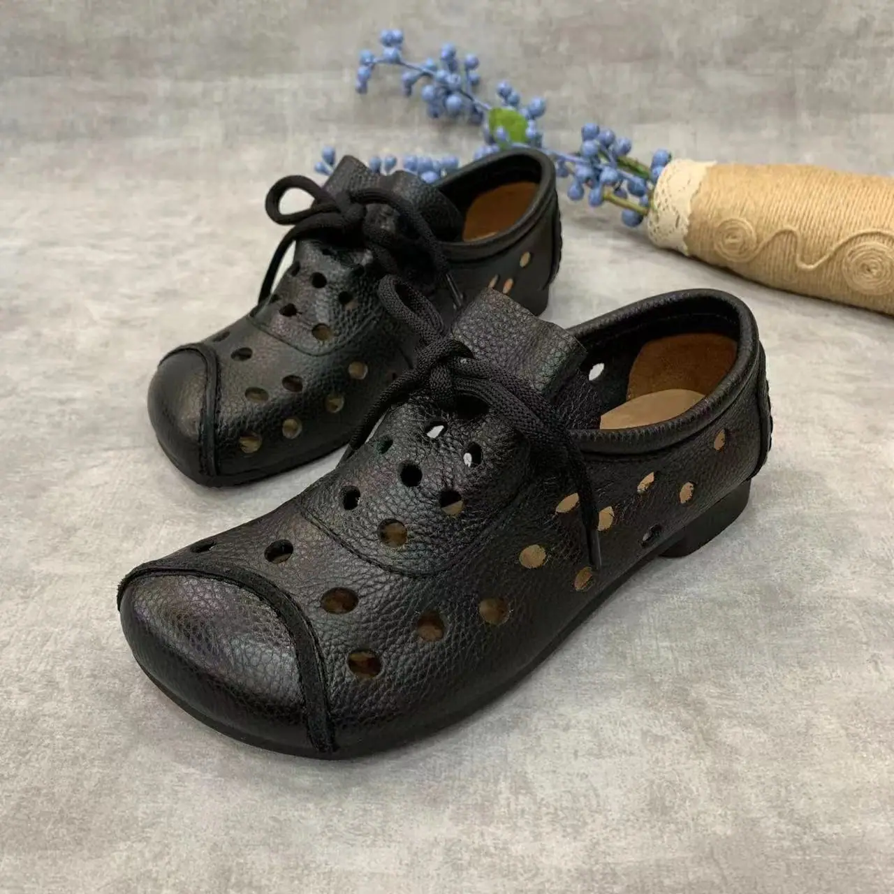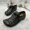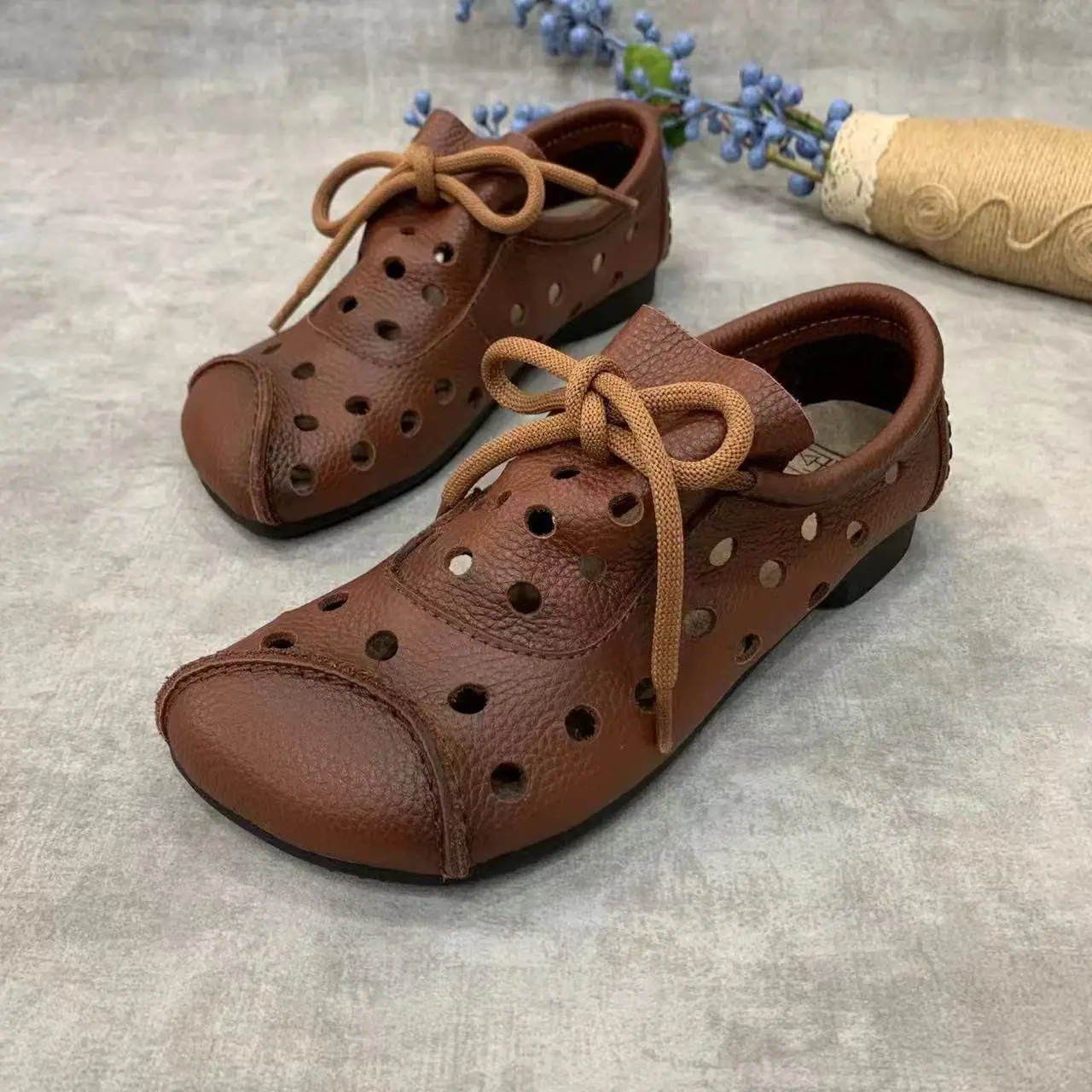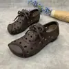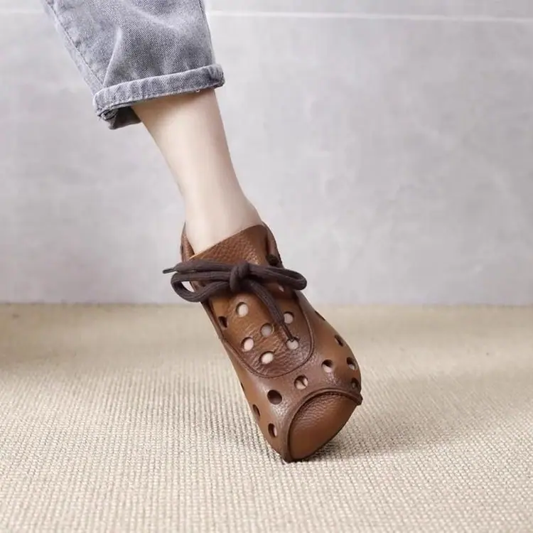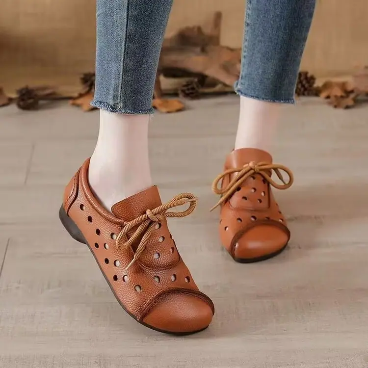 Zapatos individuales de otoño 2025 retro de punta redonda para mujer, verano nuevo, para mediana edad y ancianas, cómodos, de suela suave, zapatos de madre con agujero hueco